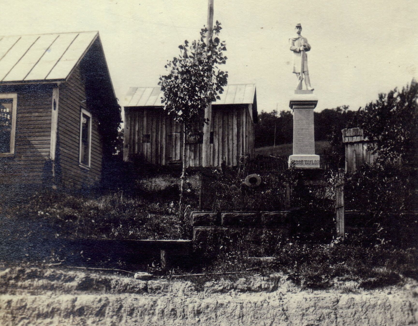 SOURCE CITATION: Jesse Taylor Memorial at its original location in Jollytown, Gilmore Township, Greene County, Pennsylvania; item no. THOM0002, Meighen Series, Helen Lee (Garrison) Thompson Collection, Greene Connections Archives Project (www.GreeneConnections.com).