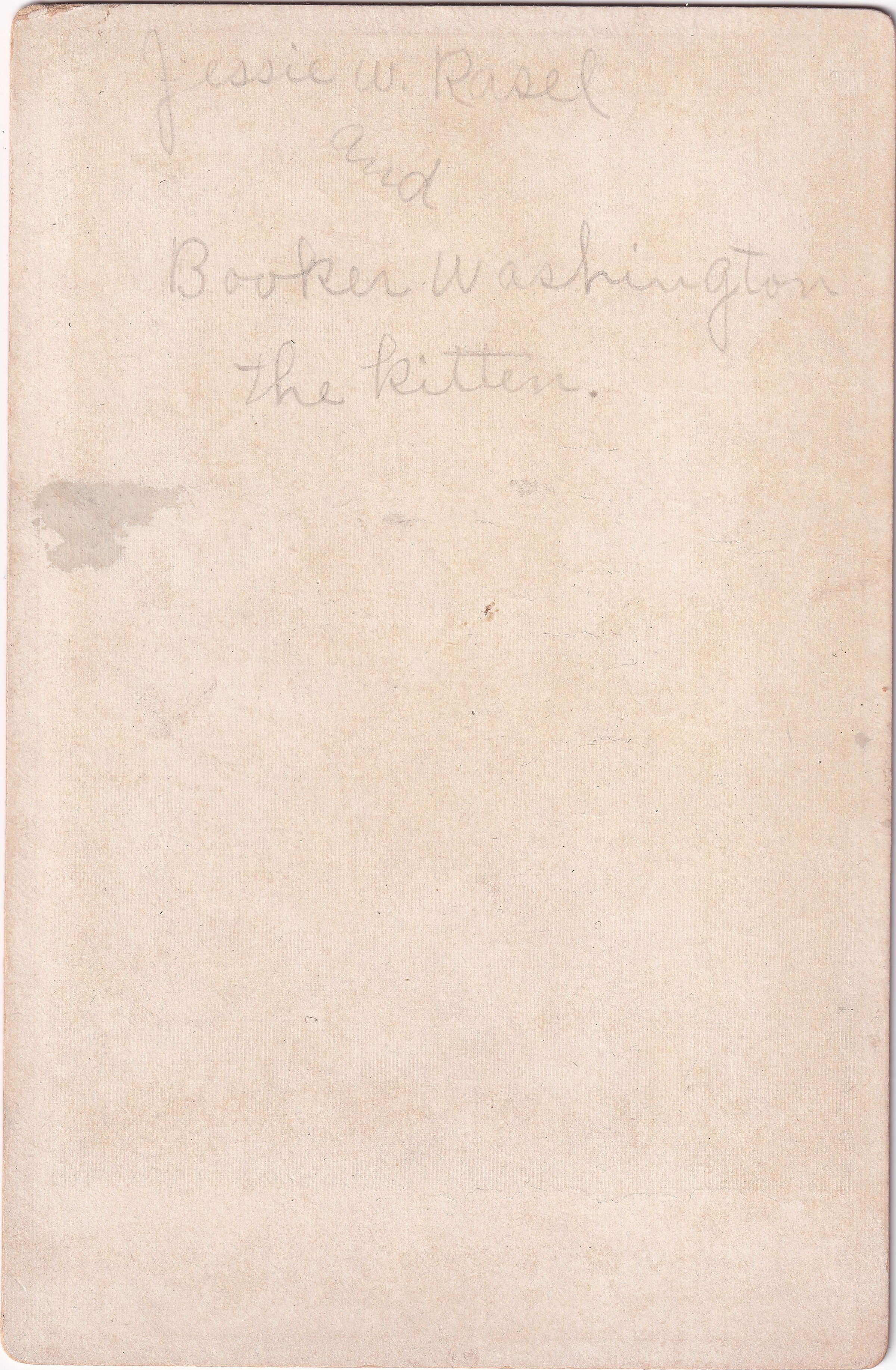 Handwritten inscription on back of image reads, "Jessie W. Rasel and Booker Washington the kitten."