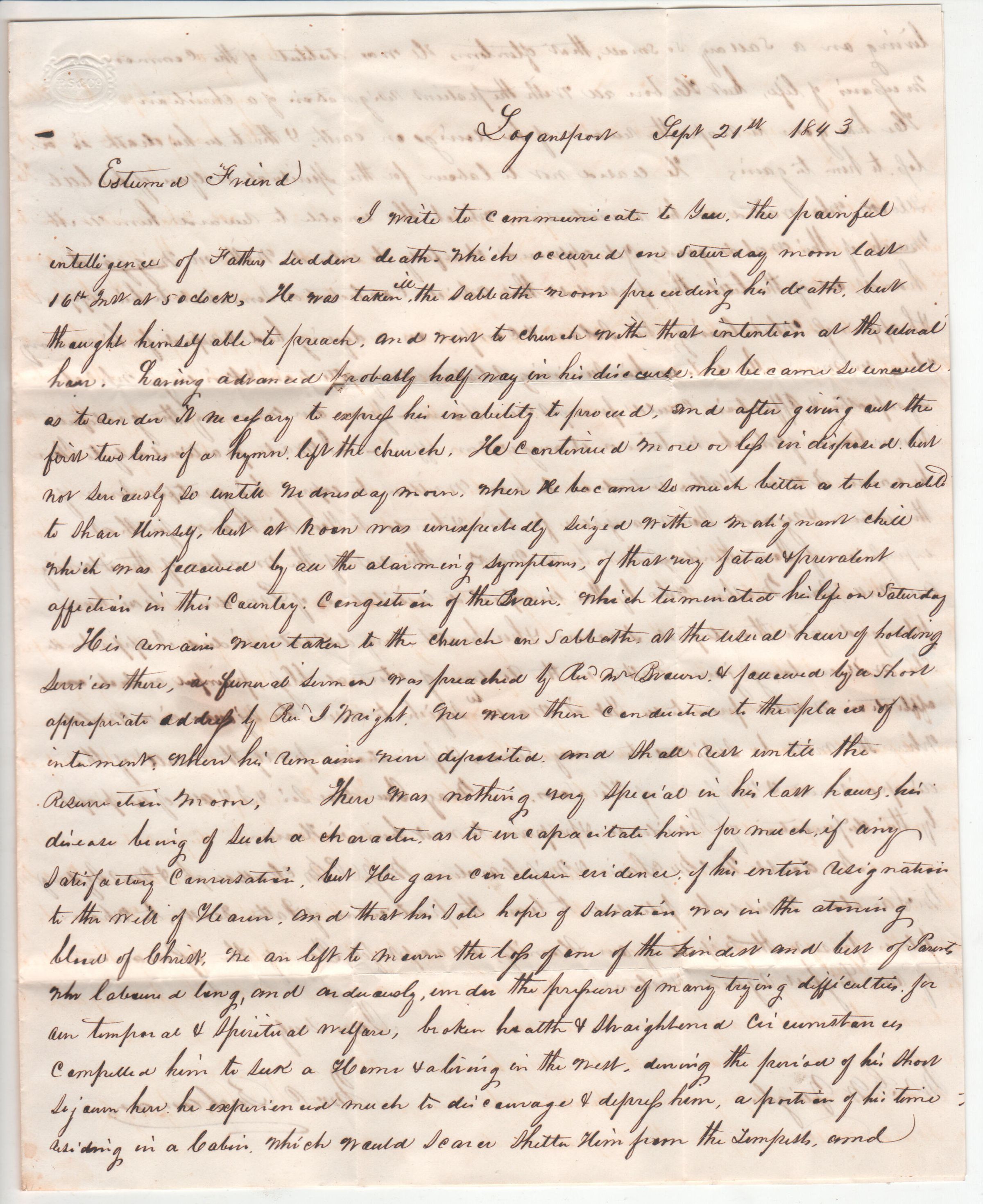 I write to communicate to you, the painful intelligence of Father's sudden death, which occurred on Saturday morn last 16th at 5 o'clock. He was taken ill the Sabbath morn preceding his death, but thought himself able to preach, and went to church with that intention at the usual hour. Having advanced probably halfway in his discourse, he became so unwell as to [words hard to read] to express his inability to proceed, and after giving out the first two lines of a hymn, left the church. He continued more or less indisposed, but not seriously so until Wednesday morn, when he became so much better as to be [words hard to read] himself, but at noon was unexpectedly seized with a malignant chill which was followed by all the alarming symptoms, of that very fatal [word hard to read] affection in this country, congestion of the brain, which terminated his life on Saturday.