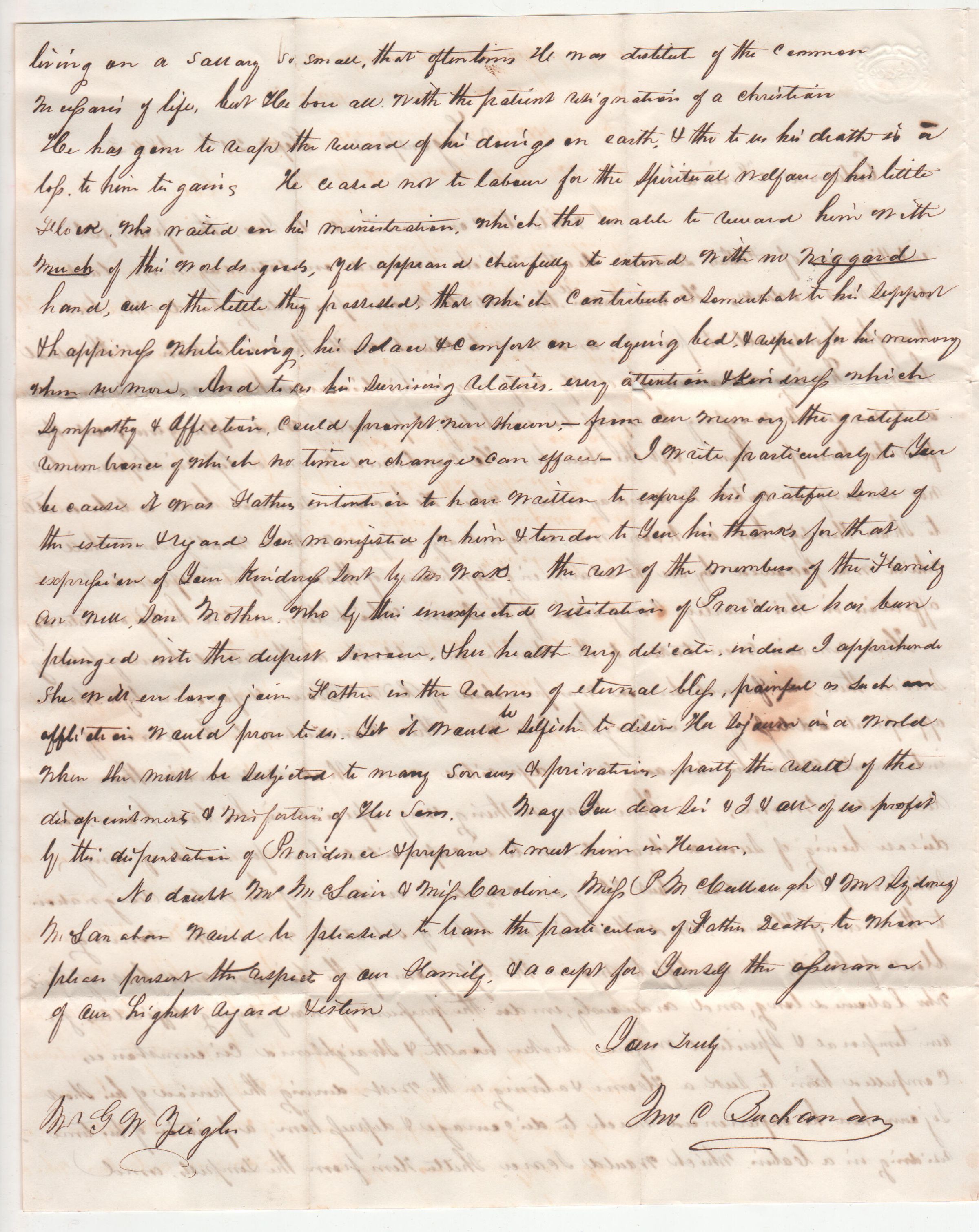 No doubt [Wm. ?] McClain & wife Caroline, Miss [I. ?] McCullough & [name hard to read] would be pleased to hear the particulars of Father's death, to whom please present the respect of our family & accept for yourself the assurance of our highest regard & esteem.
