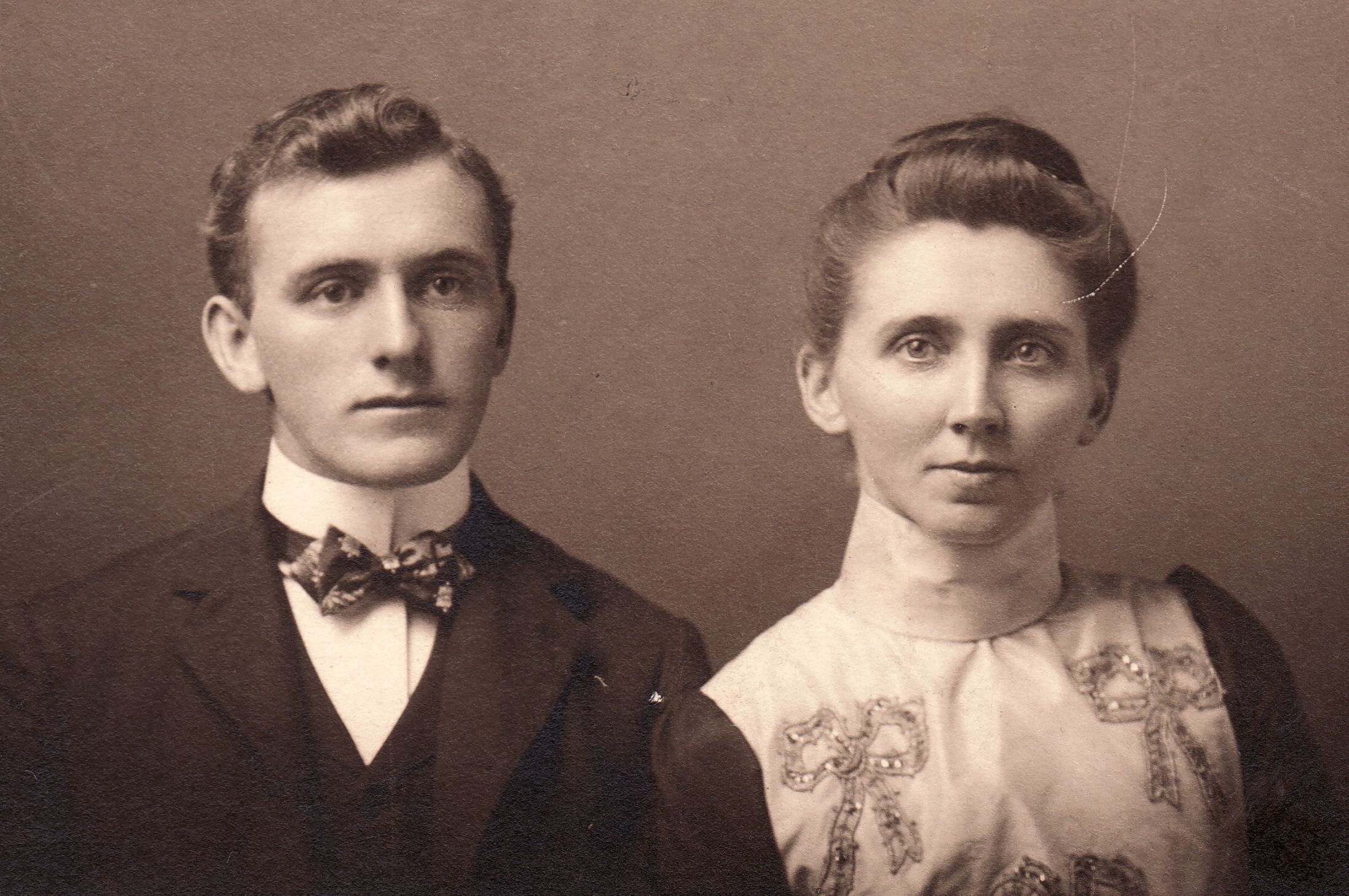 SOURCE CITATION: Joel Freeman Byers [1878-1943] and his wife, Anna "Annie" (Cowell) Byers [1879-1959]; circa 1900, image by McLeonard, Uniontown, Pa.; item no. WHET_AN001_0001_0006, Robert Dewayne and Margery Ellen (Moore) Whetzel Collection, Greene Connections Archives Project (GreeneConnections.com).