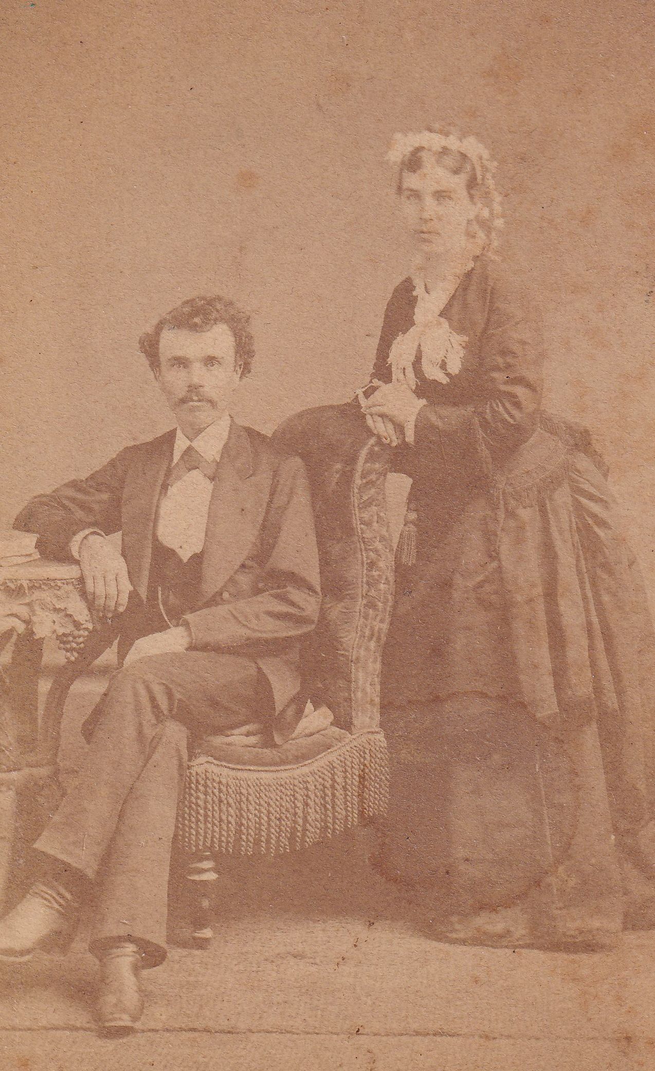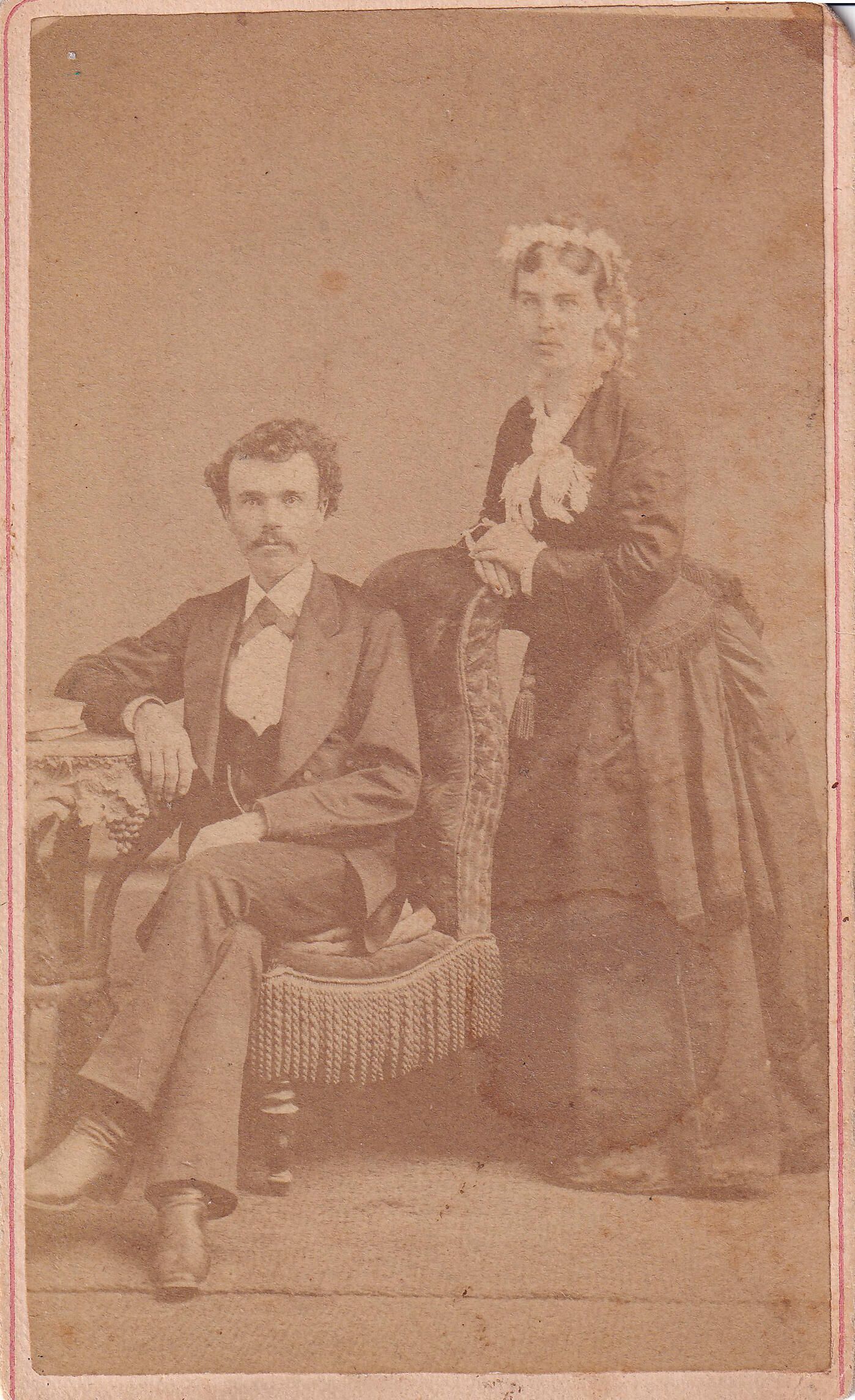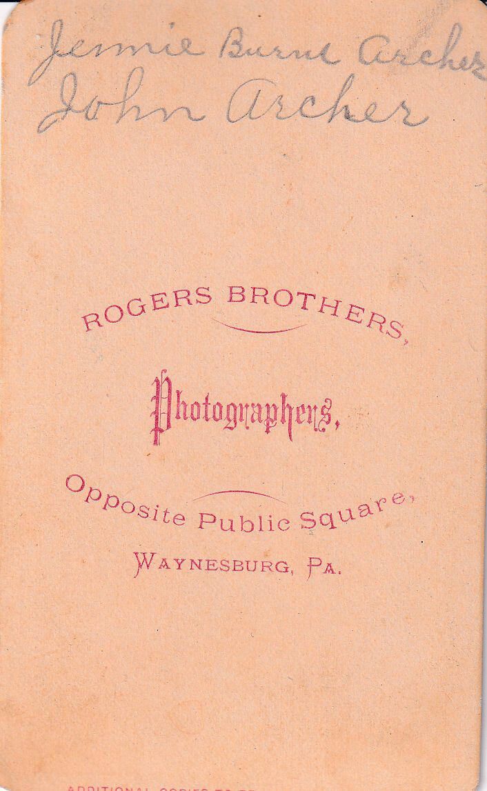 Source Citation: John Calvin Archer [1844-1918] and his wife, Sarah Jane "Jennie" (Burns) Archer [1852-1902]; circa 1870-1880, image by Rogers Brothers, Photographers, Opposite Public Square, Waynesburg, Pa.; item no. AULD-AN007-0001, Burns Series, Pratt-Auld Collection, shared by Julia Kathryn Johnson, Greene Connections Archives Project (GreeneConnections.com).