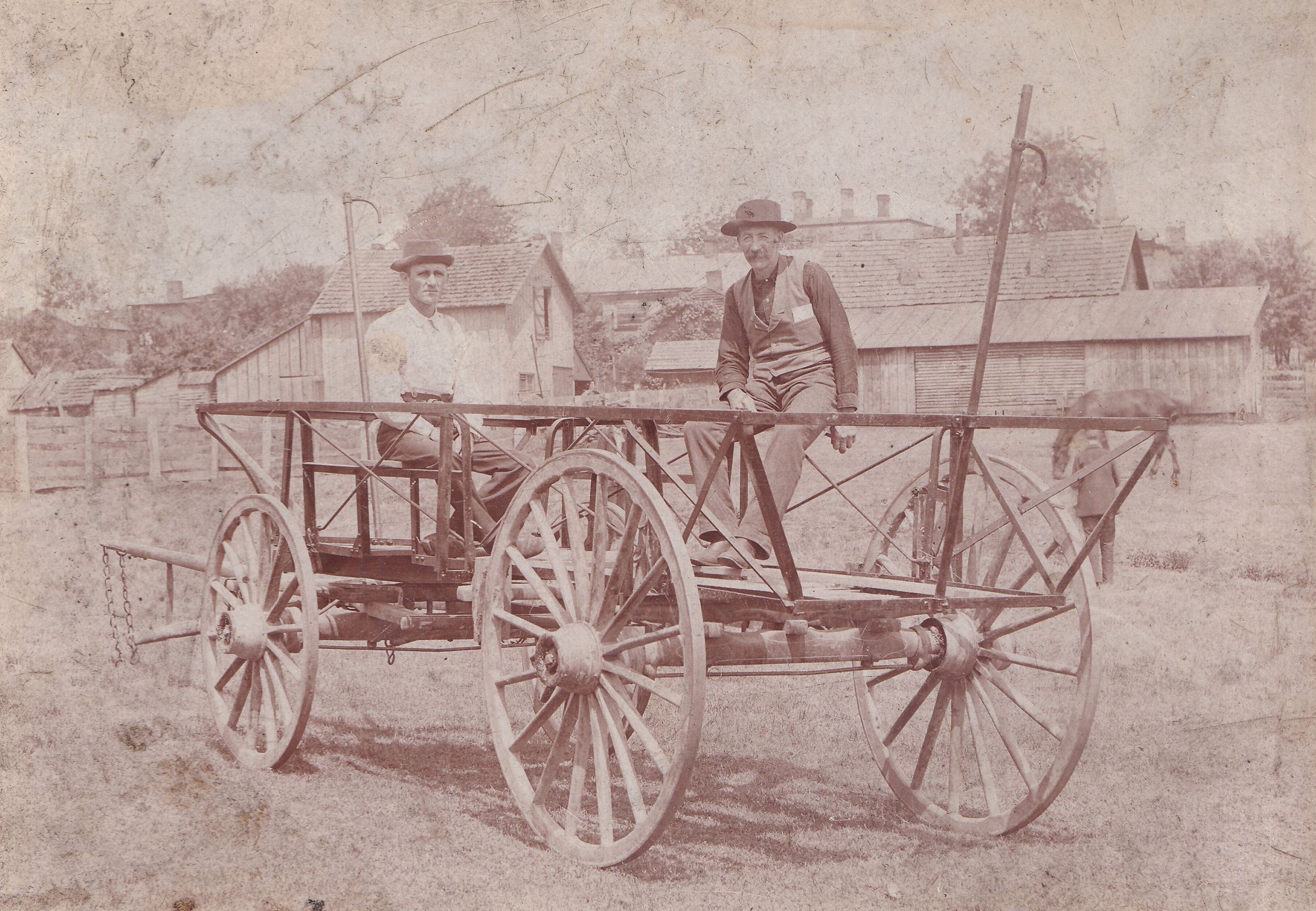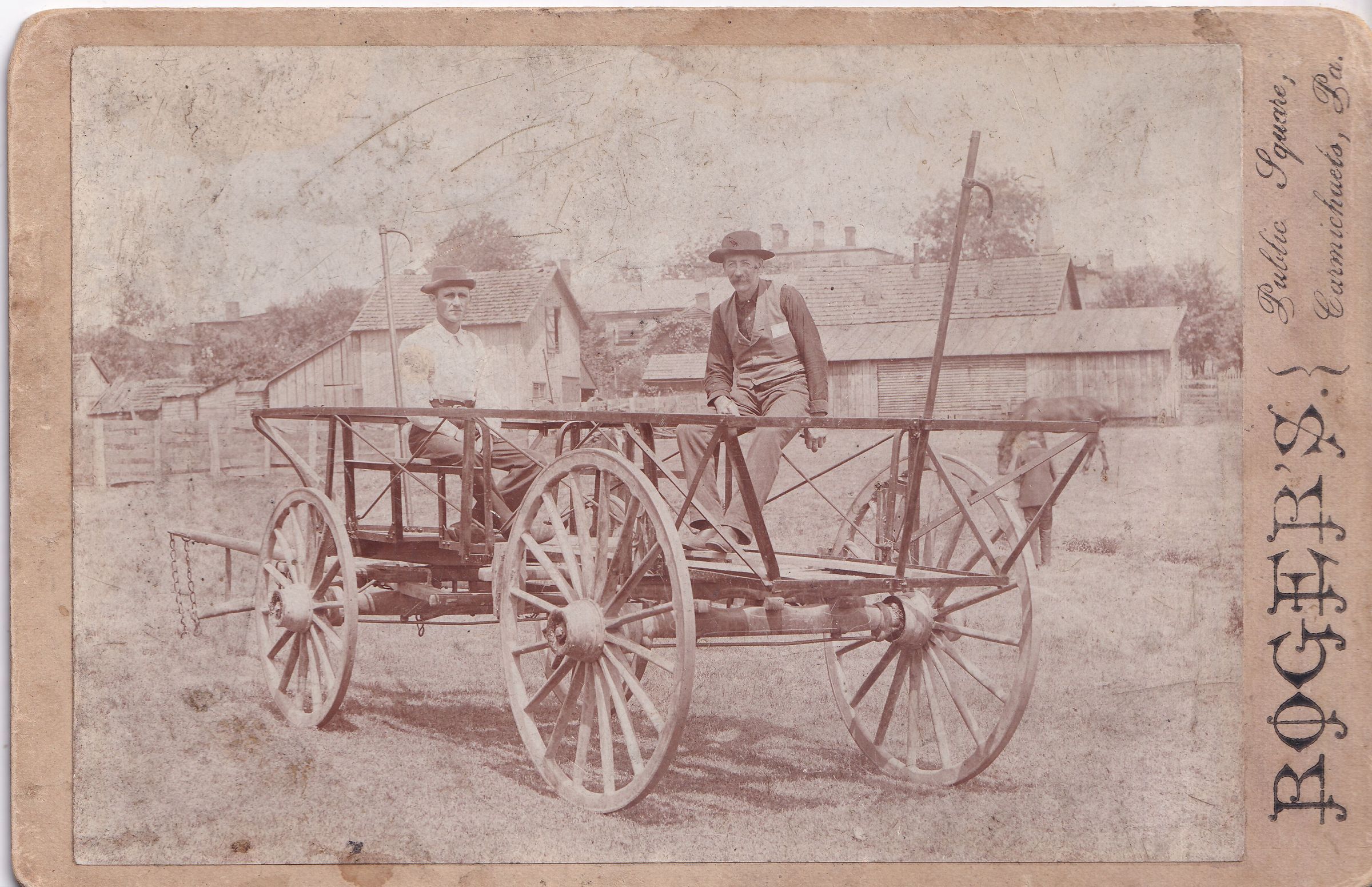 SOURCE CITATION: [Left-Right]: John Franklin "Frank" Morris [1857-1915] and Unidentified in a hay wagon that Frank invented; circa 1880-1900, image by Rogers, Public Square, Carmichaels, Pa.; item no. MORK-AN001-0003-0009, Morris Series, Elizabeth Jane (Davis) (Rex) Morris Collection, shared by her grandchildren, John Robert Morris and Kathleen (Morris) Miller; Greene Connections Archives Project (www.GreeneConnections.com).