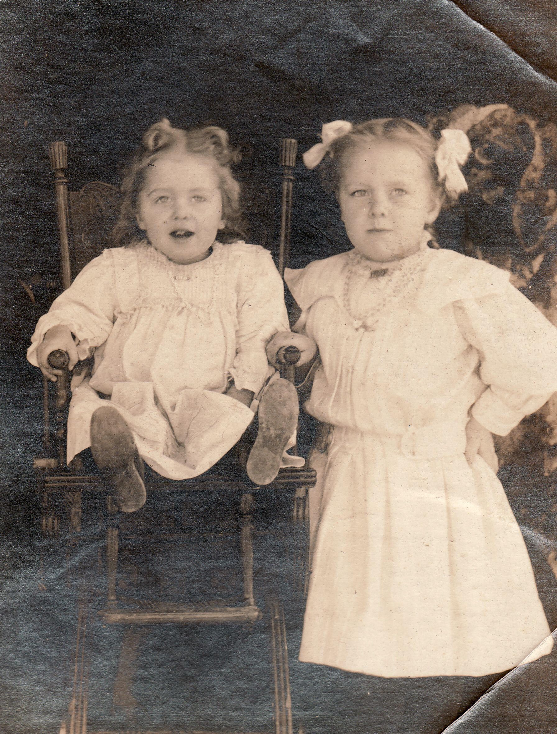 SOURCE CITATION: [Left-Right]: Etta Elverta Clutter [1907-1965] and Silvie Olive (Clutter) Swart [1905-1992] - daughters of John Milton Clutter and Minnie Belle Wise; circa 1907-1908; item no. SUPL-AN005-0018, Clutter Series, Wayne Carl Swart Collection, Greene Connections Archives Project (www.GreeneConnections.com).