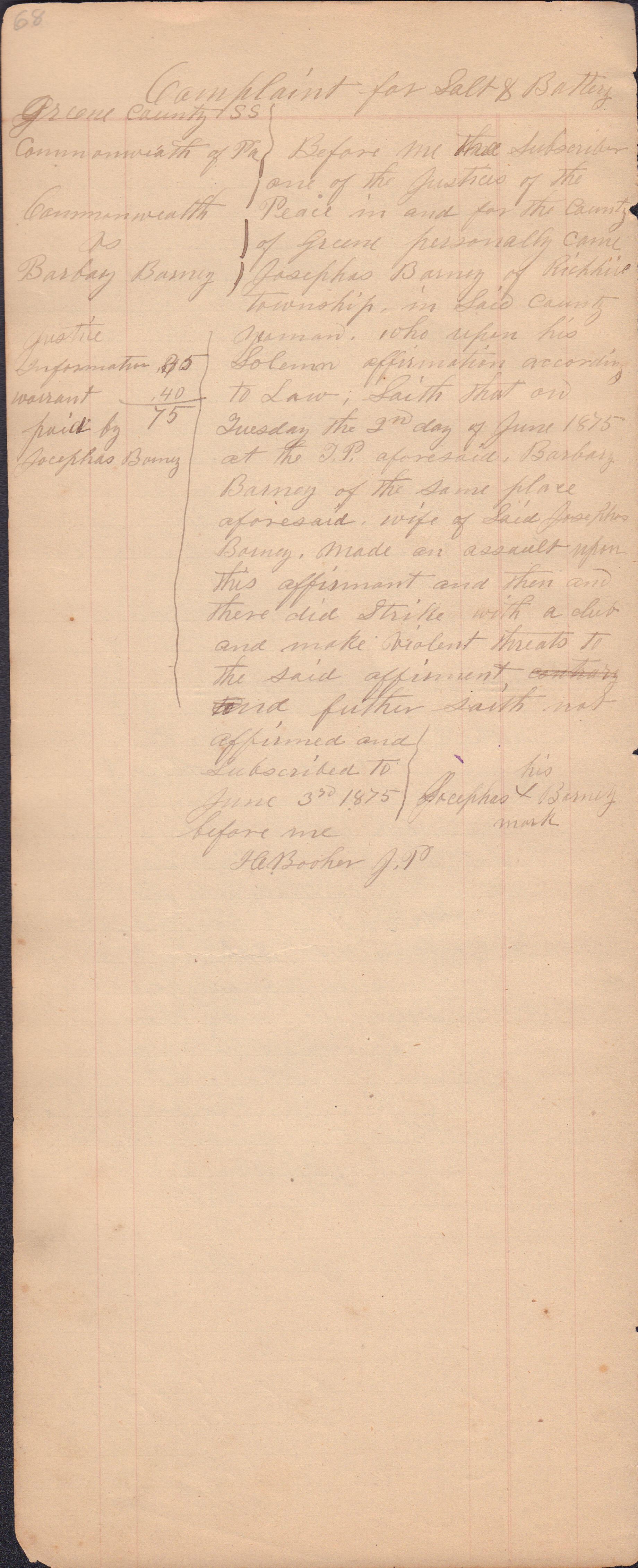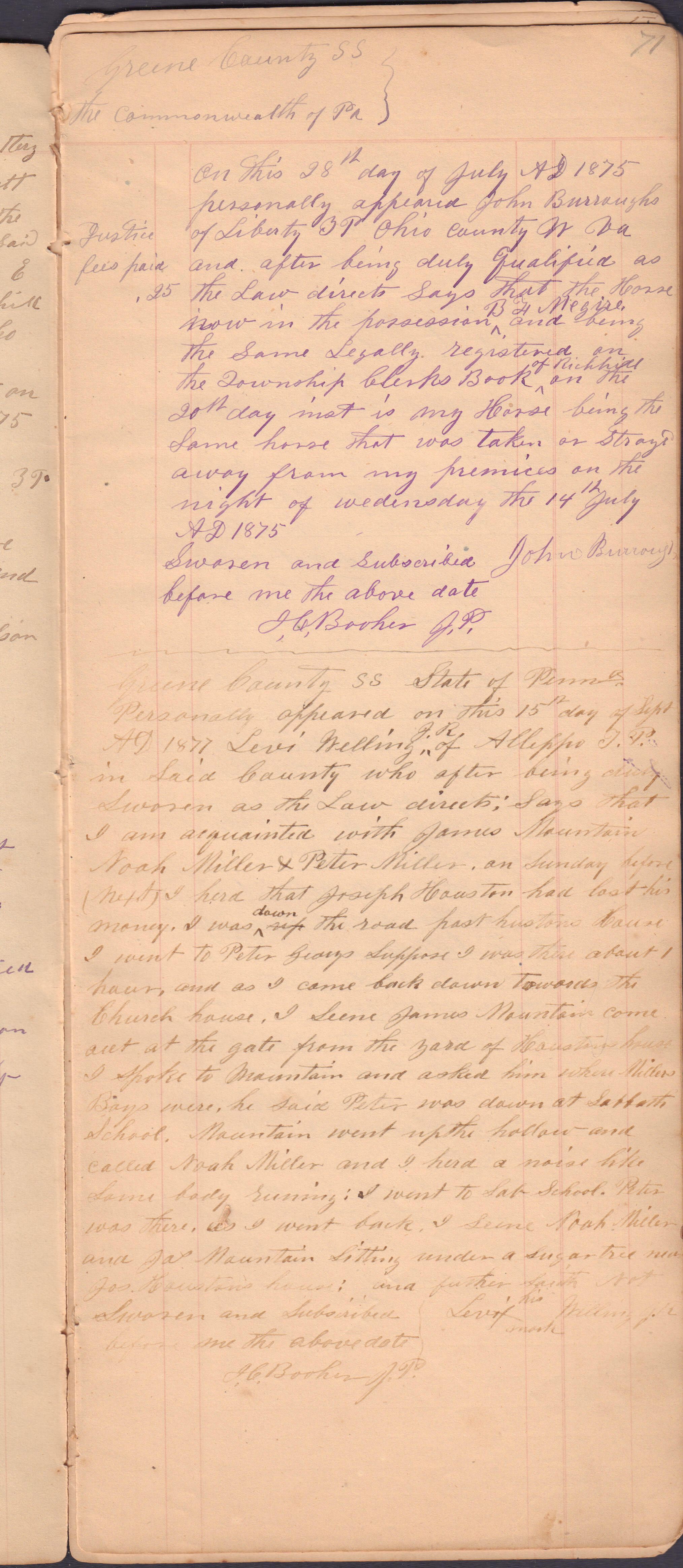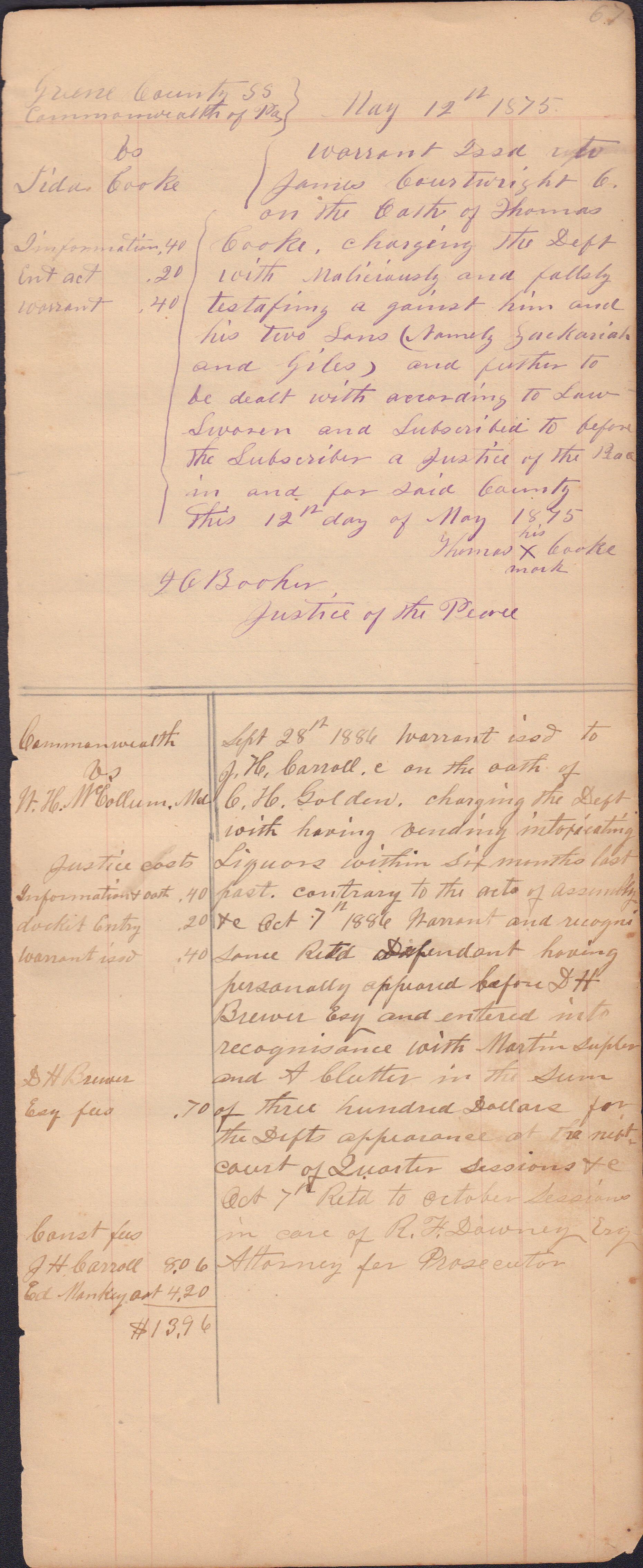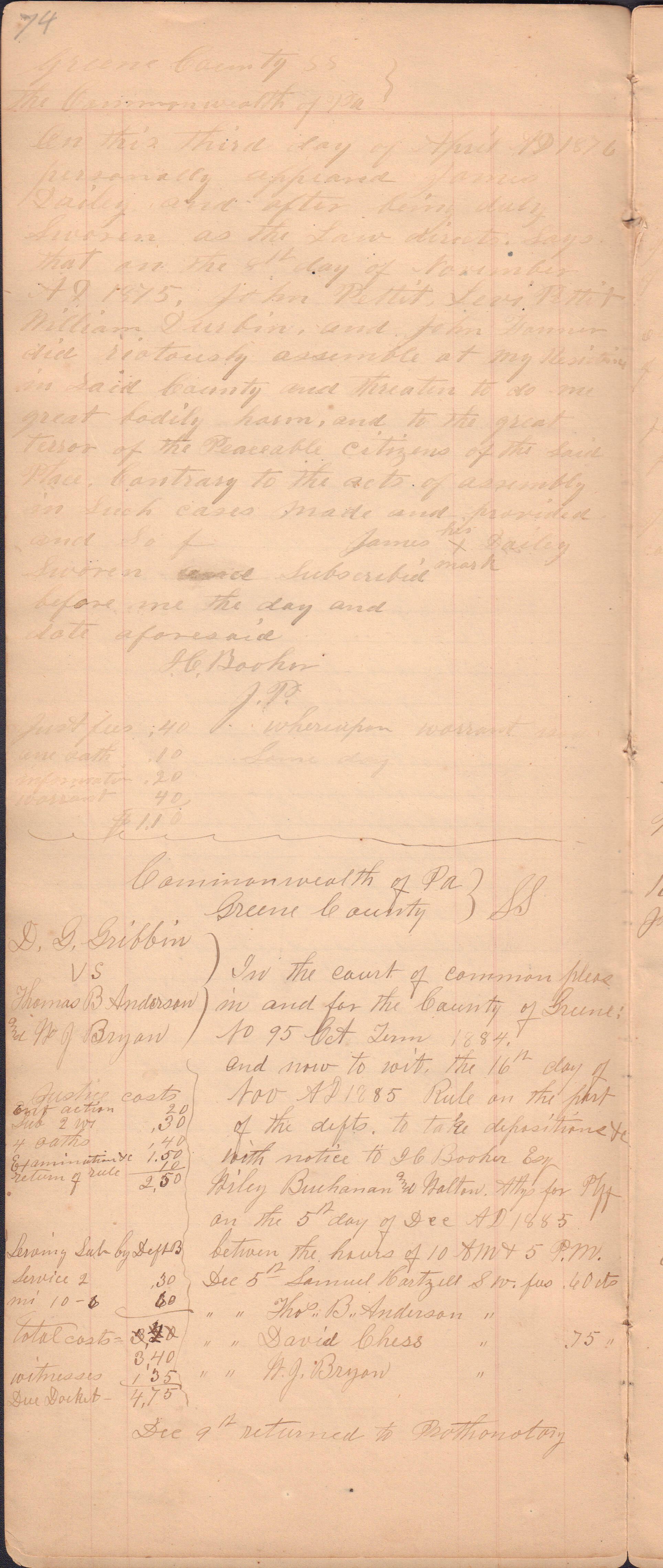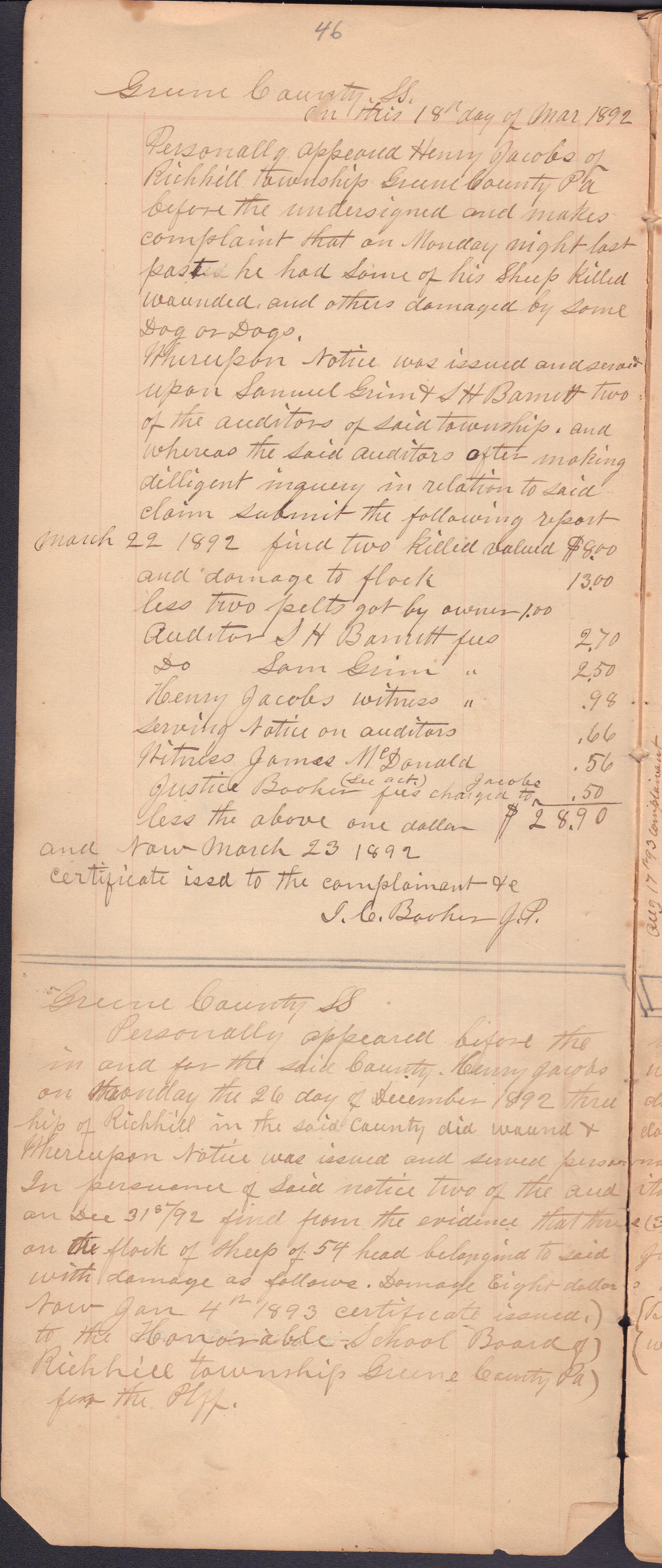 Source Citation: I. C. Booher and G. W. Smith, Justice of the Peace Docket, docket entries 1870s-1900s, Richhill Township, Greene County, Pennsylvania; held by Greene County Clerk of Court's Office, Courthouse, Waynesburg, Pennsylvania, 2016, item no. GCCH-AN003-0003-0000, Greene County Courthouse Collection, Greene Connections Archives Project (www.GreeneConnections.com).
