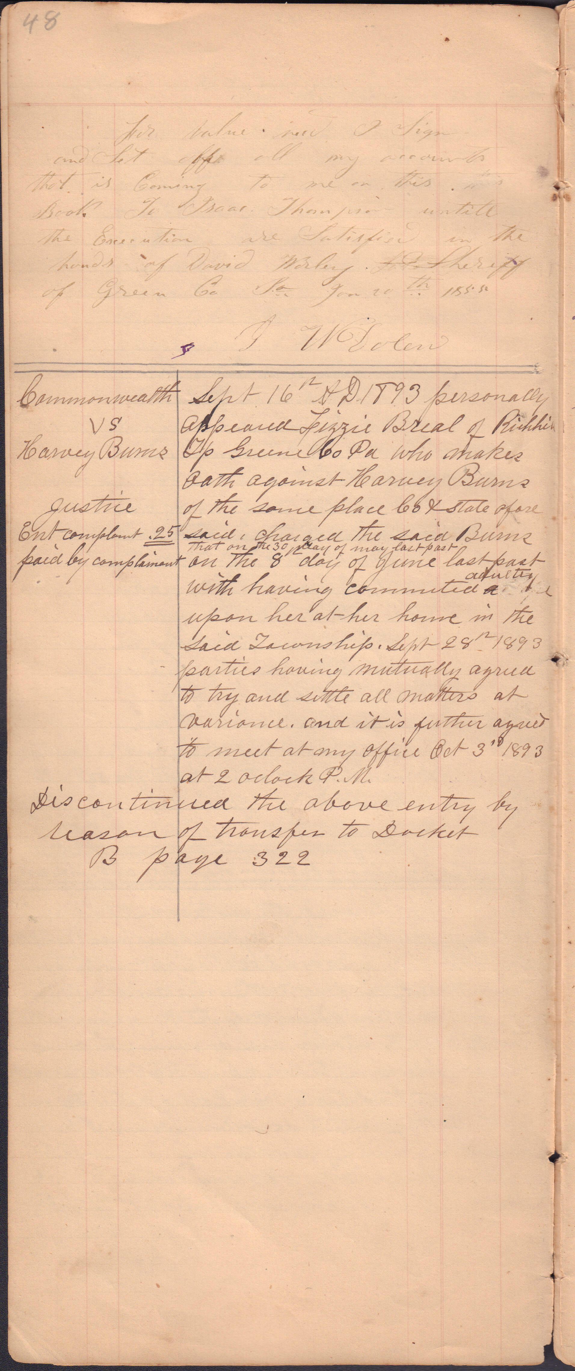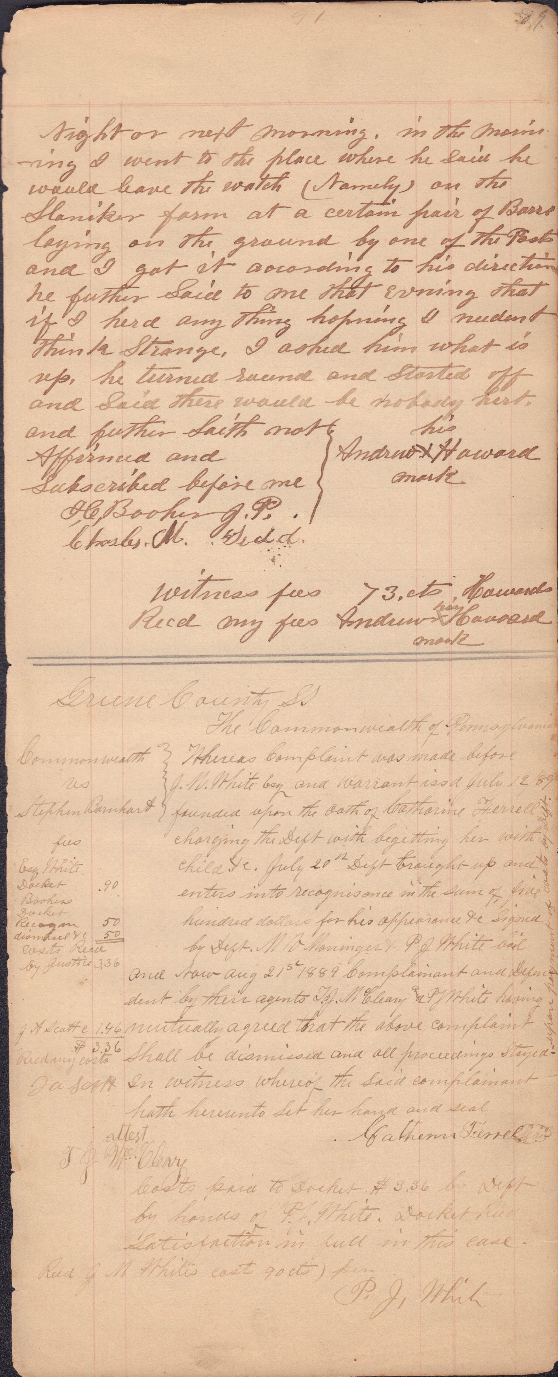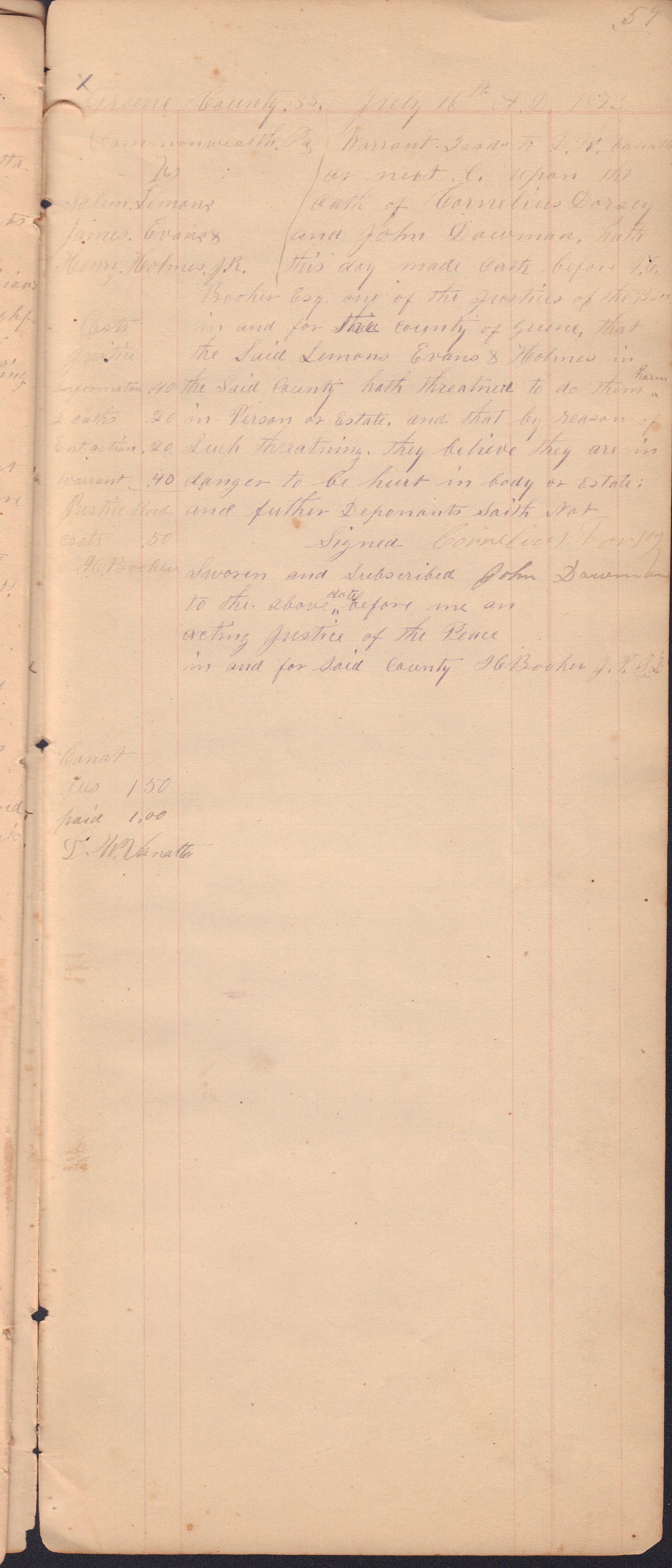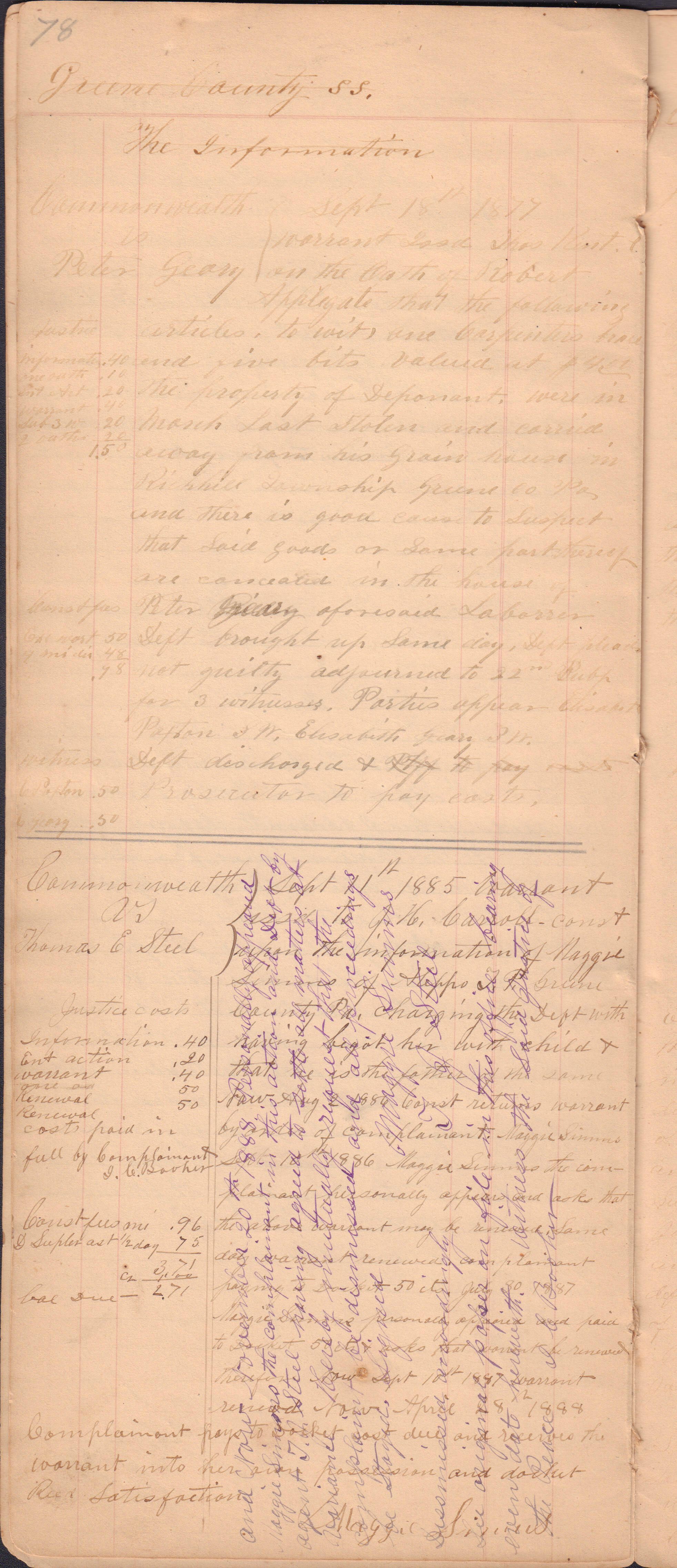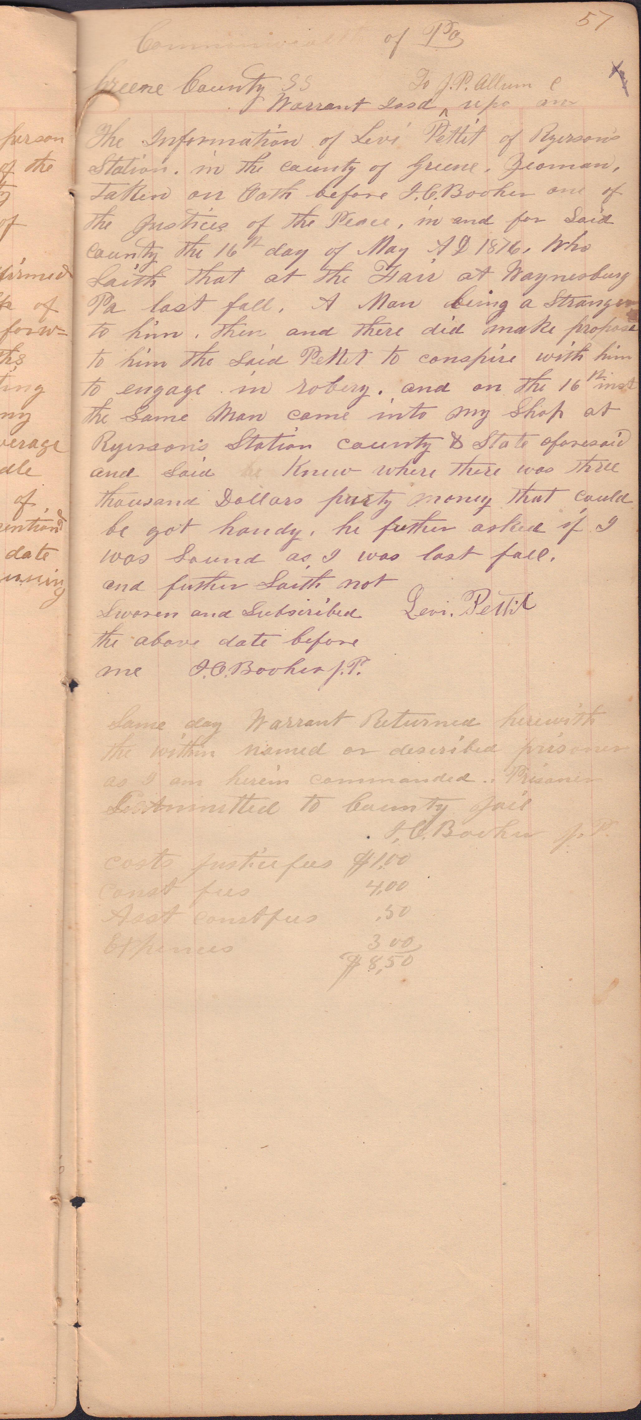 Source Citation: I. C. Booher and G. W. Smith, Justice of the Peace Docket, docket entries 1870s-1900s, Richhill Township, Greene County, Pennsylvania; held by Greene County Clerk of Court's Office, Courthouse, Waynesburg, Pennsylvania, 2016, item no. GCCH-AN003-0003-0000, Greene County Courthouse Collection, Greene Connections Archives Project (www.GreeneConnections.com).