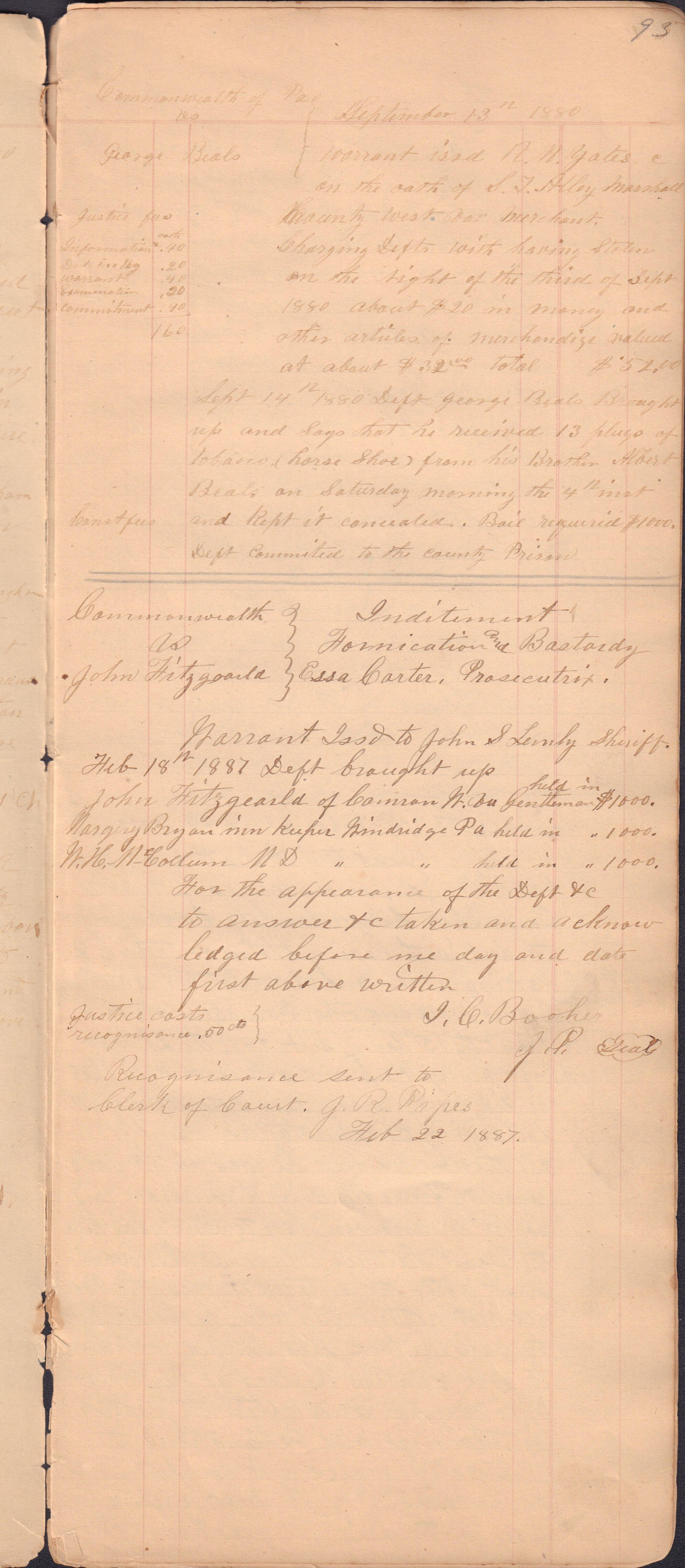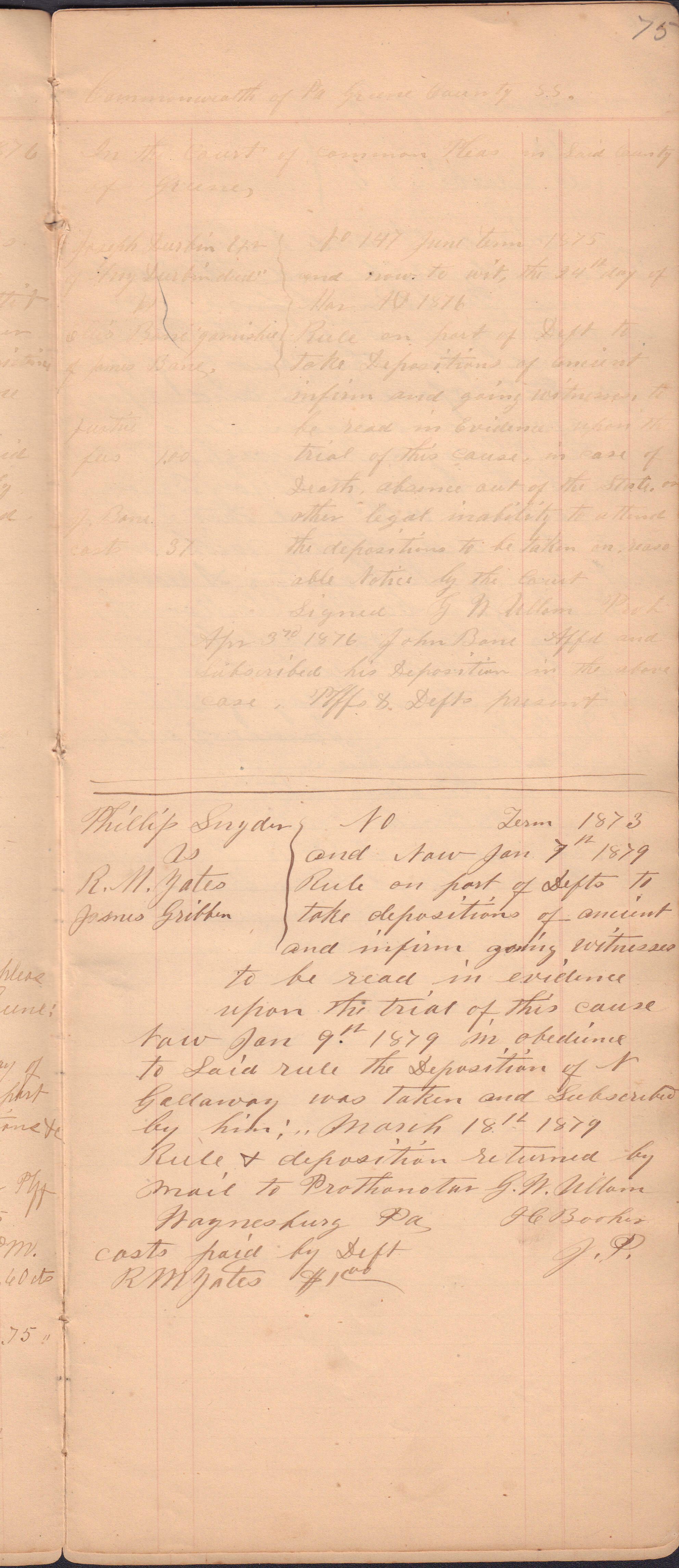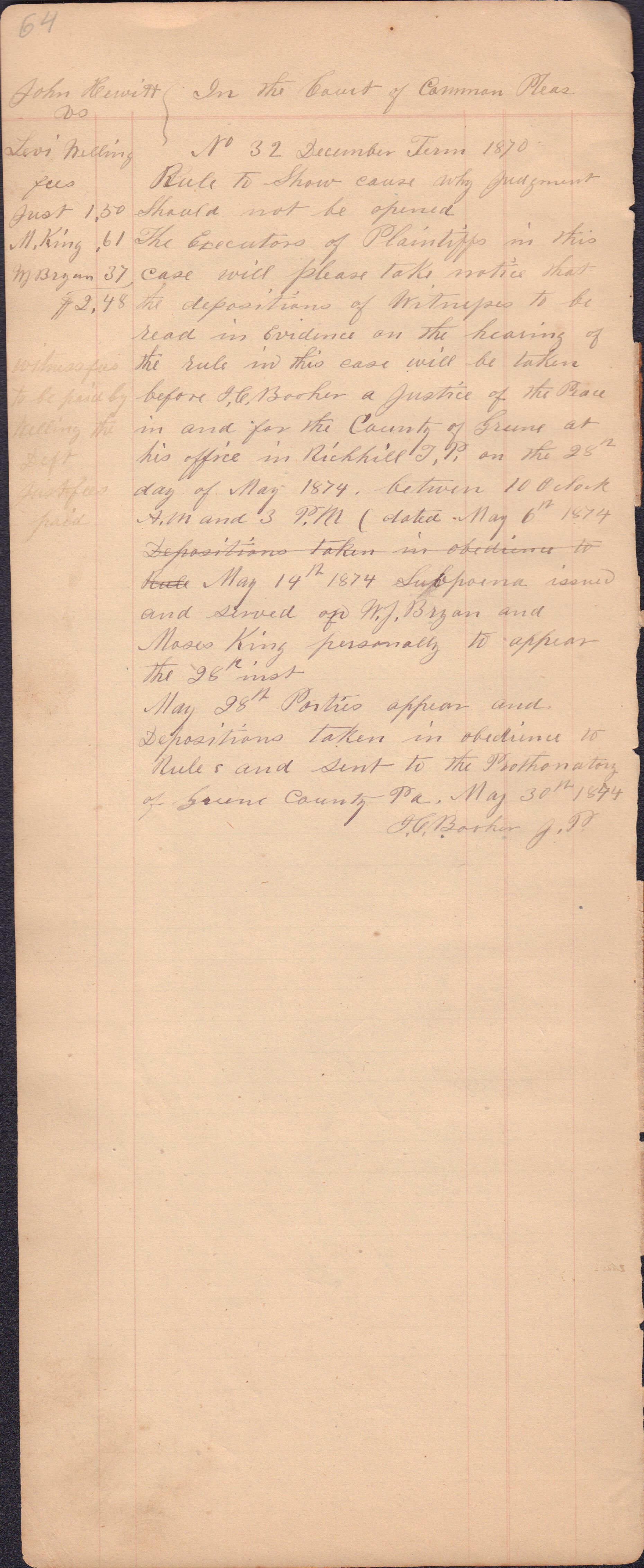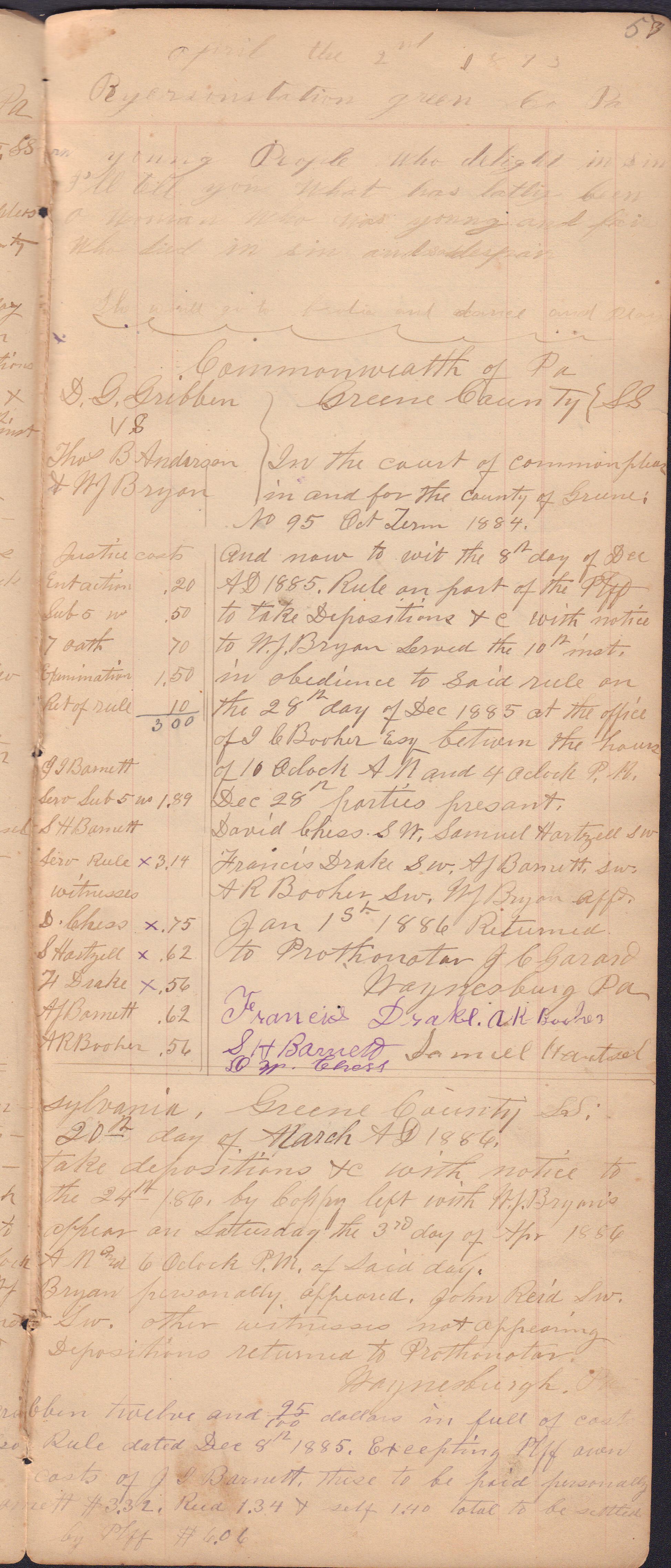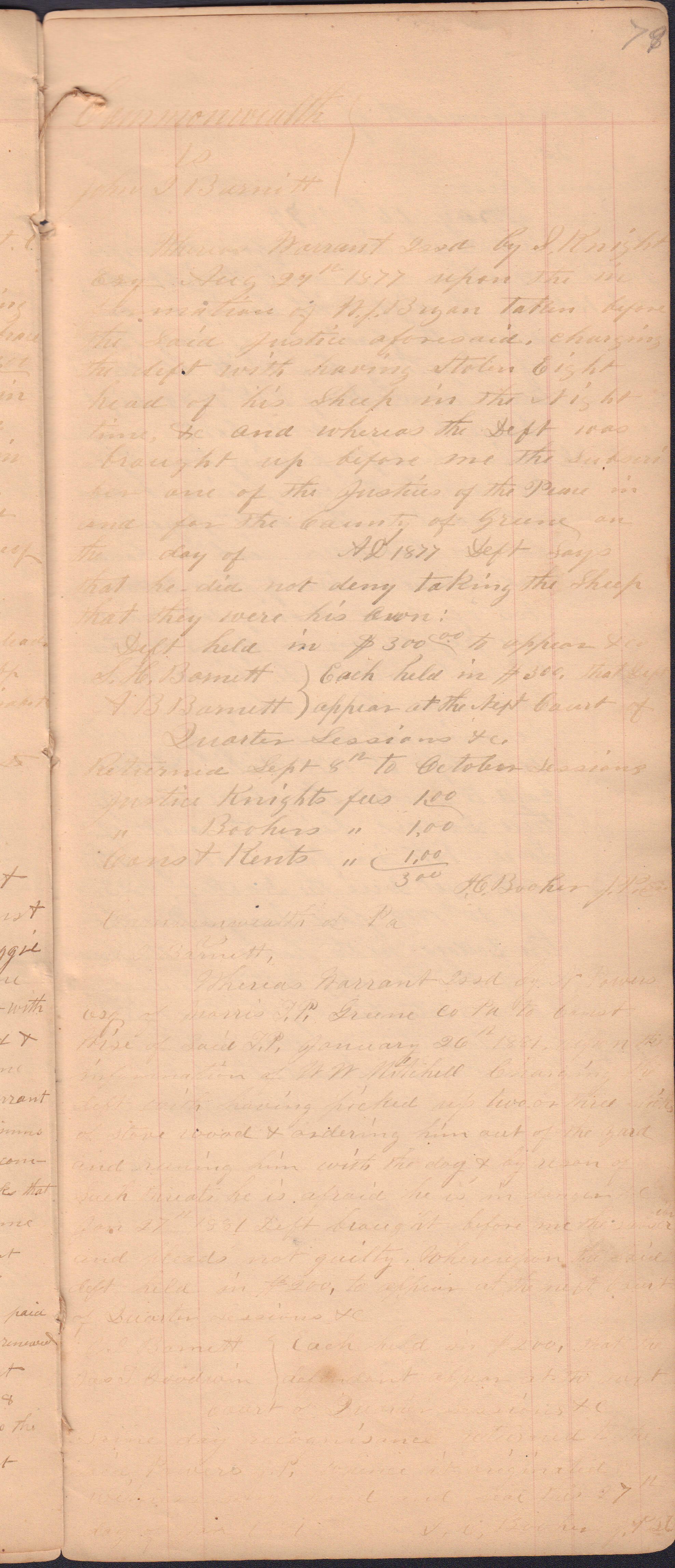 Source Citation: I. C. Booher and G. W. Smith, Justice of the Peace Docket, docket entries 1870s-1900s, Richhill Township, Greene County, Pennsylvania; held by Greene County Clerk of Court's Office, Courthouse, Waynesburg, Pennsylvania, 2016, item no. GCCH-AN003-0003-0000, Greene County Courthouse Collection, Greene Connections Archives Project (www.GreeneConnections.com).