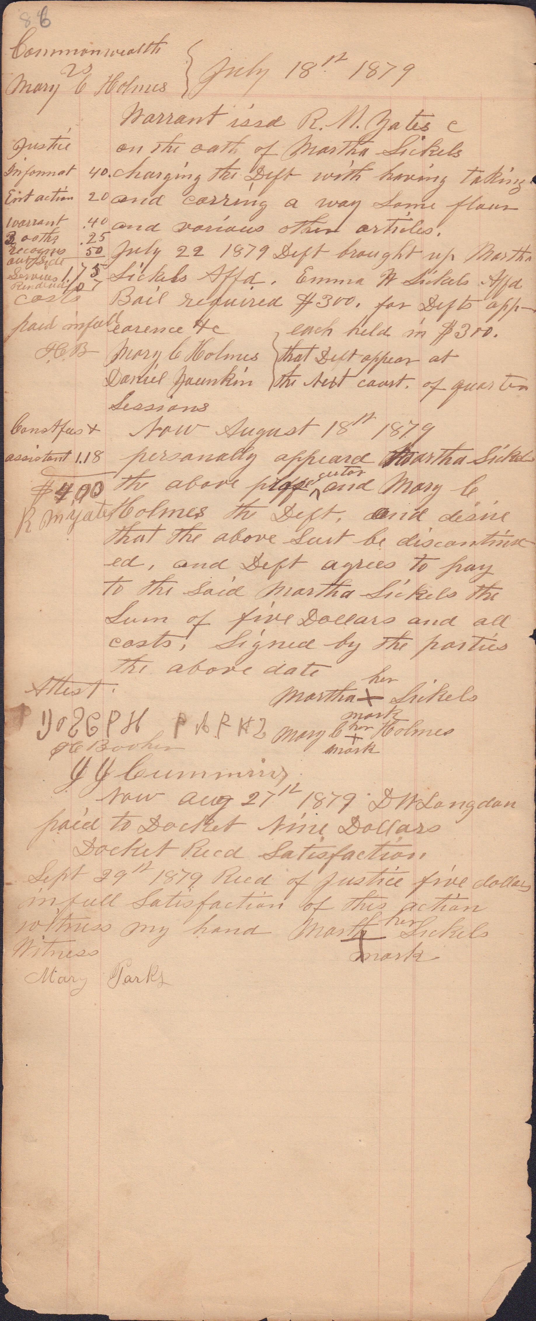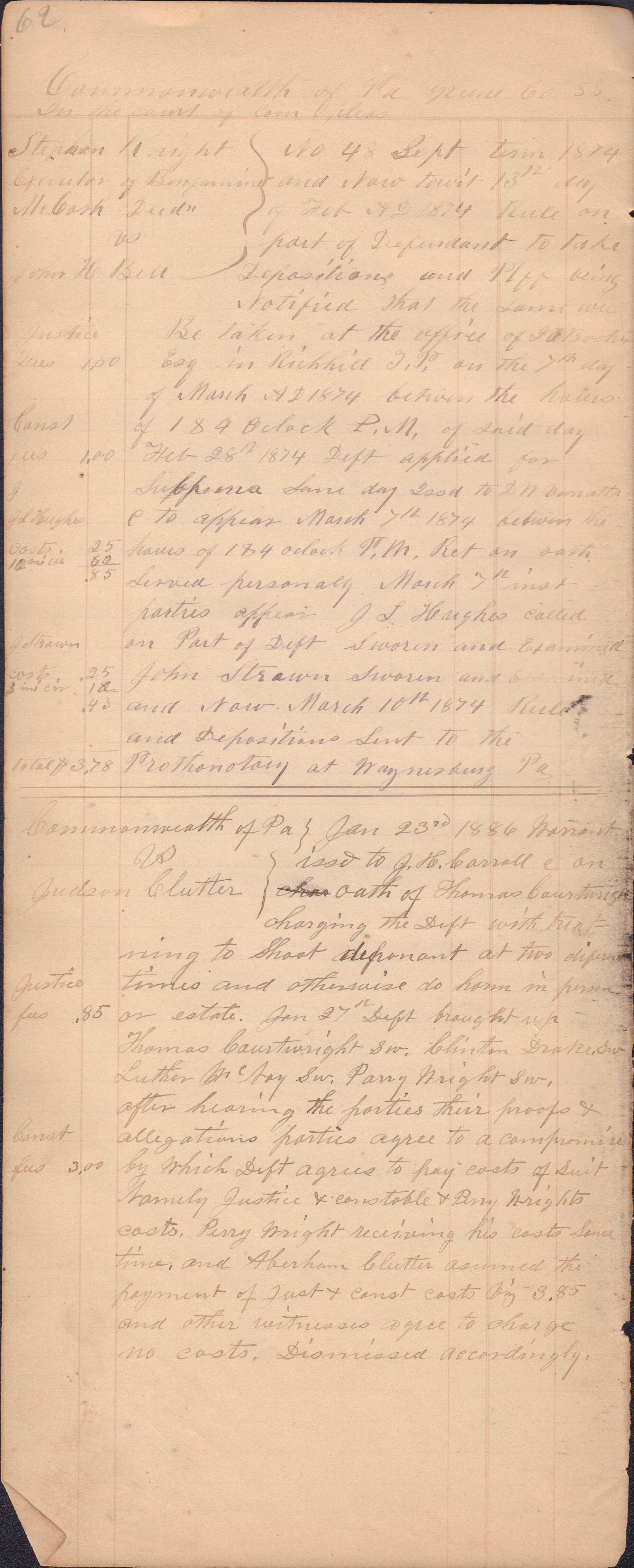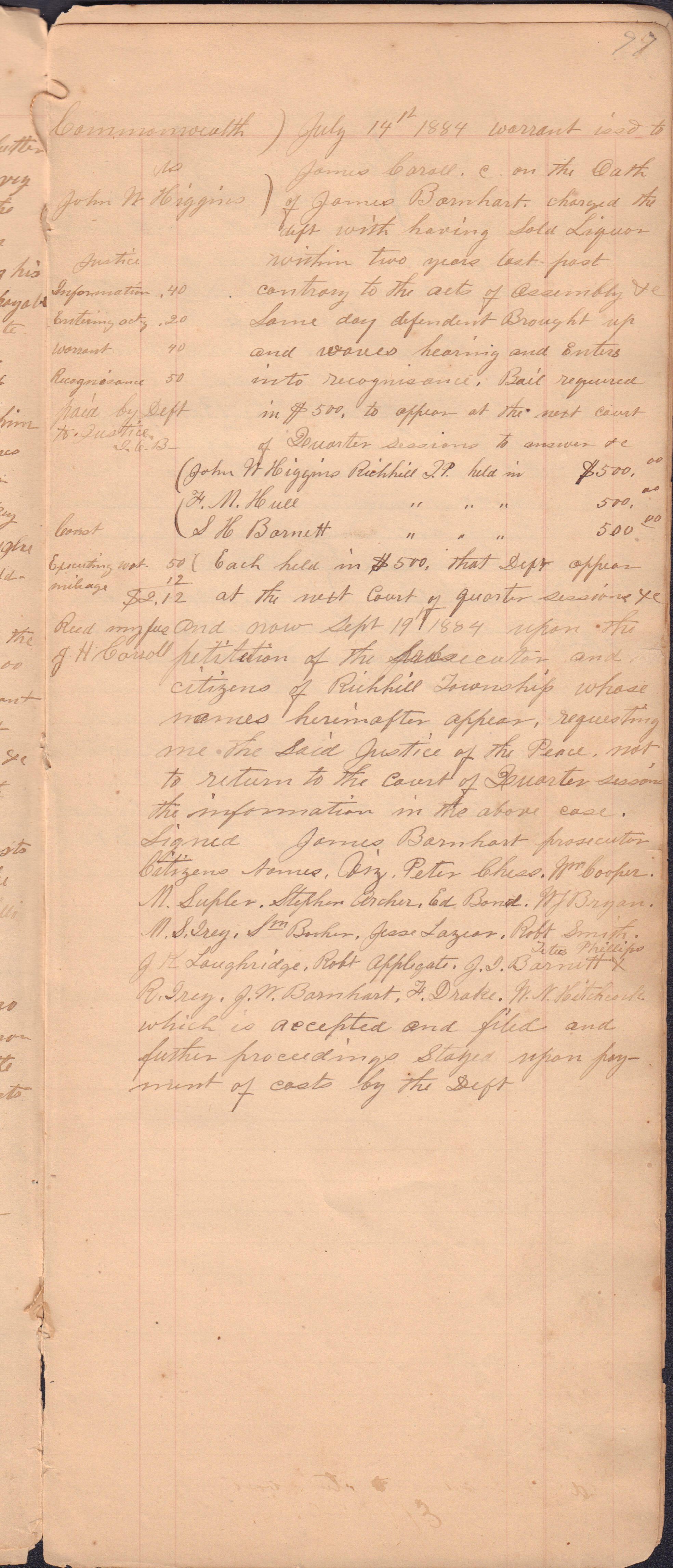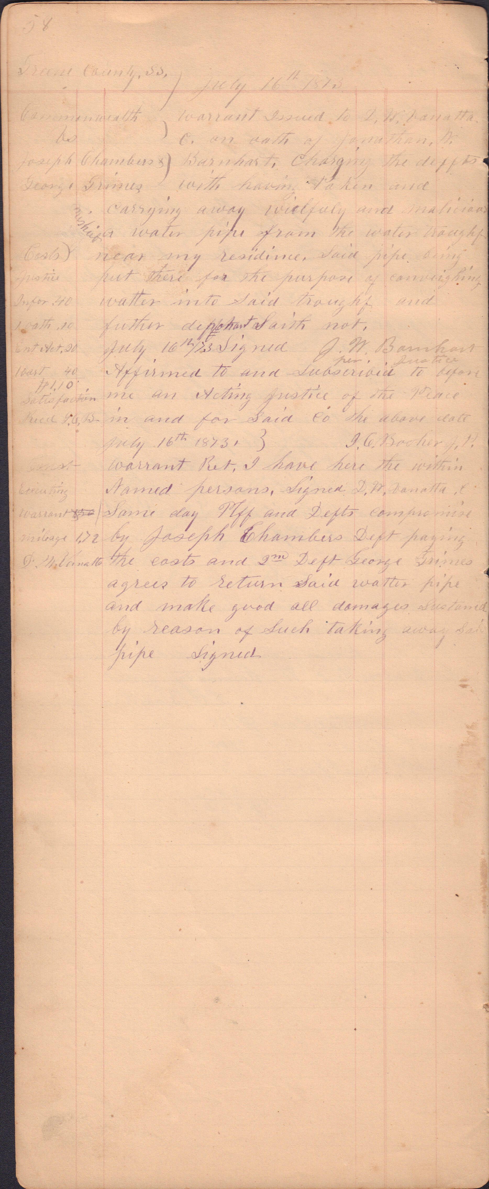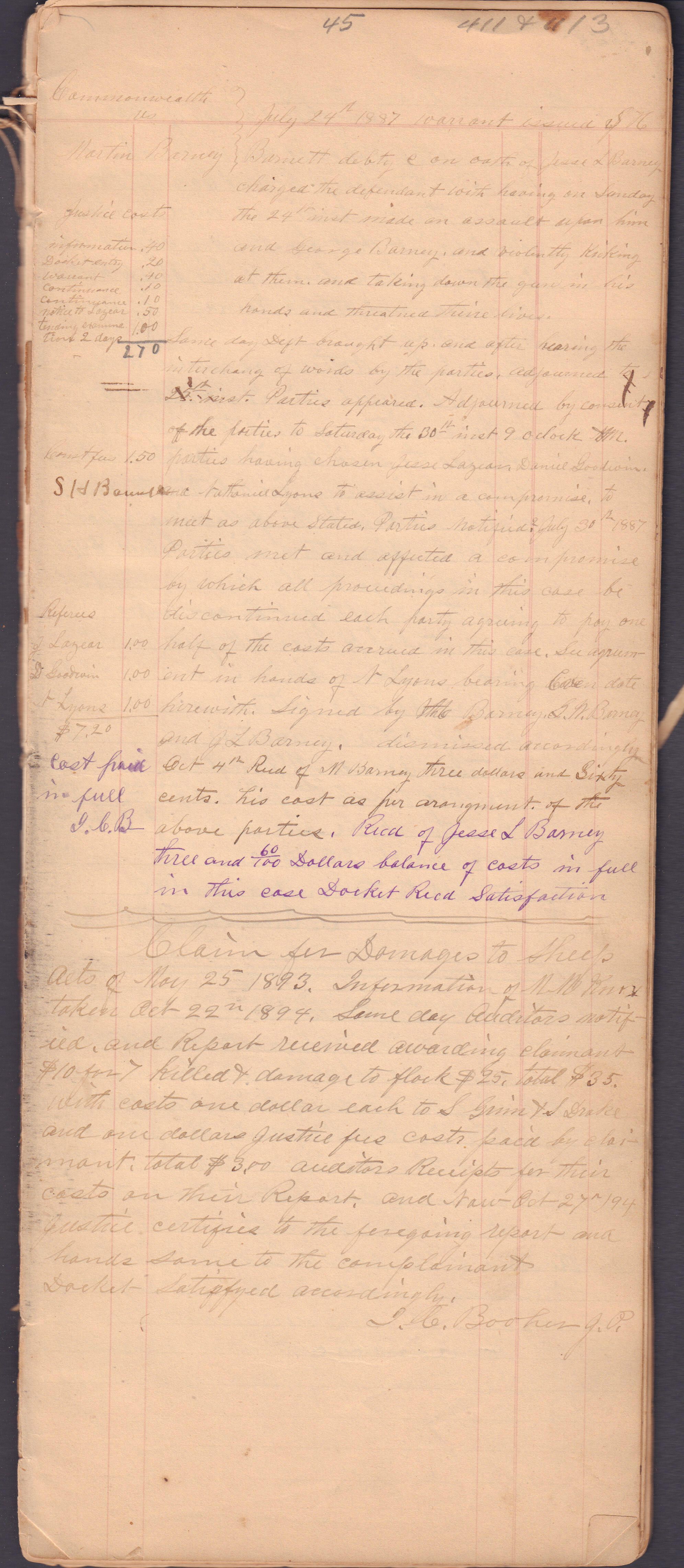 Source Citation: I. C. Booher and G. W. Smith, Justice of the Peace Docket, docket entries 1870s-1900s, Richhill Township, Greene County, Pennsylvania; held by Greene County Clerk of Court's Office, Courthouse, Waynesburg, Pennsylvania, 2016, item no. GCCH-AN003-0003-0000, Greene County Courthouse Collection, Greene Connections Archives Project (www.GreeneConnections.com).