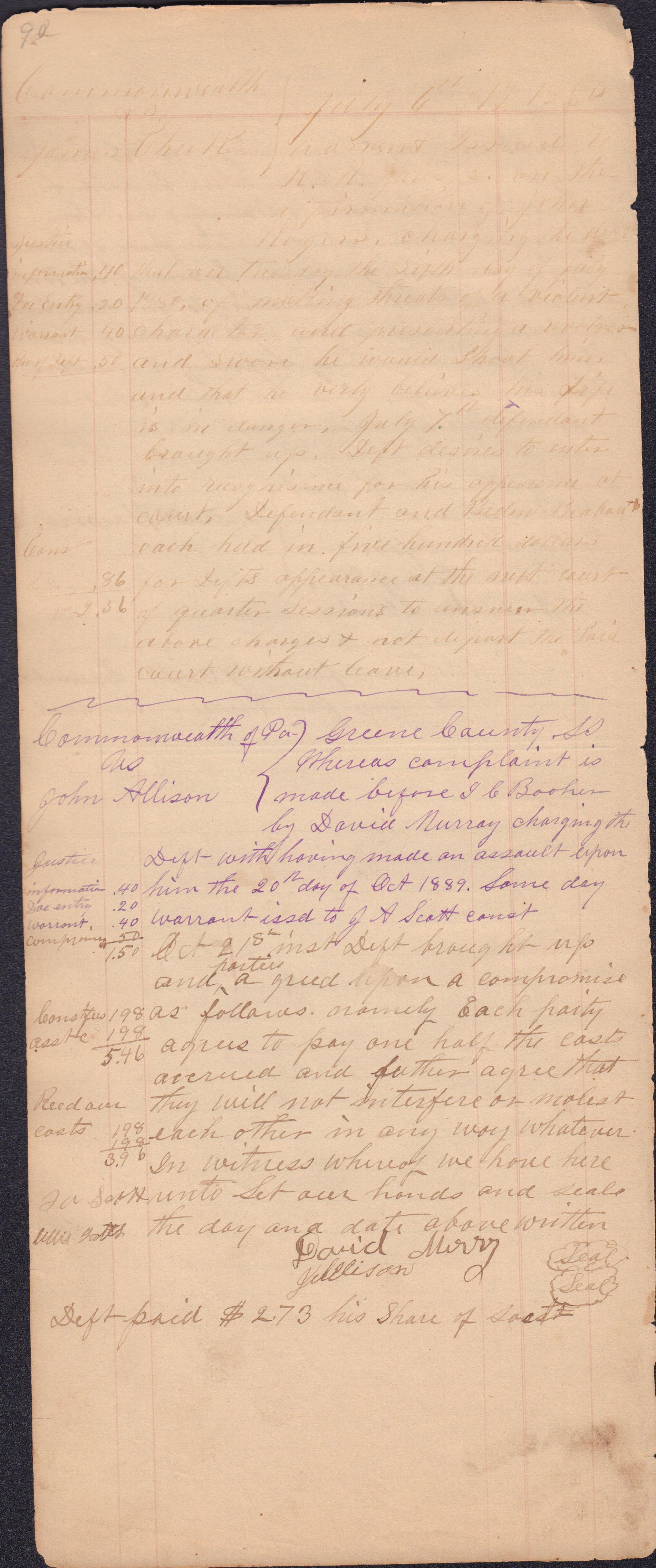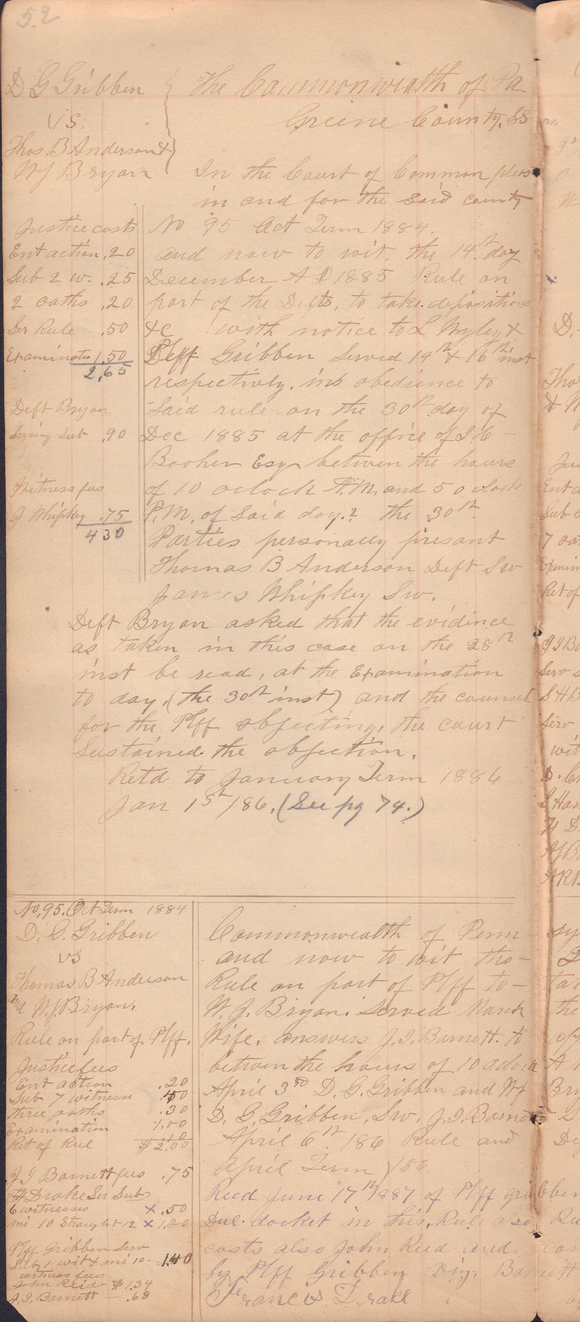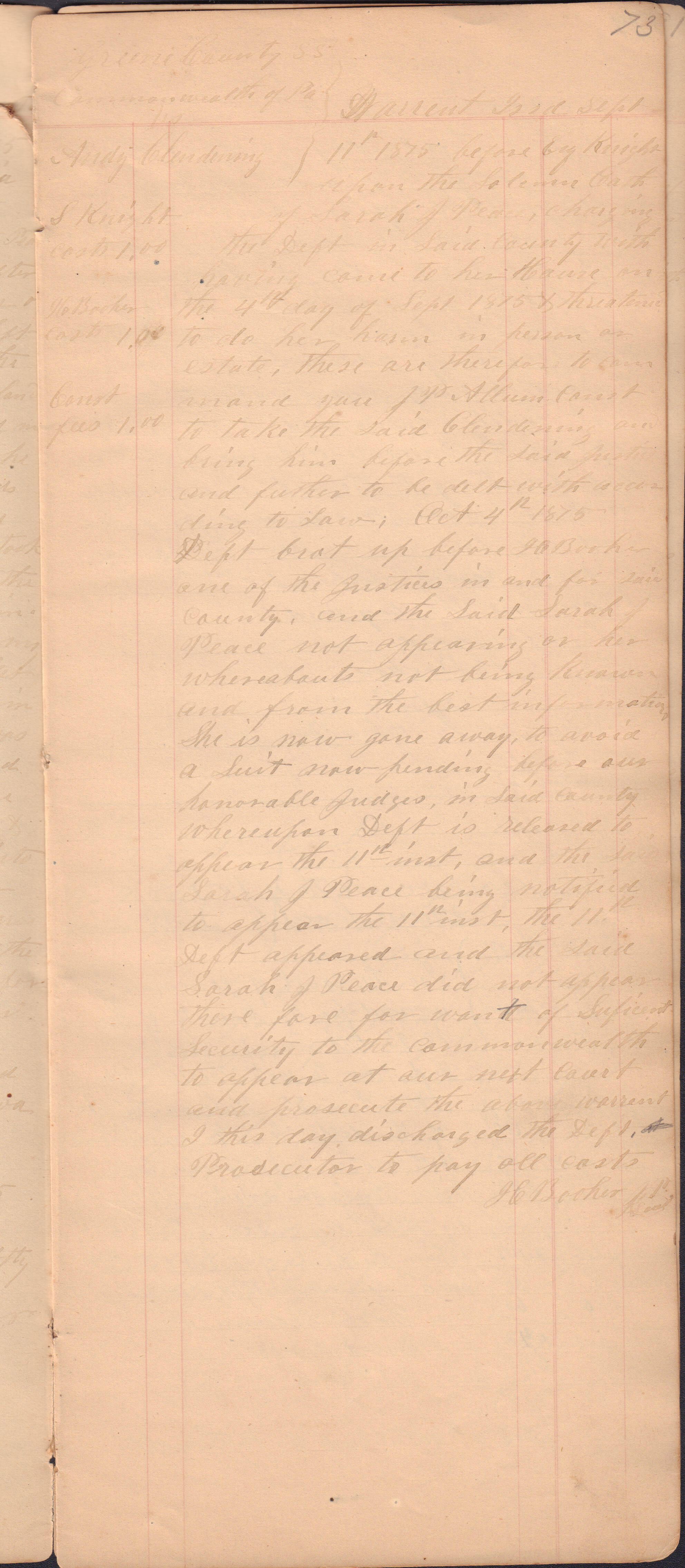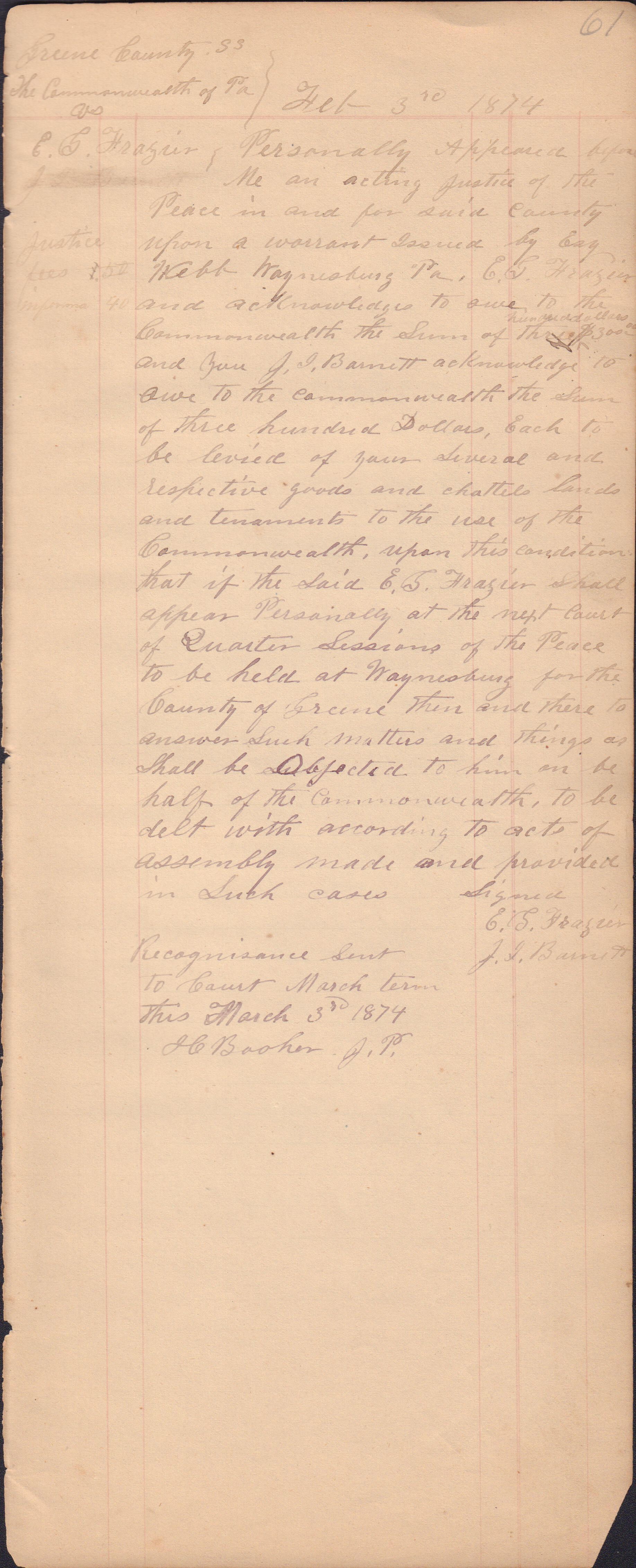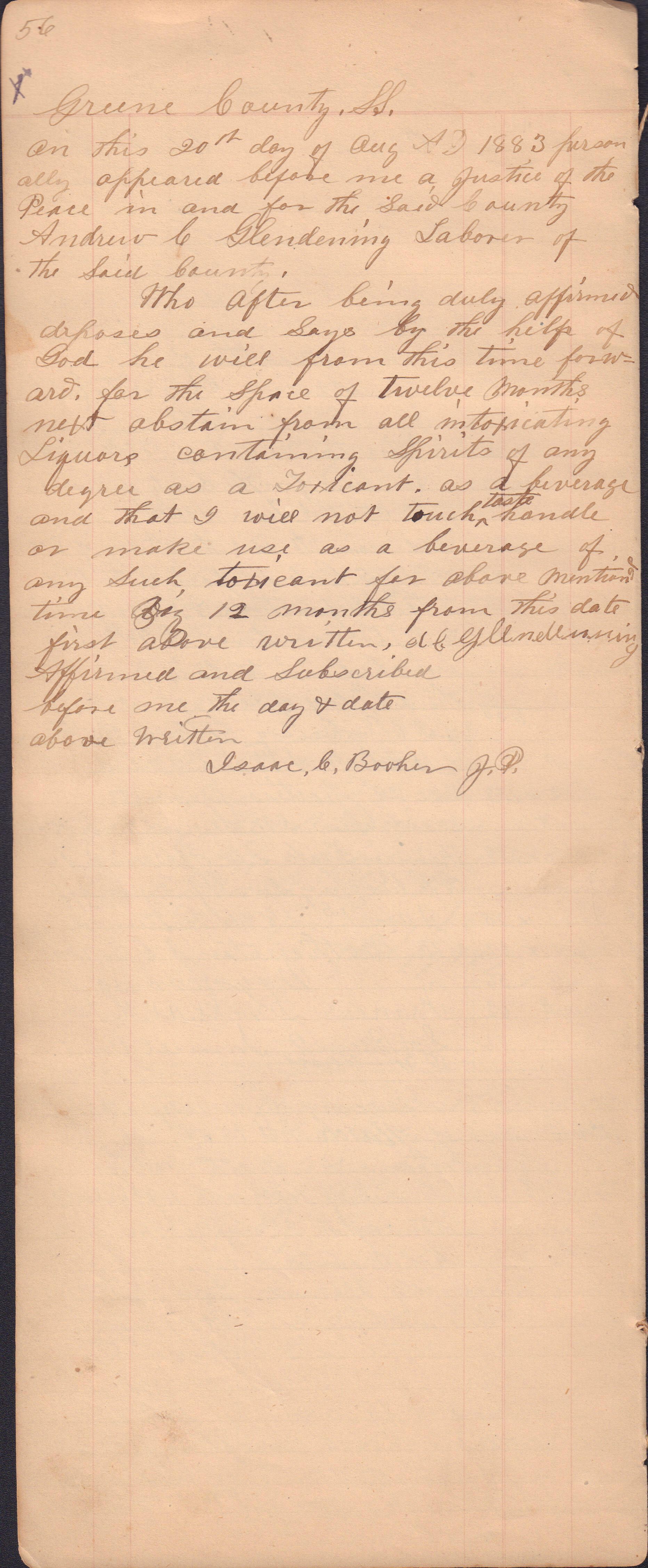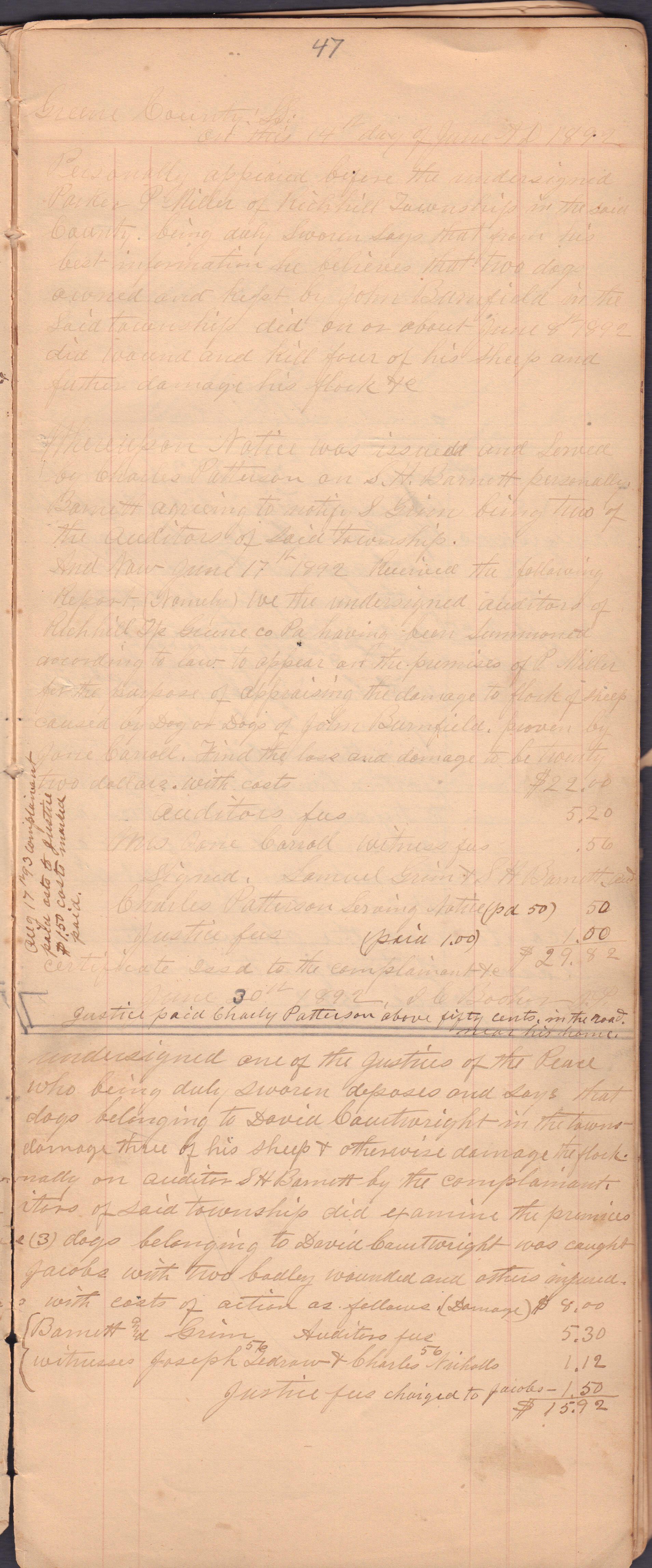 Source Citation: I. C. Booher and G. W. Smith, Justice of the Peace Docket, docket entries 1870s-1900s, Richhill Township, Greene County, Pennsylvania; held by Greene County Clerk of Court's Office, Courthouse, Waynesburg, Pennsylvania, 2016, item no. GCCH-AN003-0003-0000, Greene County Courthouse Collection, Greene Connections Archives Project (www.GreeneConnections.com).