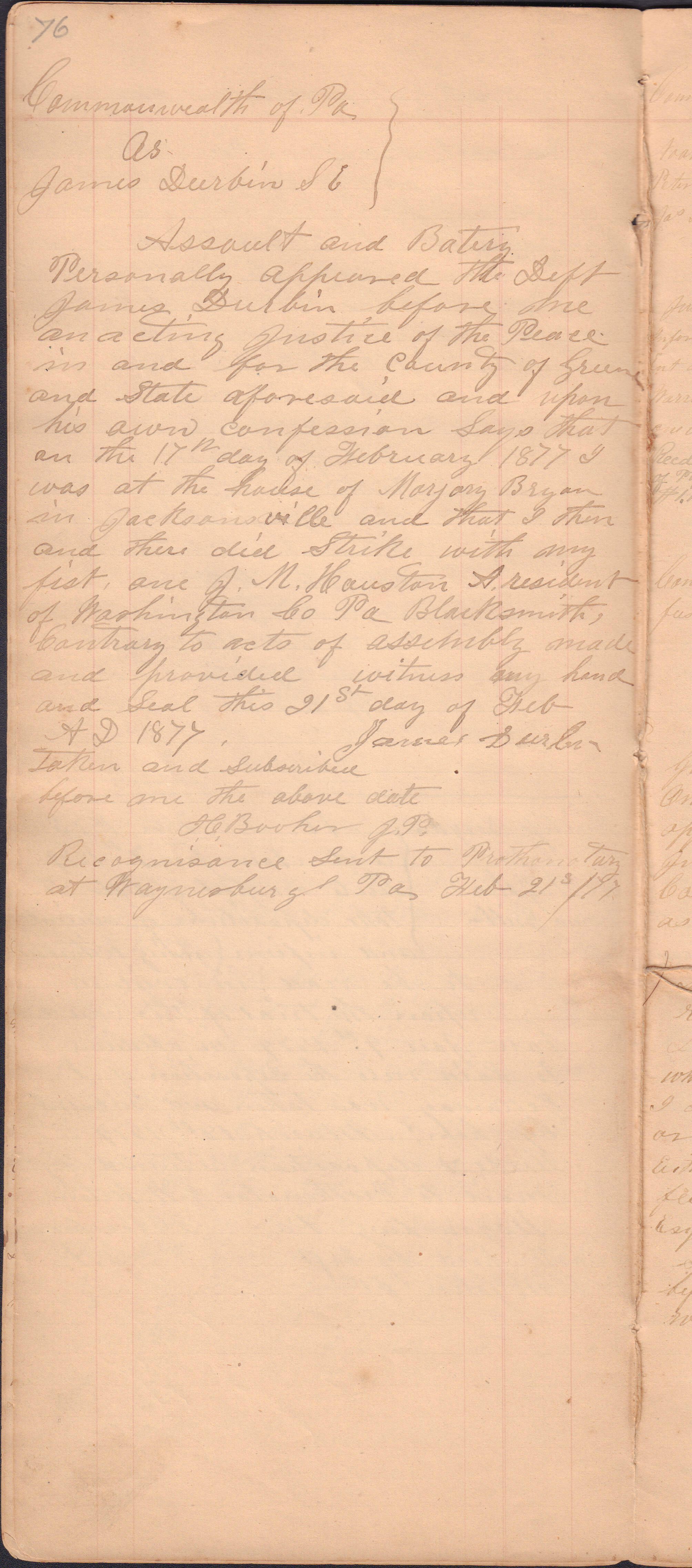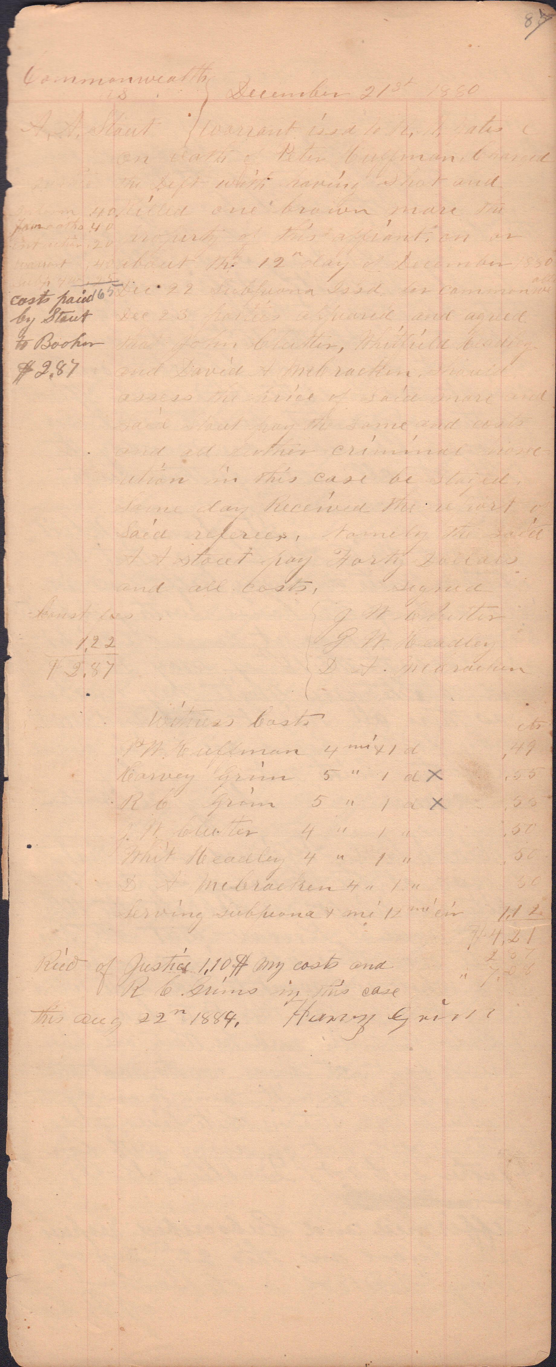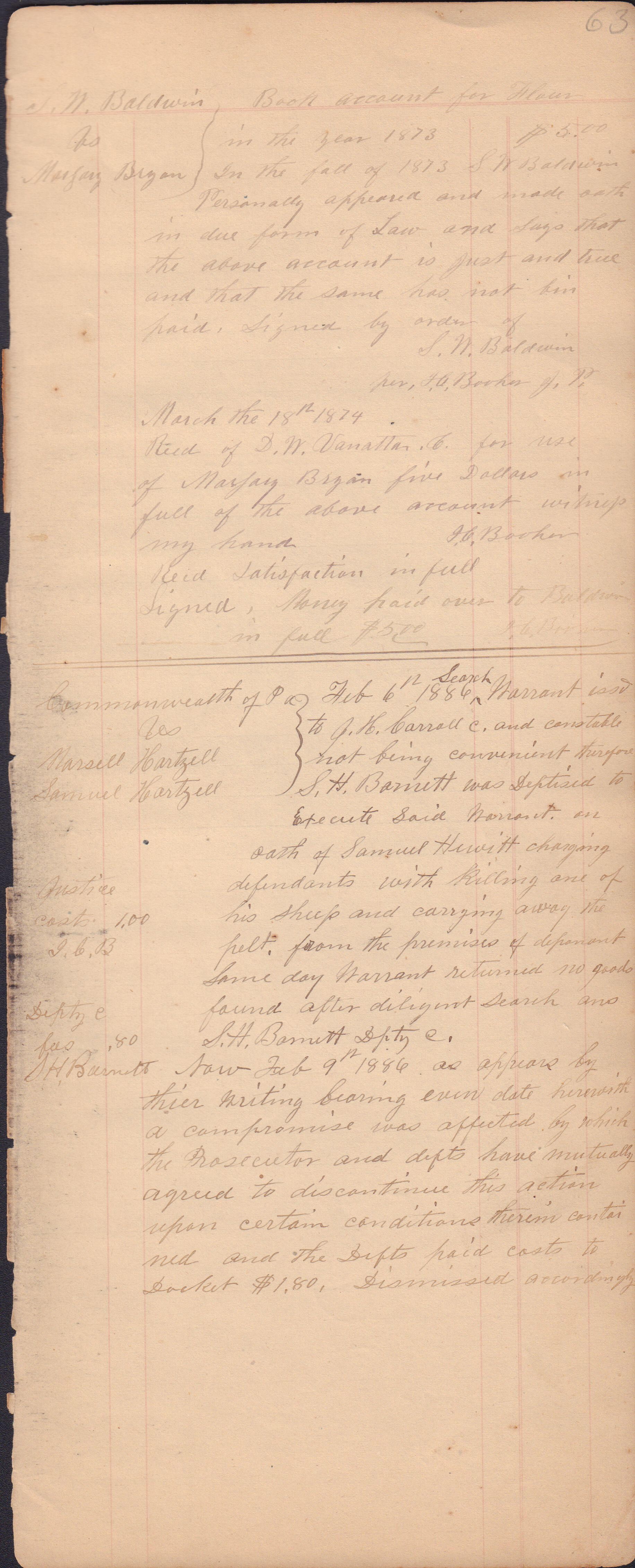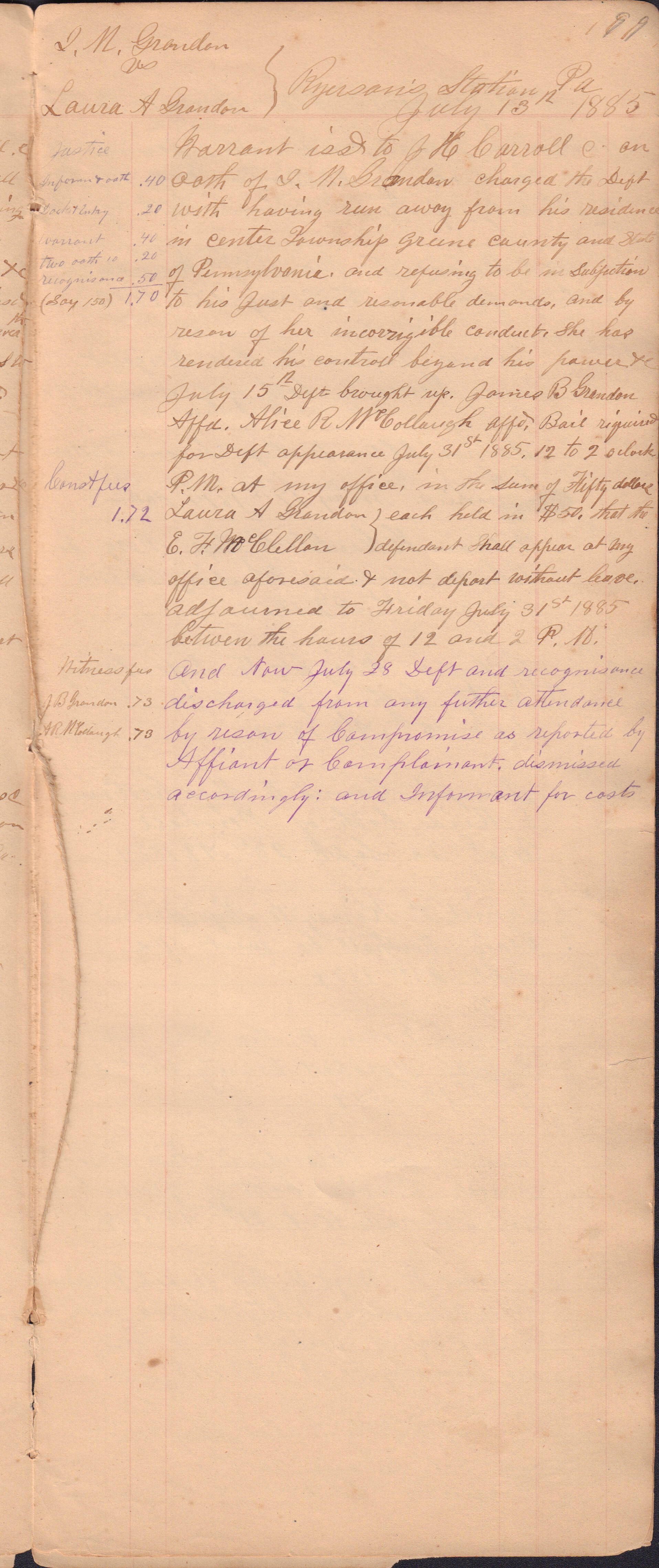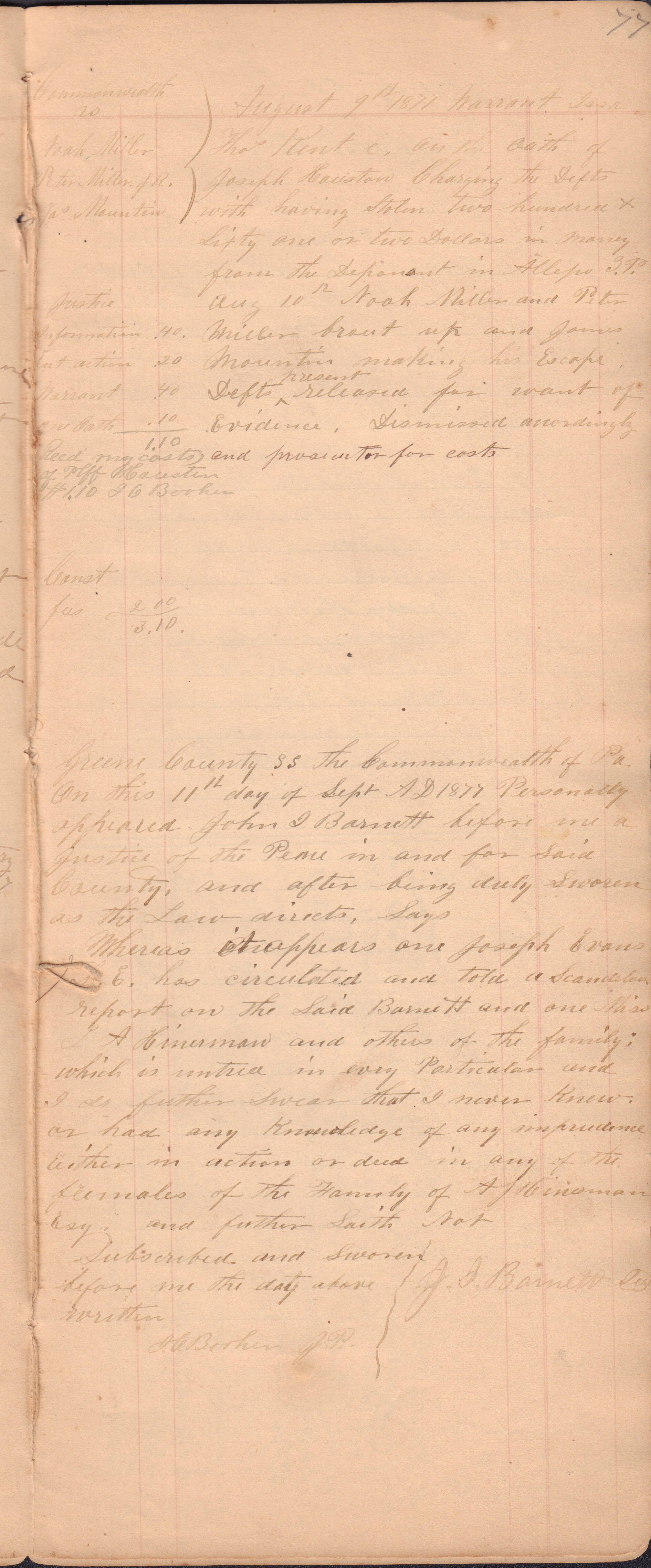 Source Citation: I. C. Booher and G. W. Smith, Justice of the Peace Docket, docket entries 1870s-1900s, Richhill Township, Greene County, Pennsylvania; held by Greene County Clerk of Court's Office, Courthouse, Waynesburg, Pennsylvania, 2016, item no. GCCH-AN003-0003-0000, Greene County Courthouse Collection, Greene Connections Archives Project (www.GreeneConnections.com).