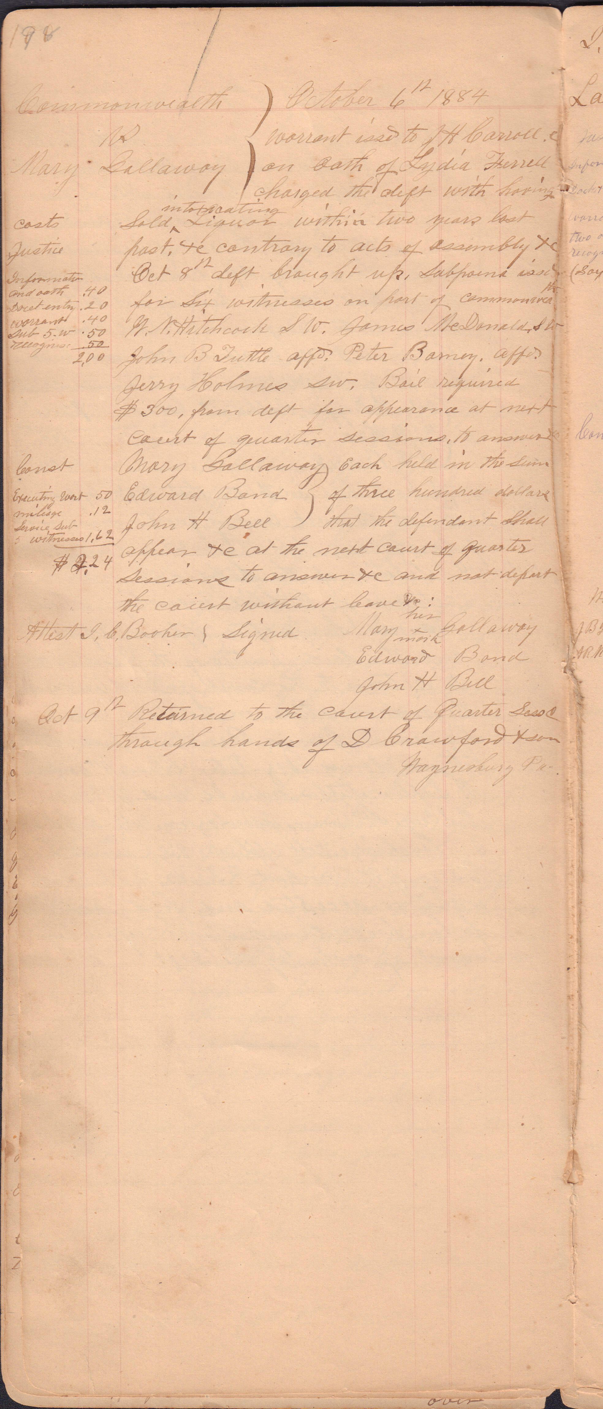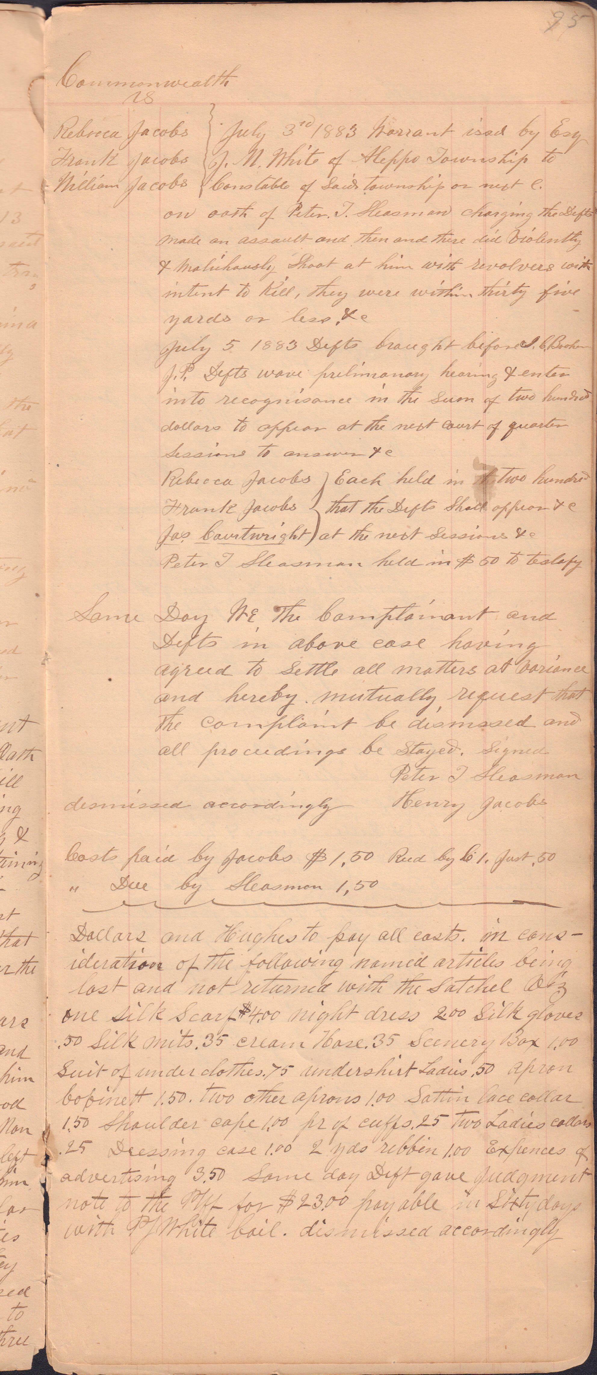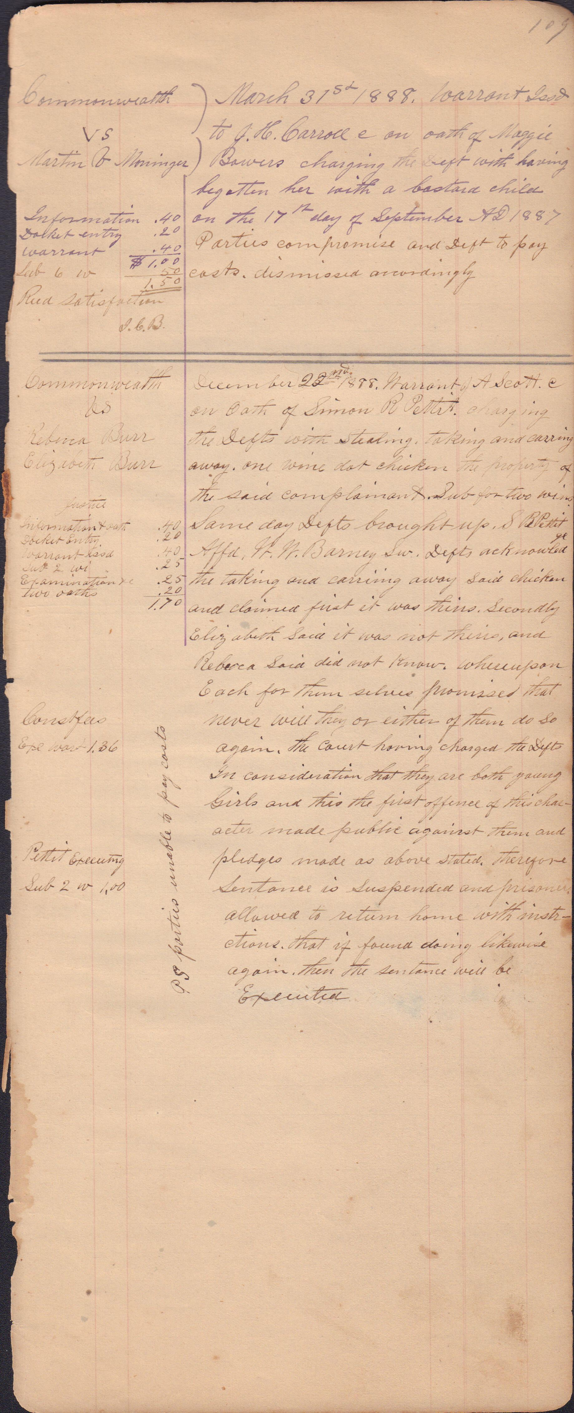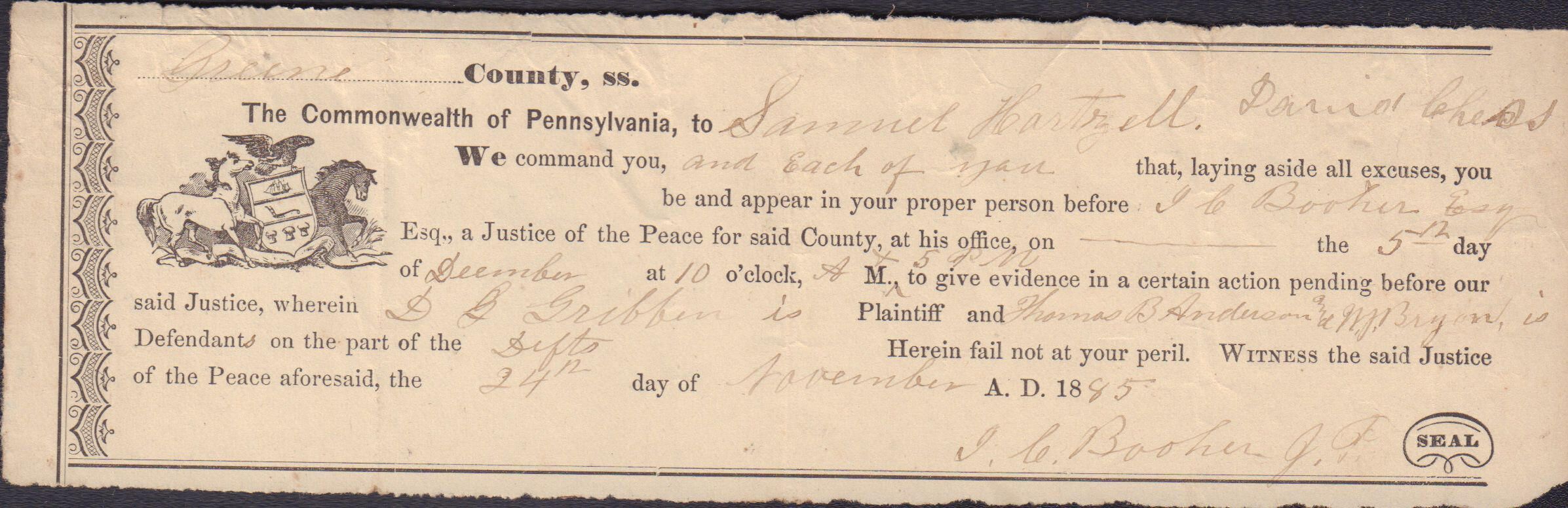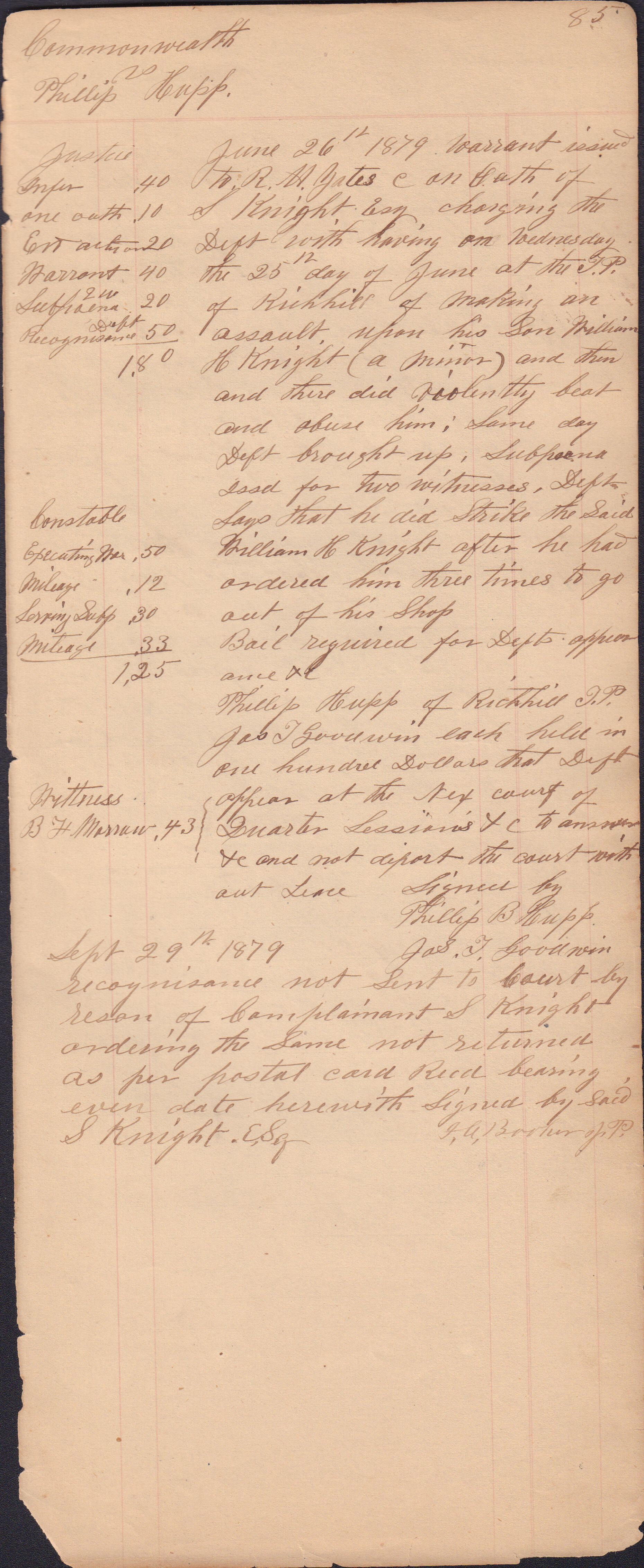 Source Citation: I. C. Booher and G. W. Smith, Justice of the Peace Docket, docket entries 1870s-1900s, Richhill Township, Greene County, Pennsylvania; held by Greene County Clerk of Court's Office, Courthouse, Waynesburg, Pennsylvania, 2016, item no. GCCH-AN003-0003-0000, Greene County Courthouse Collection, Greene Connections Archives Project (www.GreeneConnections.com).