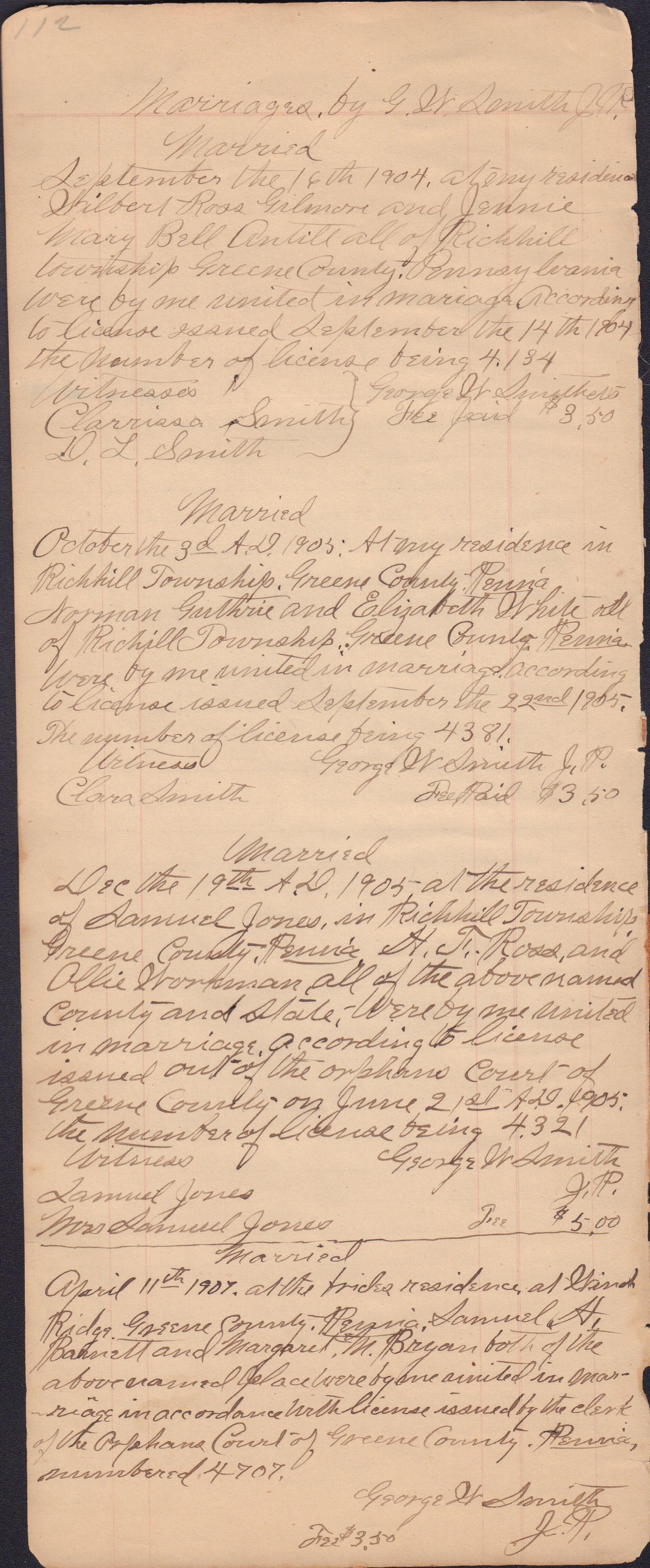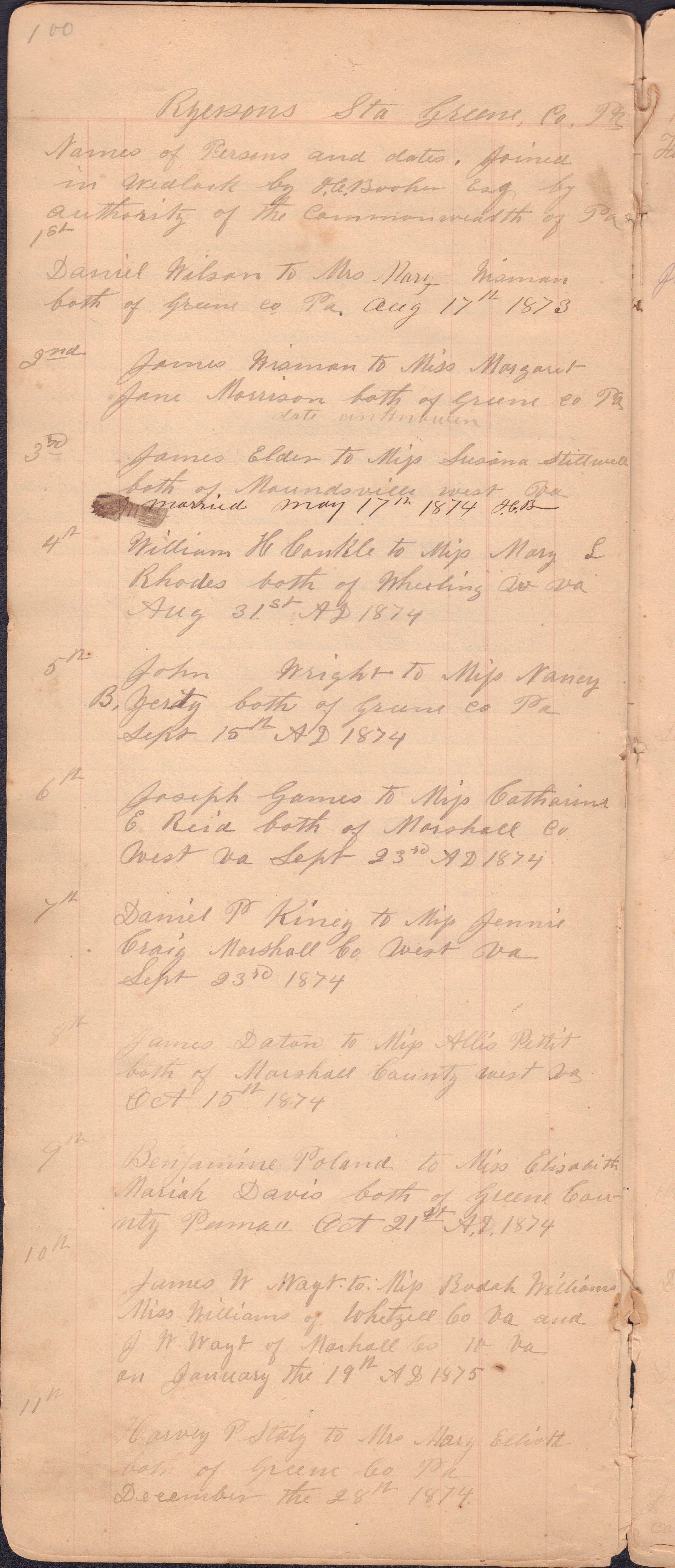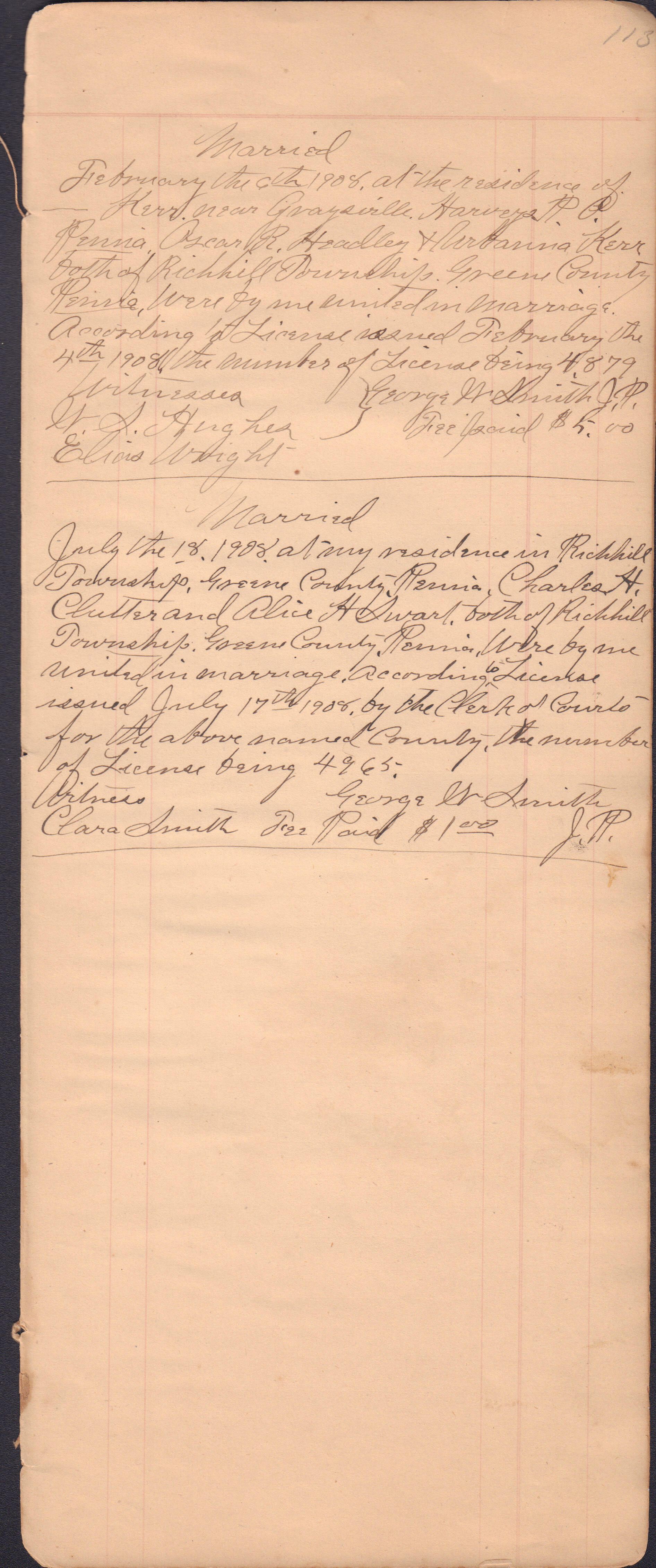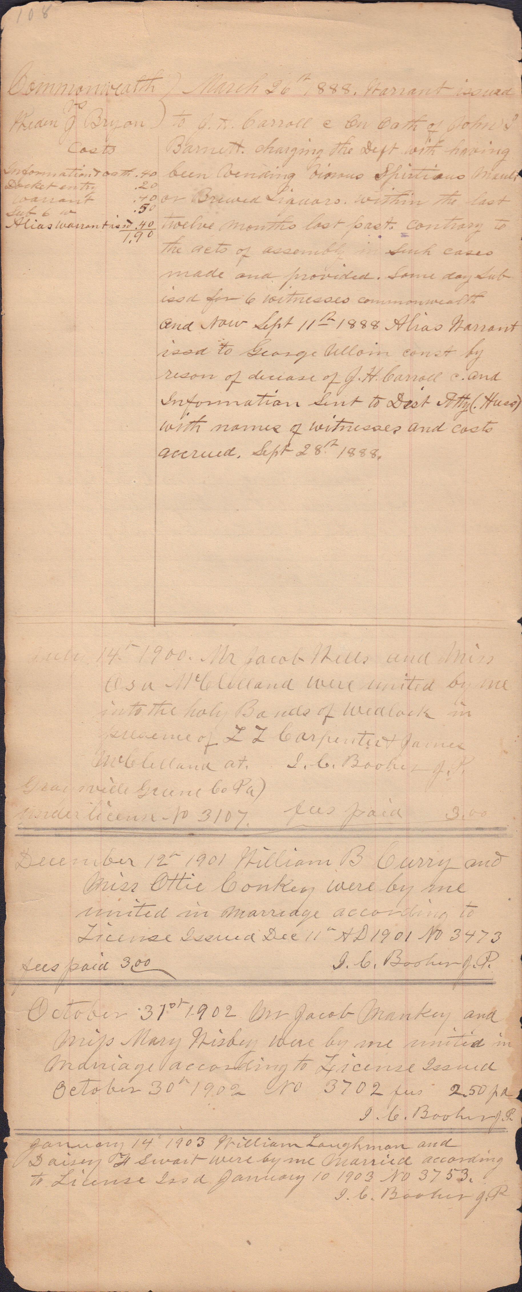 Donated to the Greene County Clerk of Courts Office, Courthouse, Waynesburg, Pennsylvania. No record of donor maintained. It appears that the docket book was passed down from one JP to the next, thus covering a large span of years and including entries from more than one person. I. C. Booher frequently identifies himself in the context of the marriages he performed, as well as in regard to in some of his criminal file entries. Likewise, G. W. Smith is identified as the JP to perform a list of the later marriage entries.