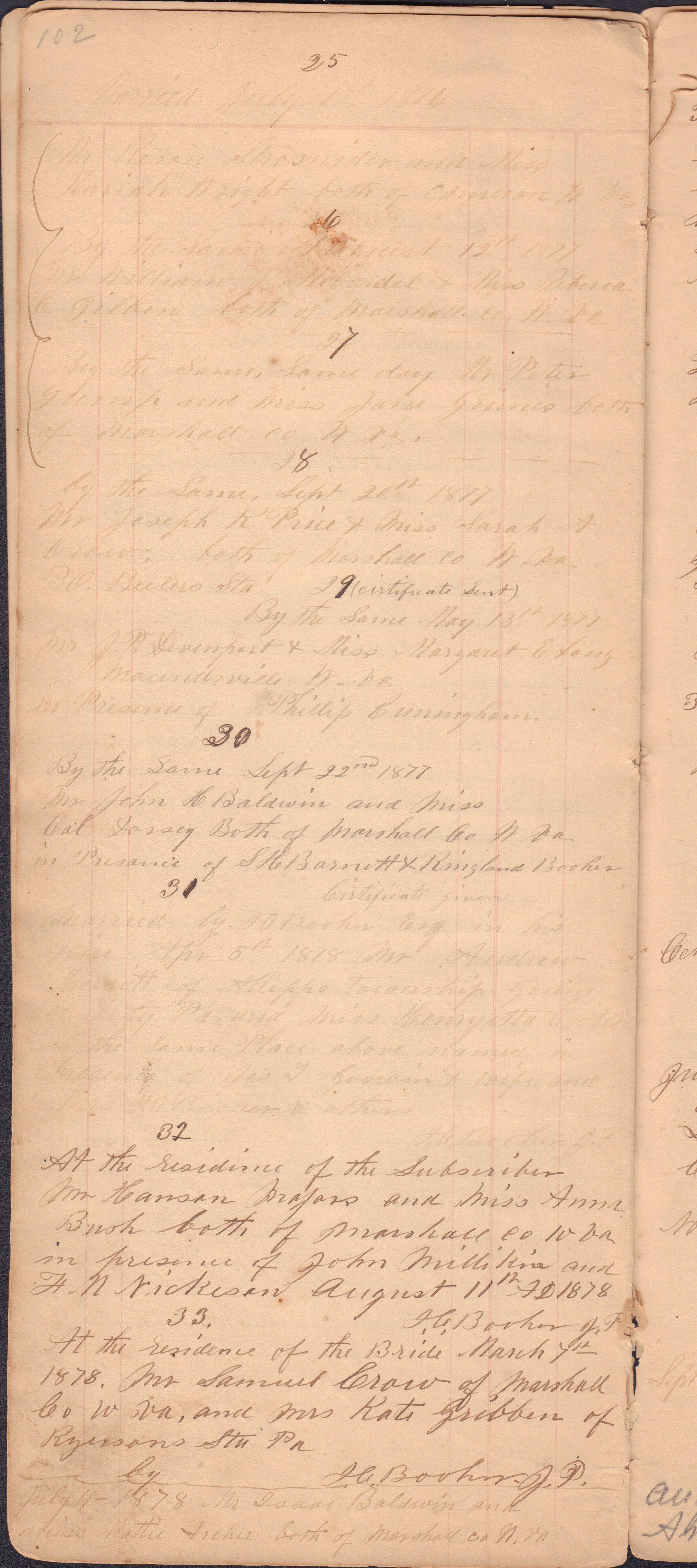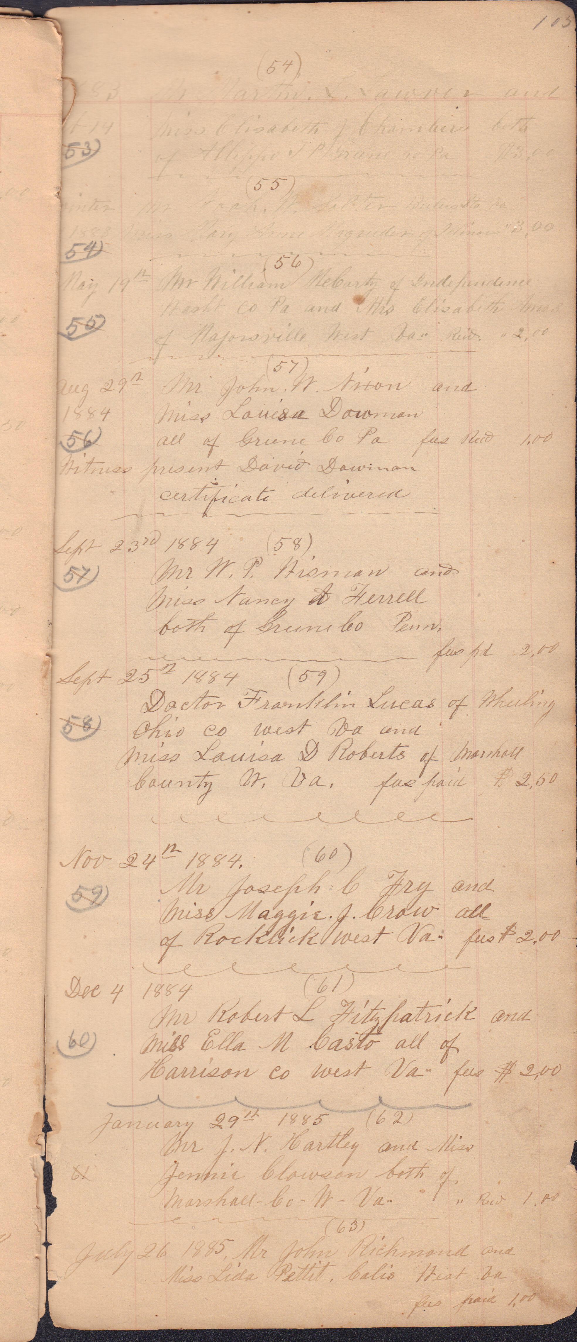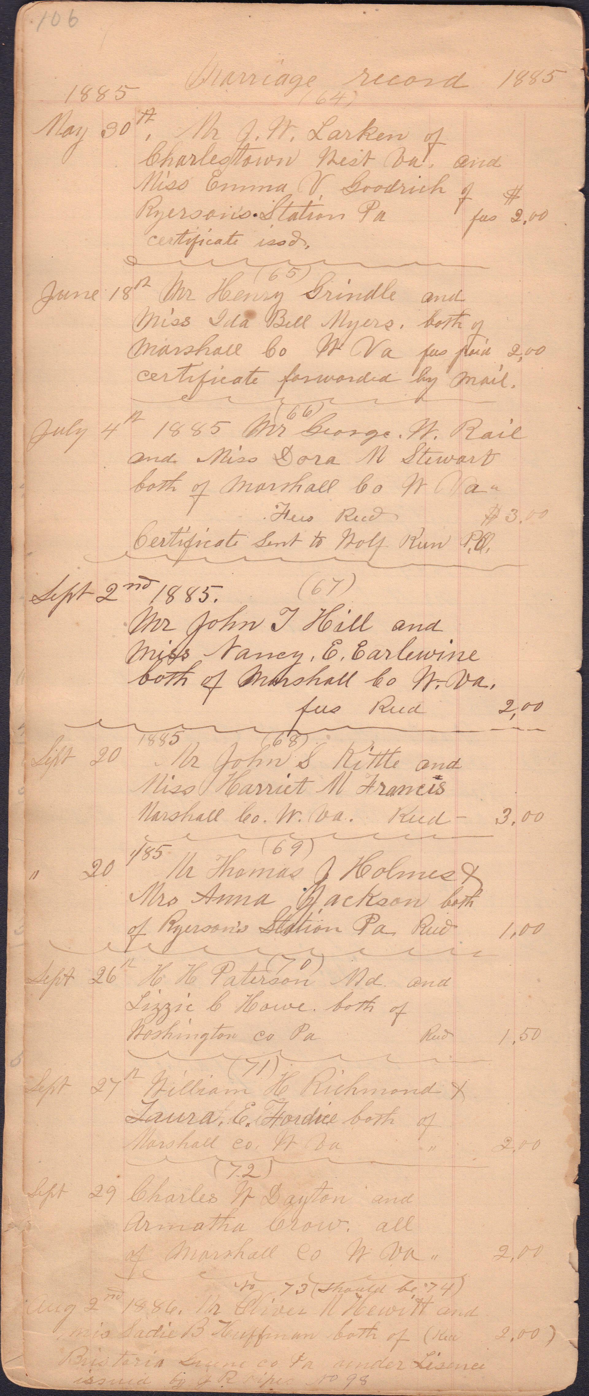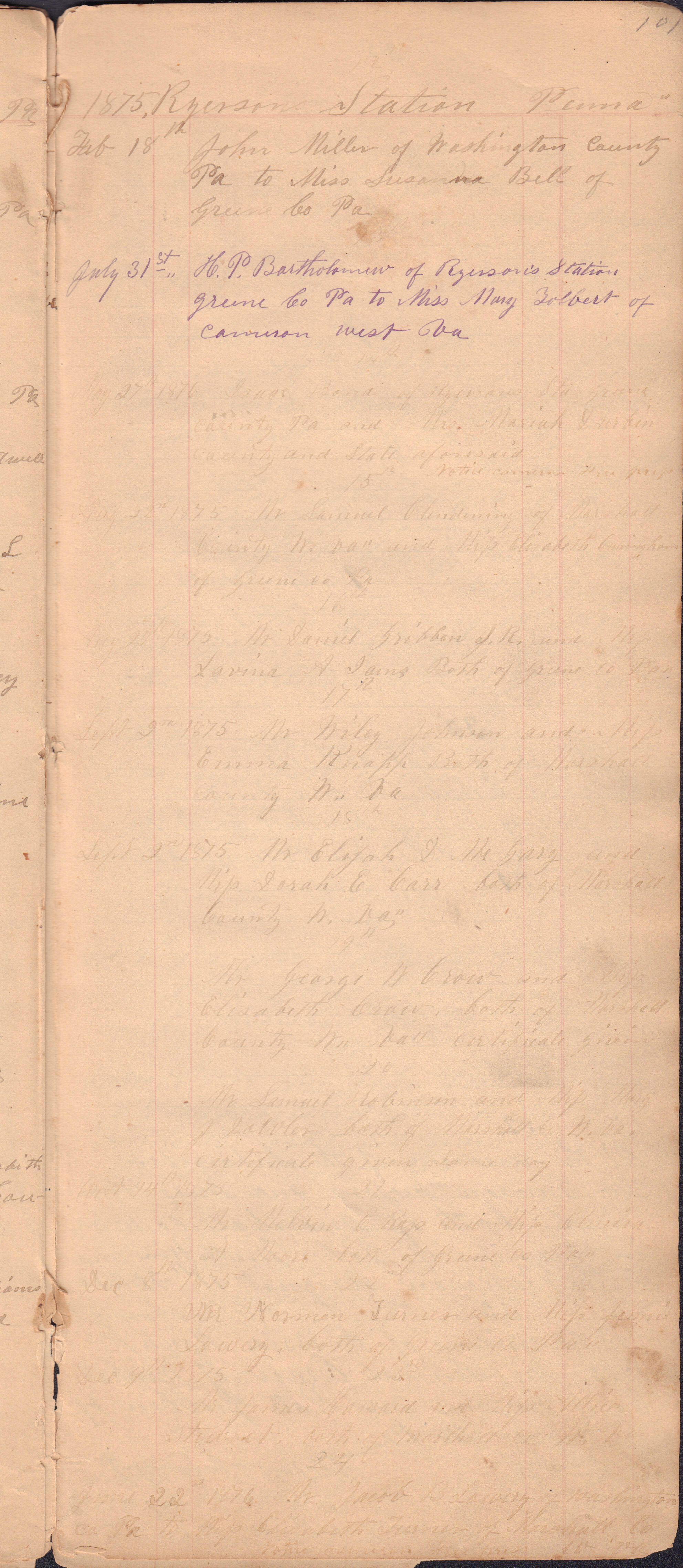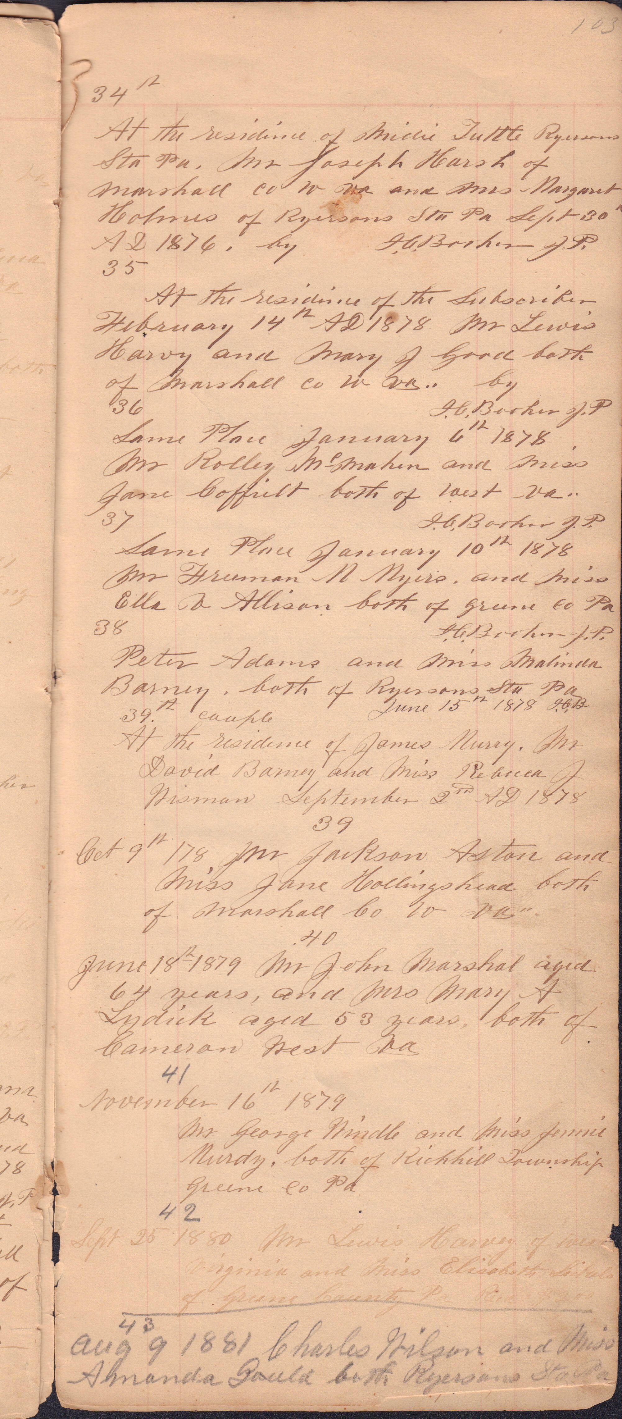 Donated to the Greene County Clerk of Courts Office, Courthouse, Waynesburg, Pennsylvania. No record of donor maintained. It appears that the docket book was passed down from one JP to the next, thus covering a large span of years and including entries from more than one person. I. C. Booher frequently identifies himself in the context of the marriages he performed, as well as in regard to in some of his criminal file entries. Likewise, G. W. Smith is identified as the JP to perform a list of the later marriage entries.