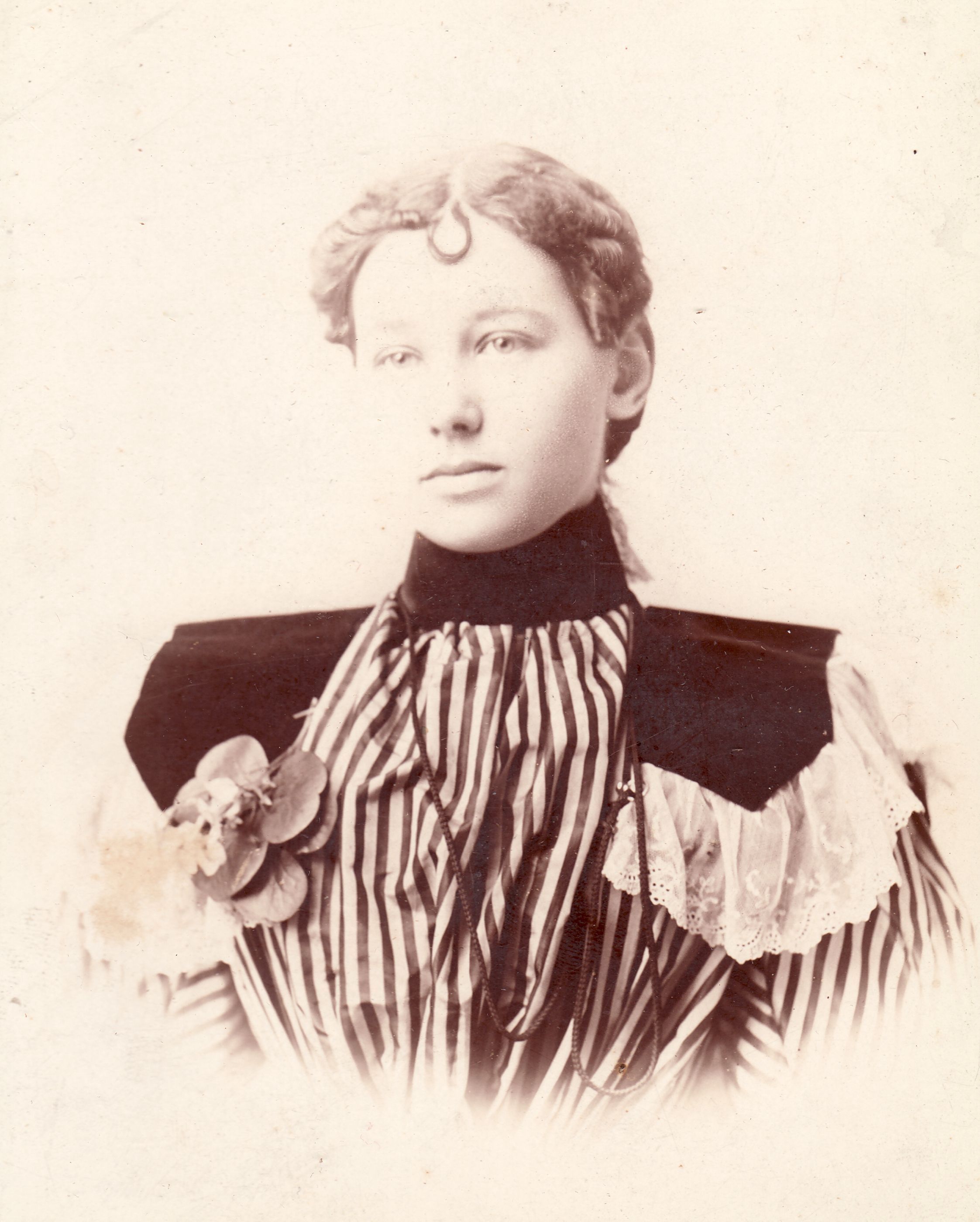 SOURCE CITATION: Katherine Jane "Kittie" (Meek) Nee [1880-1948]; circa 1895-1900, image by Frank M. Sellers Home Gallery, Waynesburg, Pa.; item no. SMIT-AN001-0021, Carrie Belle (Stewart) Smith Collection, shared by Amy Smith; Greene Connections Archives Project (GreeneConnections.com).