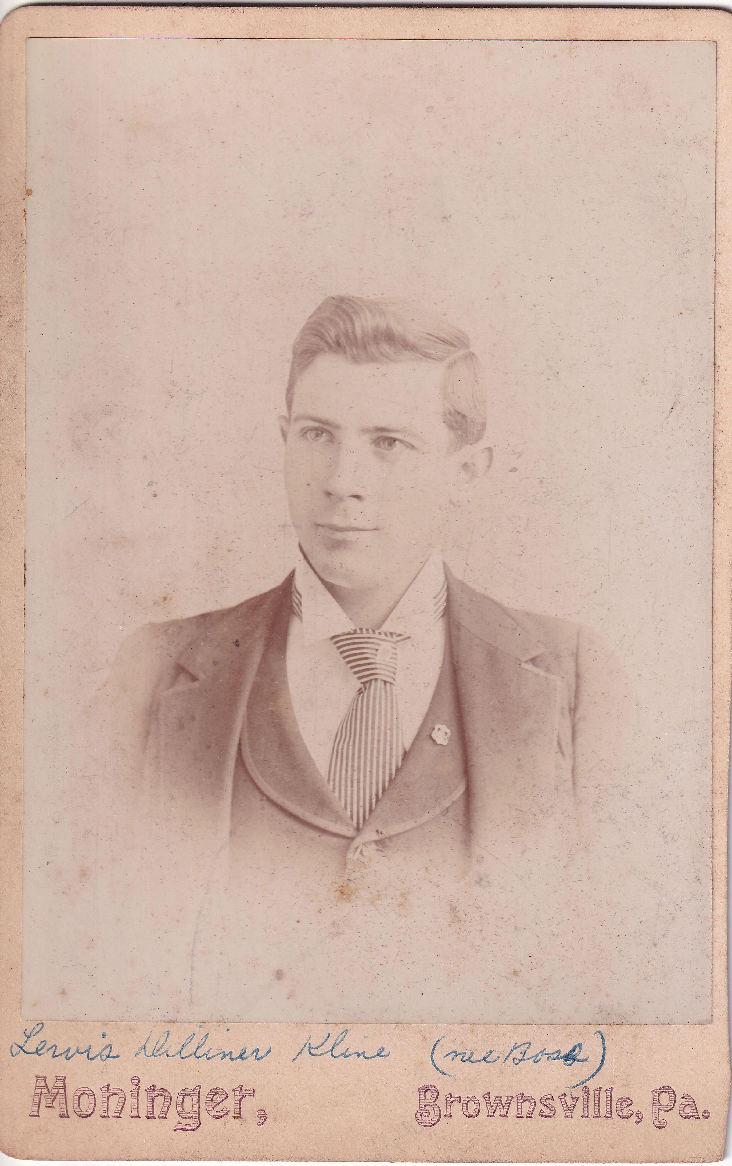 SOURCE CITATION: Kline-Moredock Album 01, Photo 01 - Lewis Dillinger Kline [1872-1952]; circa 1890-1900, image by Moninger, Brownsville, Pa.; item no. MORE-AN004-0001, Ammons-Moredock Collection, Greene Connections Archives Project (www.GreeneConnections.com).