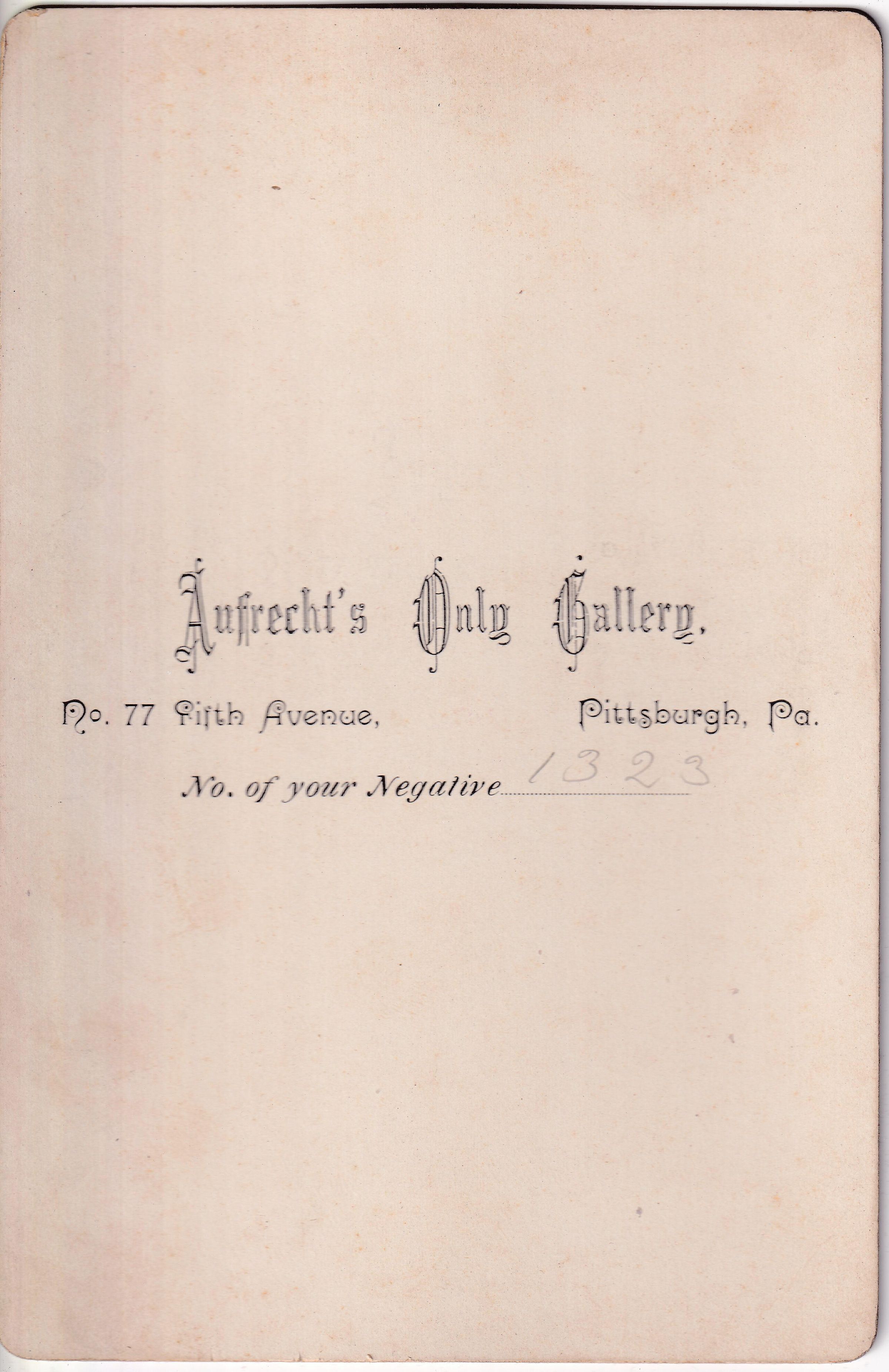 SOURCE CITATION: Kline-Moredock Album 01, Photo 27; circa 1880-1900, image by Aufrecht's Only Gallery, No. 77 Fifth Avenue, Pittsburgh, Pa.; item no. MORE-AN004-0027, Ammons-Moredock Collection, Greene Connections Archives Project (www.GreeneConnections.com).