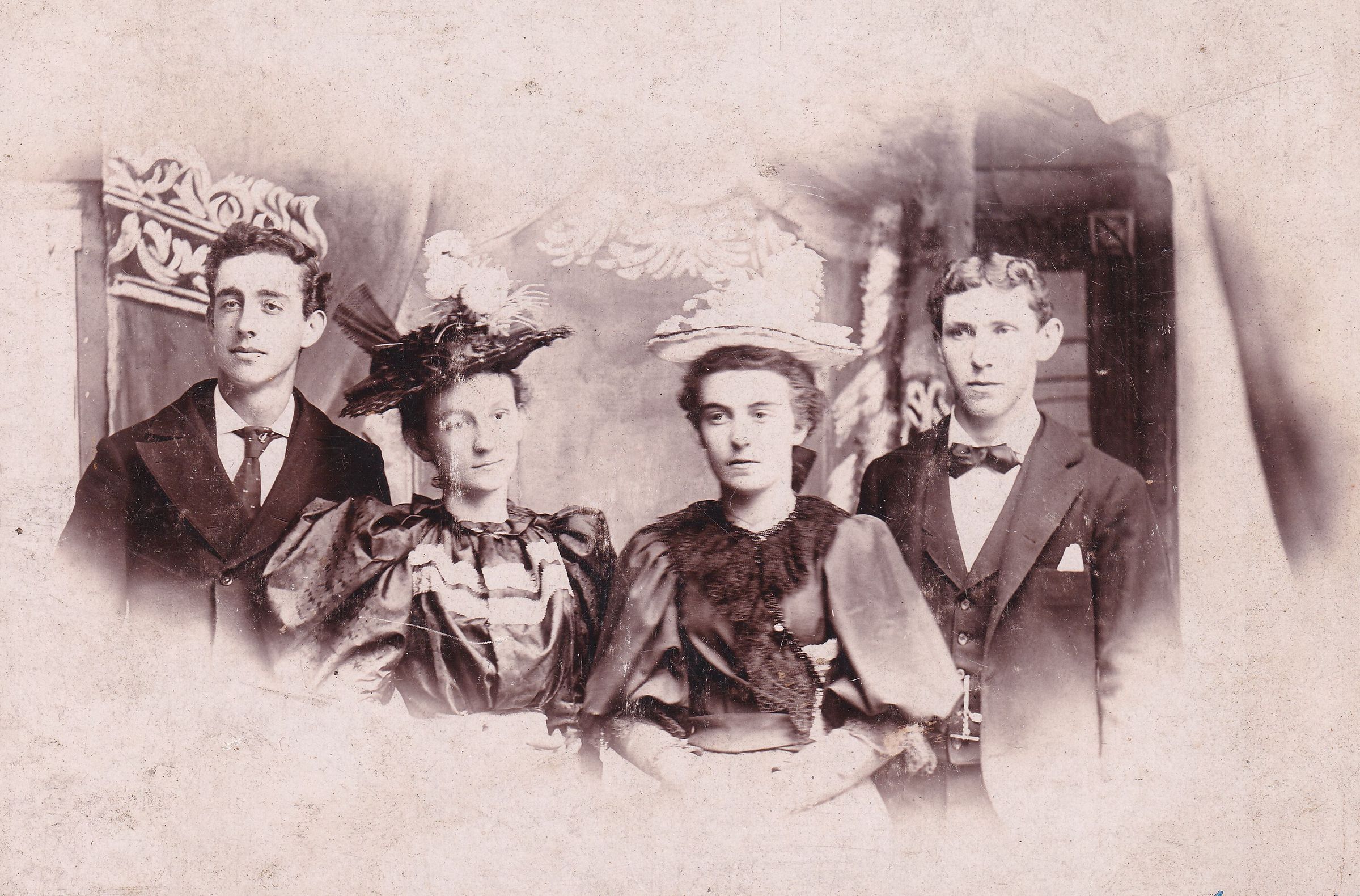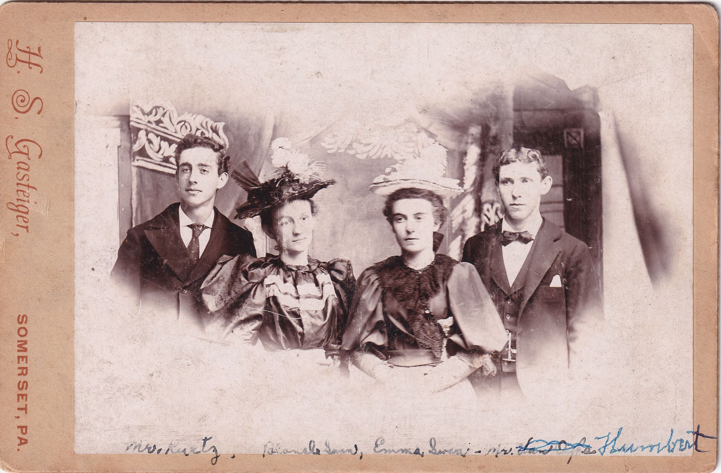 SOURCE CITATION: Caption on front of image reads, "Mr. Kurtz, Blanche Swan, Emma Swan, Mr. Humbert"; circa 1890-1900, image by H. S. Gasteiger, Somerset, Pa.; item no. RICL-AN003-0008, Miscellaneous Series, Rices Landing Lock and Dam No. 6 Museum Collection, Greene Connections Archives Project (www.GreeneConnections.com).