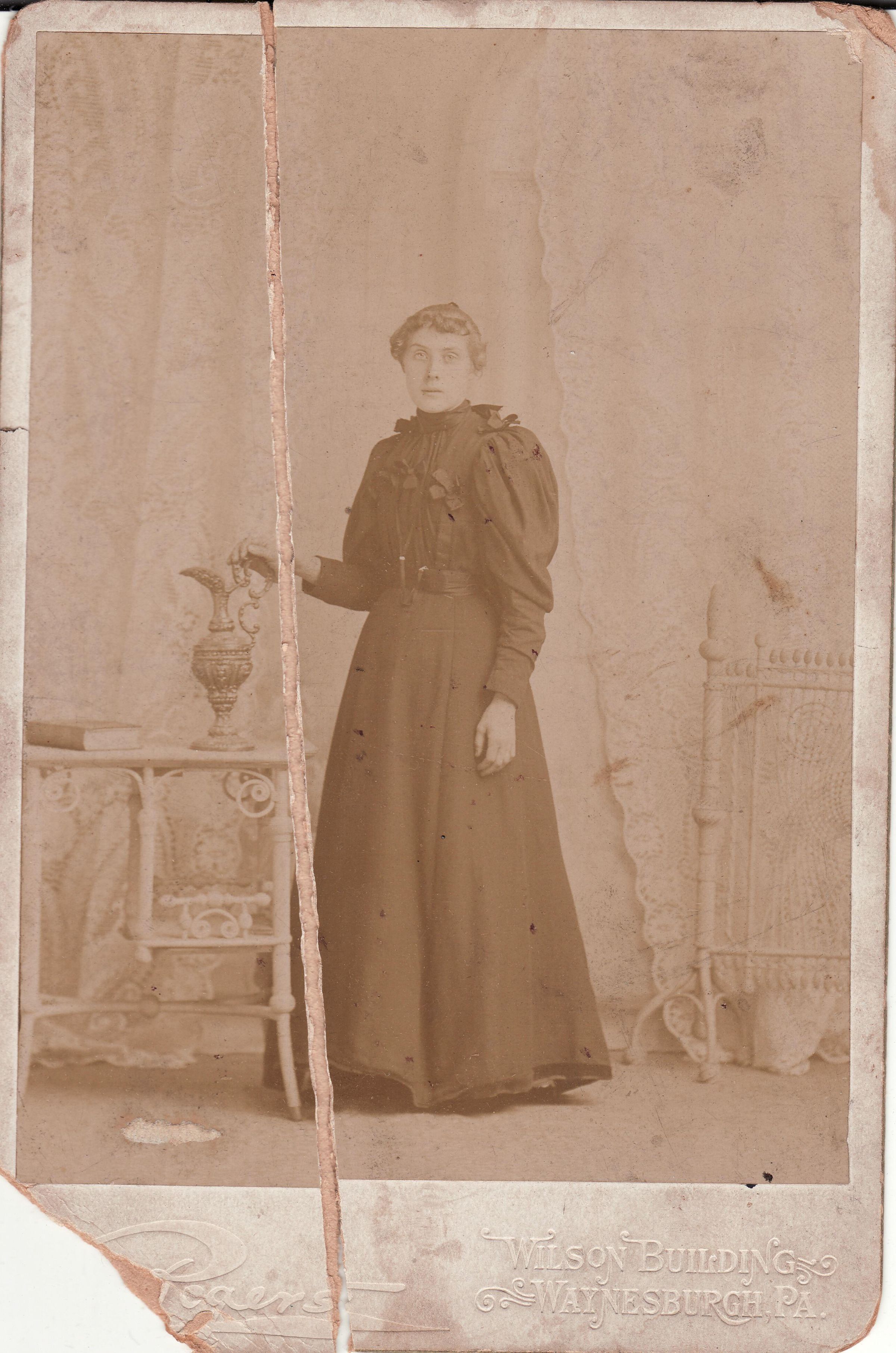 SOURCE CITATION: Laura Dessa Ardella (Swart) (Huffman) Hammers [1875-1957] - daughter of James Monroe Swart and Sarah Jane Allum; image by Rogers, Wilson Building, Waynesburgh, Pa., circa 1890-1900; item no. SUPL-AN003-0001, Swart Series, Wayne Carl Swart Collection, Greene Connections Archives Project (www.GreeneConnections.com).