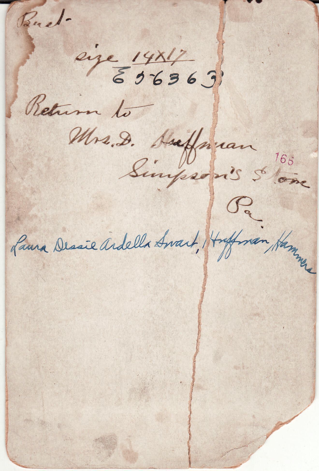 There are two handwritten captions on the reverse of the cabinet card. The first appears to be an order for an enlargement, it reads, "Size 14x17 / Return to Mrs. D. Huffman, Simpson's Store, Pa. The second, added in a different ink and hand, reads, "Laura Dessie Ardella Swart Huffman Hammers."