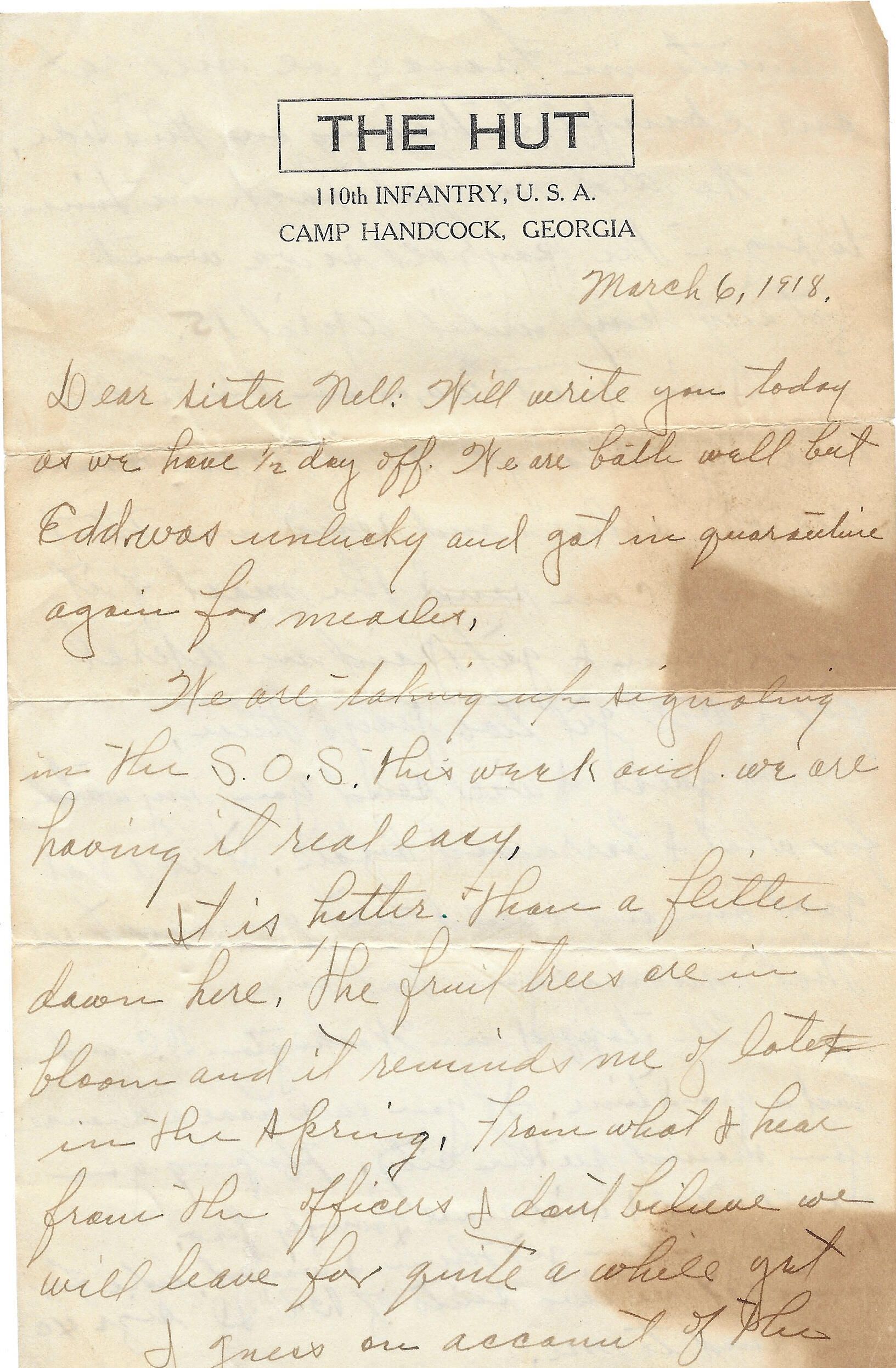 Leo wrote the letter home to his sister Mary Eleanor "Nellie" McNicholas, while both he and his brother Edward were in military training at Camp Hancock, Georgia, ahead of shipping out to the battlefields of France 3 May 1918 with Company K, 110th Infantry, 28th Division.