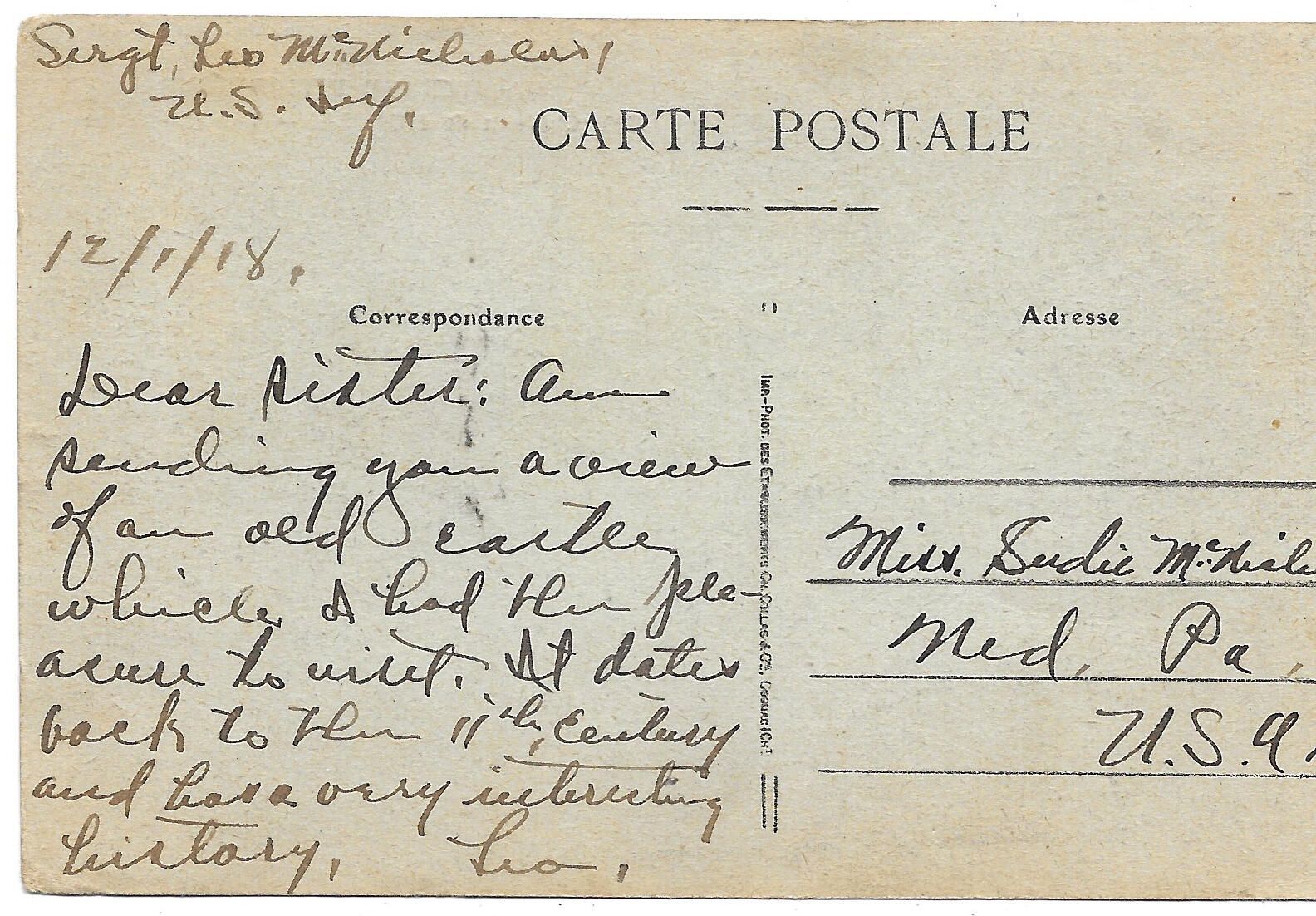 Leo McNicholas (France), to Sudie McNicholas (Ned, Pennsylvania), postcard, 1 December 1918; privately held by Joseph McNicholas, 2018.