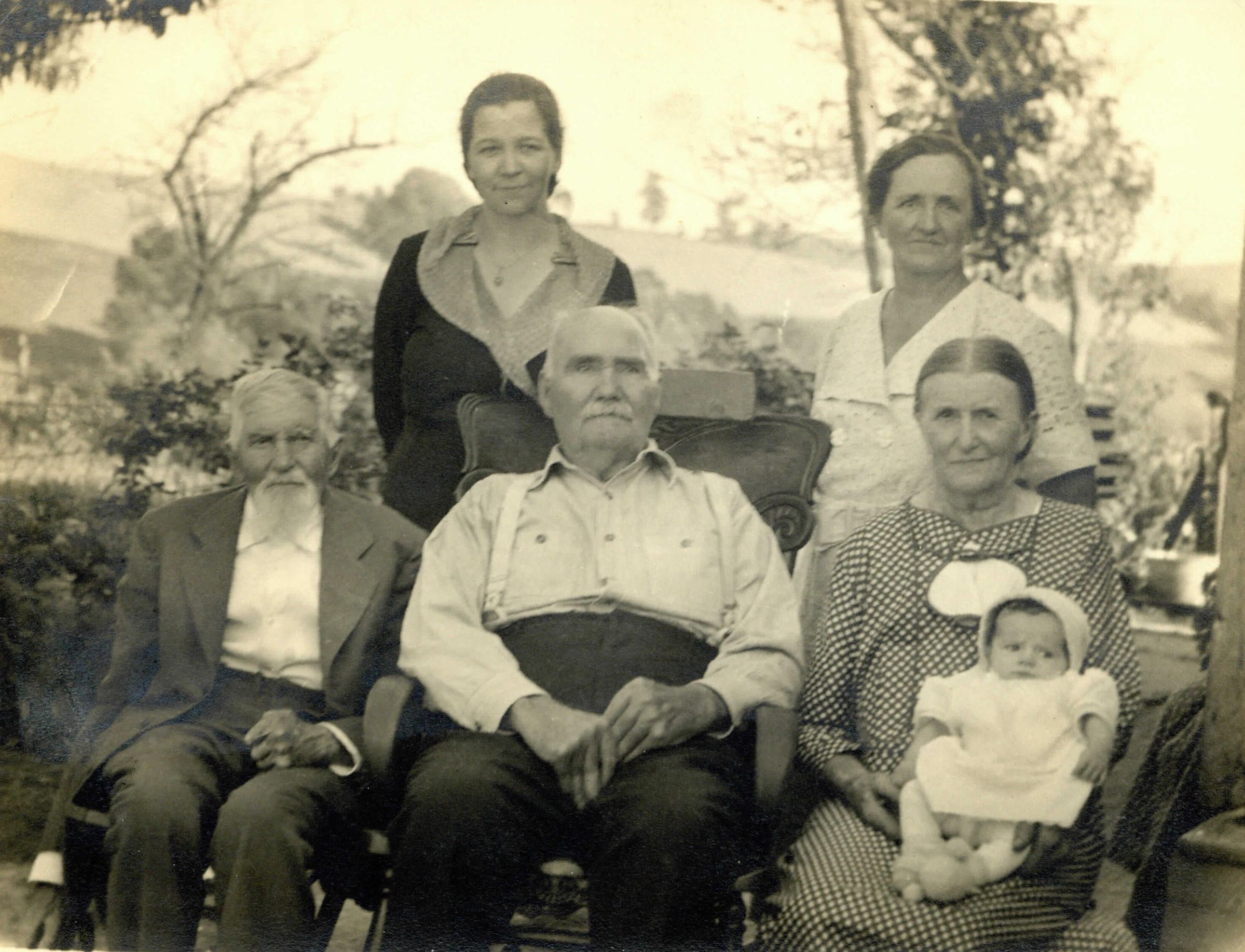 Source Citation: Dated 1936, BACK ROW - Irene Marie (Morgan) McVay [1911-2001], Jessie May (Fletcher) Morgan [1887-1988], FRONT ROW - John Christian Lough [1844-1939], Thomas Frazier Fletcher [1857-1937], Eliza Anna (Lough) Fletcher [1865-1962] holding William Carroll McVay [1936-2012], item no. MCVA-AN005-0002, Rex and Irene Marie (Morgan) McVay Collection, shared by Lisa (McVay) Hook, Greene Connections Archives Project (www.GreeneConnections.com).