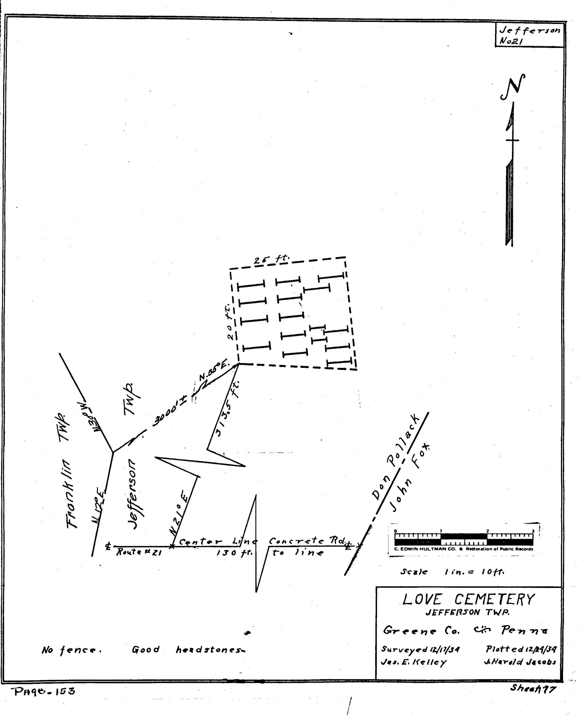 SOURCE CITATION: WPA Cemetery Plat - Pennsylvania - Greene County - Jefferson Township - Love Cemetery (1934); item no. 2016.3.393, Cemetery Plat (WPA) Collection, surveyed by Works Projects Administration, copy on file at the Clerk of Courts Office, Greene County Courthouse; Greene Connections Archives Project (GreeneConnections.com).
