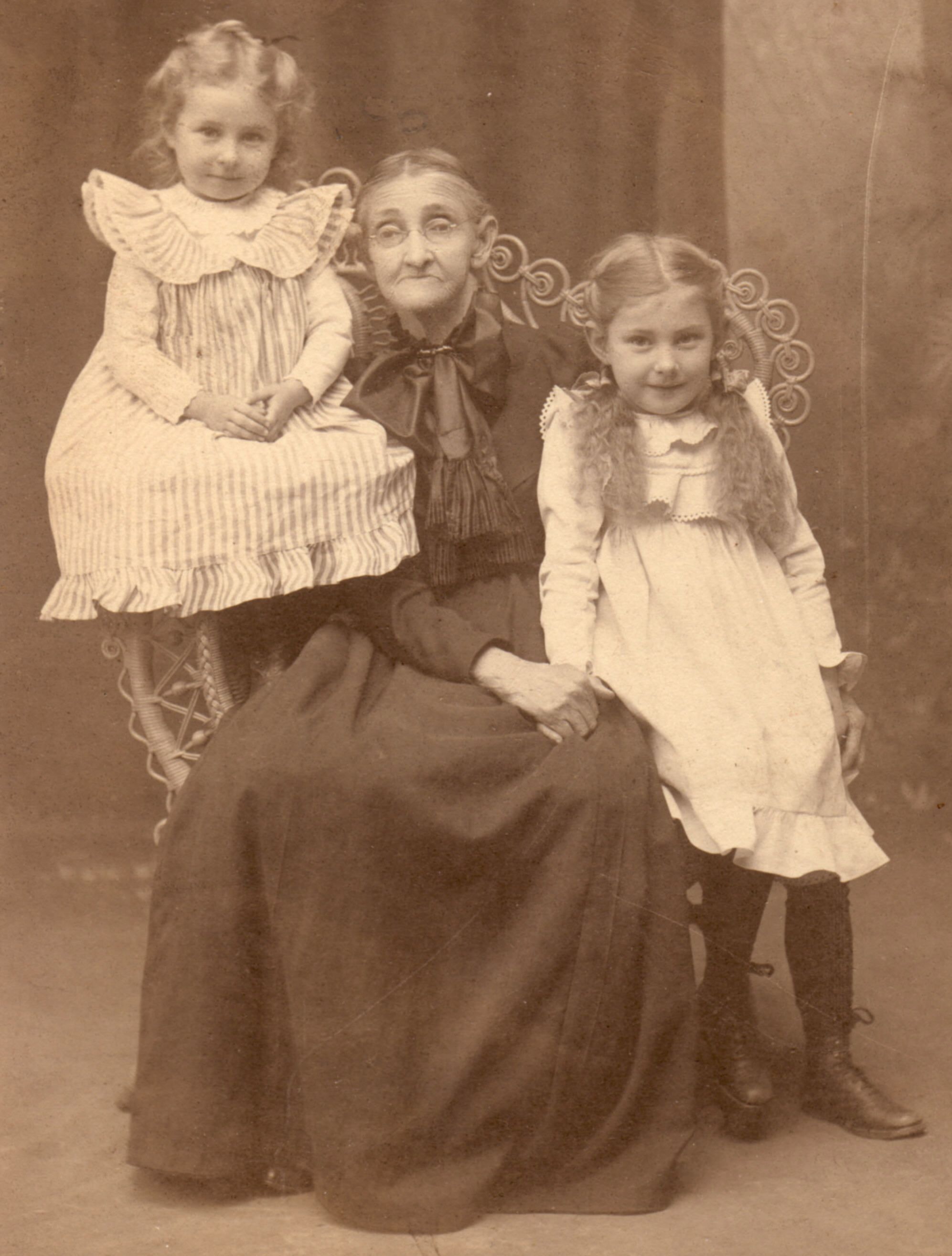 [Left-Right]: Lucy Beach (Elms) Dille, Mrs. Moore [a cousin, 76 years old], Sarah Virginia (Elms) Simpson.