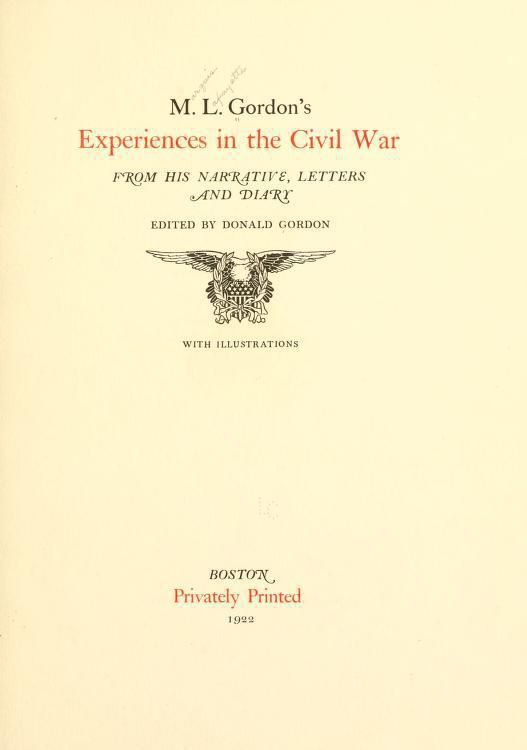 SOURCE CITATION: Marquis Lafayette Gordon, M.L. Gordon's Experiences in the Civil War: From His Narrative, Letters and Diary (Boston, Privately printed: 1922); digital images, Library of Congress (https://www.loc.gov/item/24003705/ : accessed 2024).