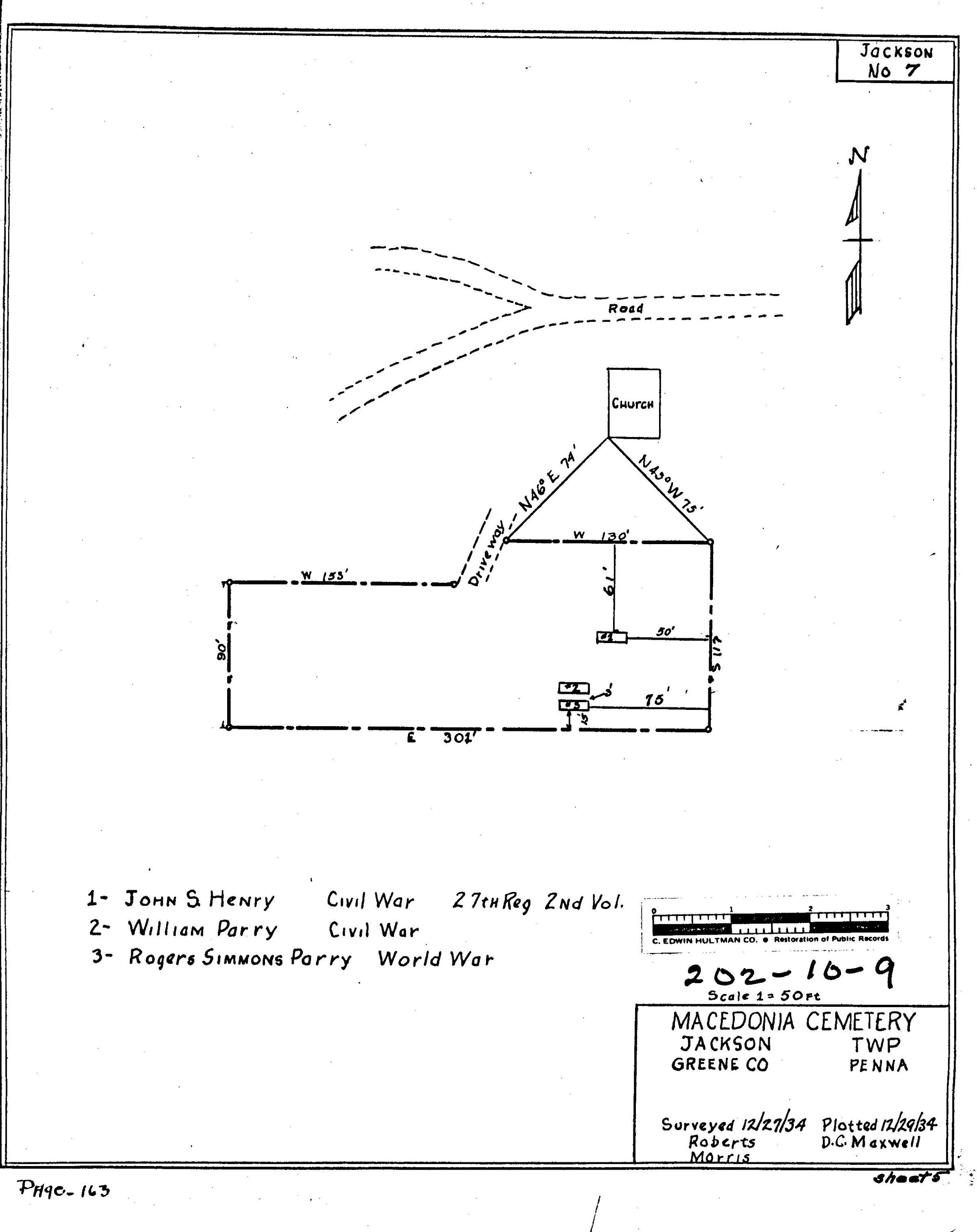SOURCE CITATION: WPA Cemetery Plat - Pennsylvania - Greene County - Jackson Township - Macedonia Cemetery (1934), item no. 2016.3.227, Cemetery Plat (WPA) Collection, surveyed by Works Projects Administration, copy on file at the Clerk of Courts Office, Greene County Courthouse, Greene Connections Archives Project (GreeneConnections.com).