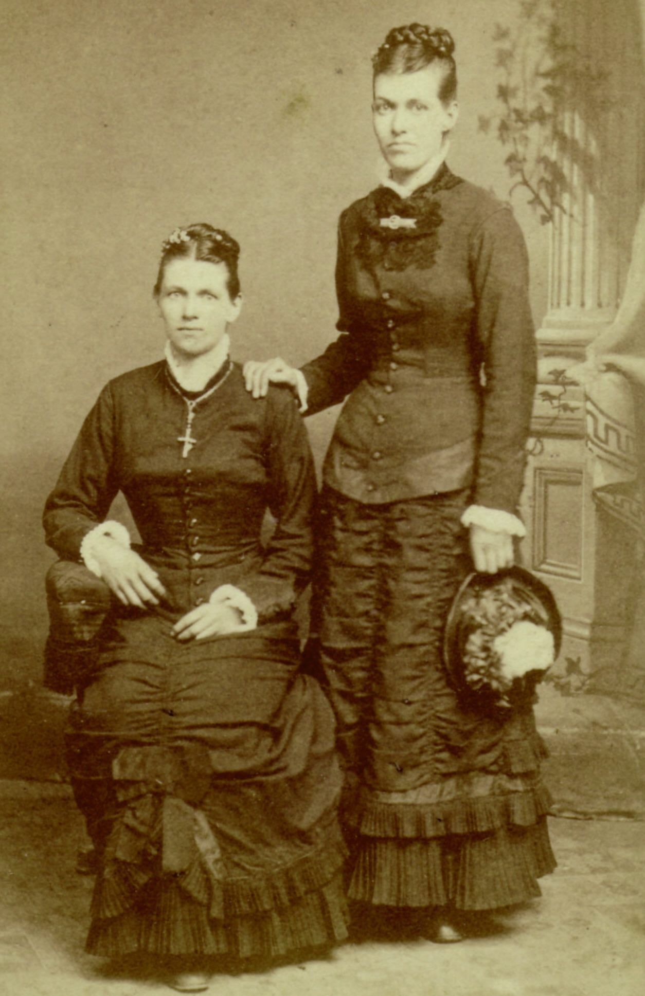 Identification of Maria (Kent) Thomas [1846-1917] was accomplished by comparison with identified photos and analysis of genealogical research. The seated woman may be Maria's next elder sister, Elizabeth (Kent) Porter [1844-1884] of whom we do not yet have an identified photo to compare.