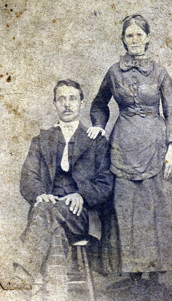 Source Citation: Marion Jasper Clovis [1849-1928] and his wife, Sarah Eliza (Eakin) Clovis [1852-1931], on their wedding day 14 February 1869, item no. HOYJ-AN002-0007, Athaliah Frances (Clovis) Hoy Collection, shared by James Michael Hoy, Greene Connections Archives Project (www.GreeneConnections.com).