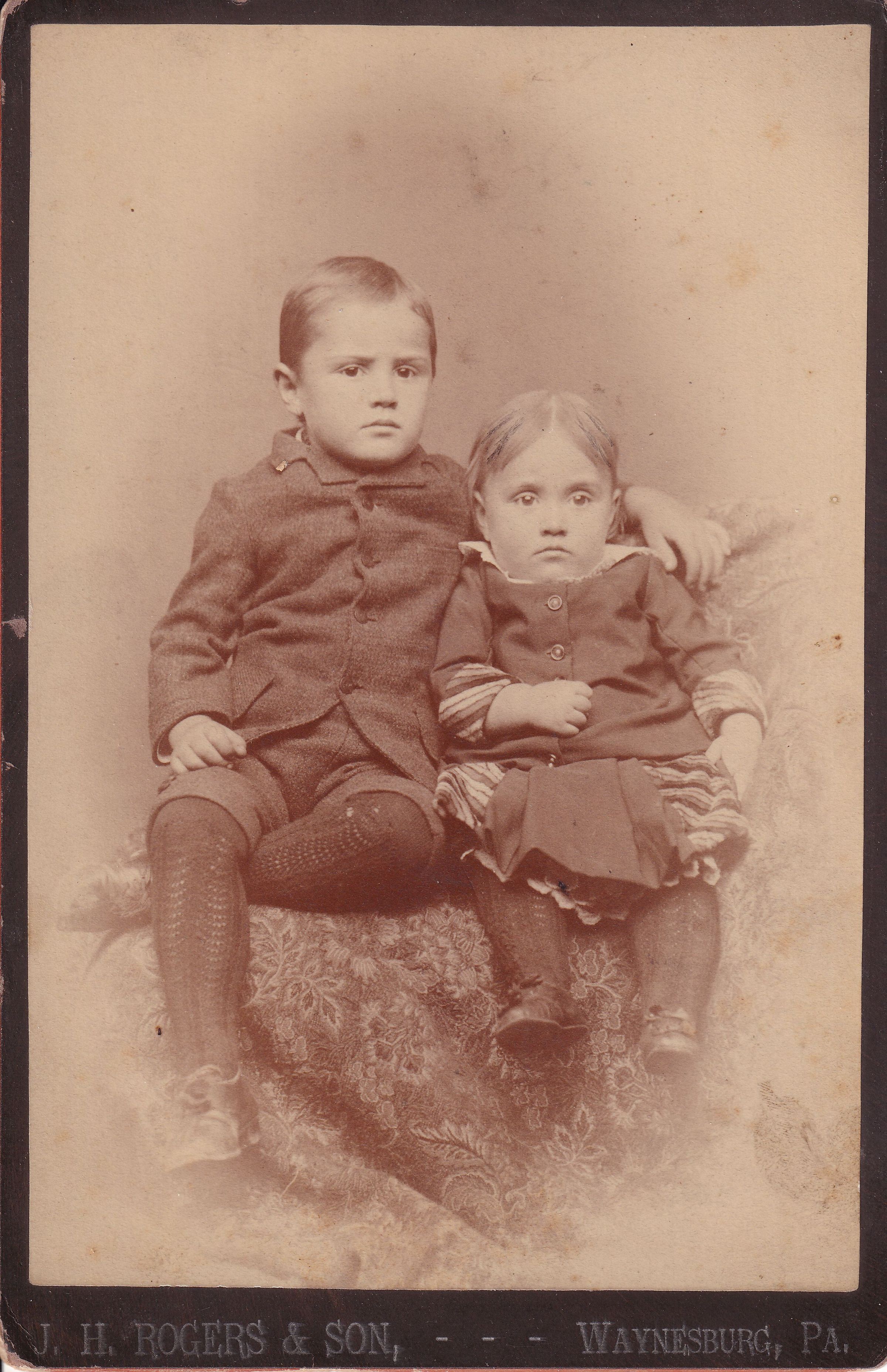 SOURCE CITATION: Mark Gordon Inghram [1880-1970] and Alice (Inghram) Hail [1883-1970] - children of Franklin Rinehart Inghram and Rebecca Elizabeth Inghram; circa 1885, image by J. H. Rogers & Son, Waynesburg, Pa.; item no. CGSP-AN016-0003, Frances Bell (Inghram) Huffman Series, donated by Cynthia Grant; Cornerstone Genealogical Society Collection; Greene Connections Archives Project (GreeneConnections.com).