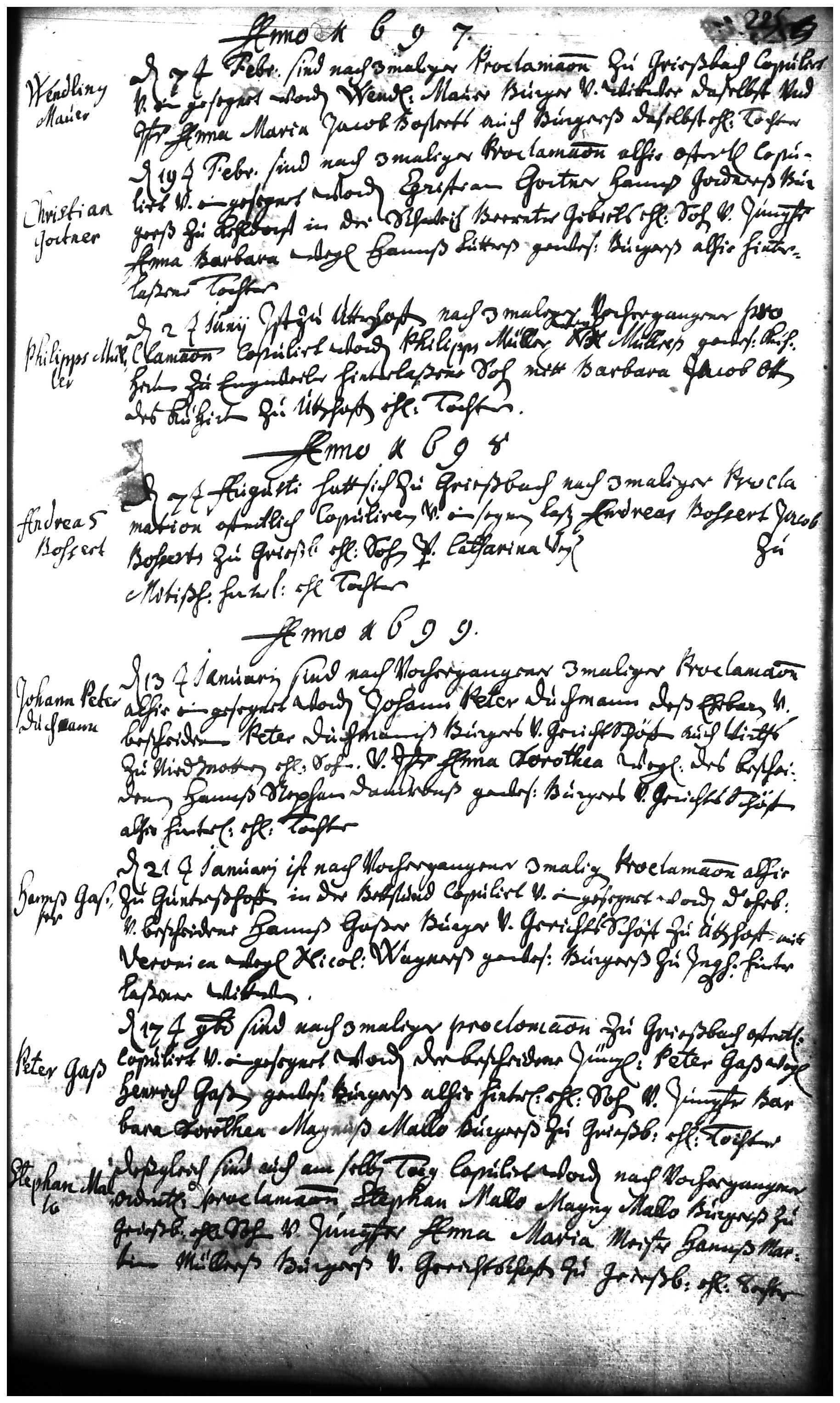 Married here on 13 January after three proclamations: Johann Peter Duchmann, legitimate son of Peter Duchmann, honorable and humble citizen and juryman, also innkeeper, in Niedermodern, and Anna Dorothea, young maiden, legitimate daughter of the deceased Hans Stephan Damron, former citizen and juryman here."Collection