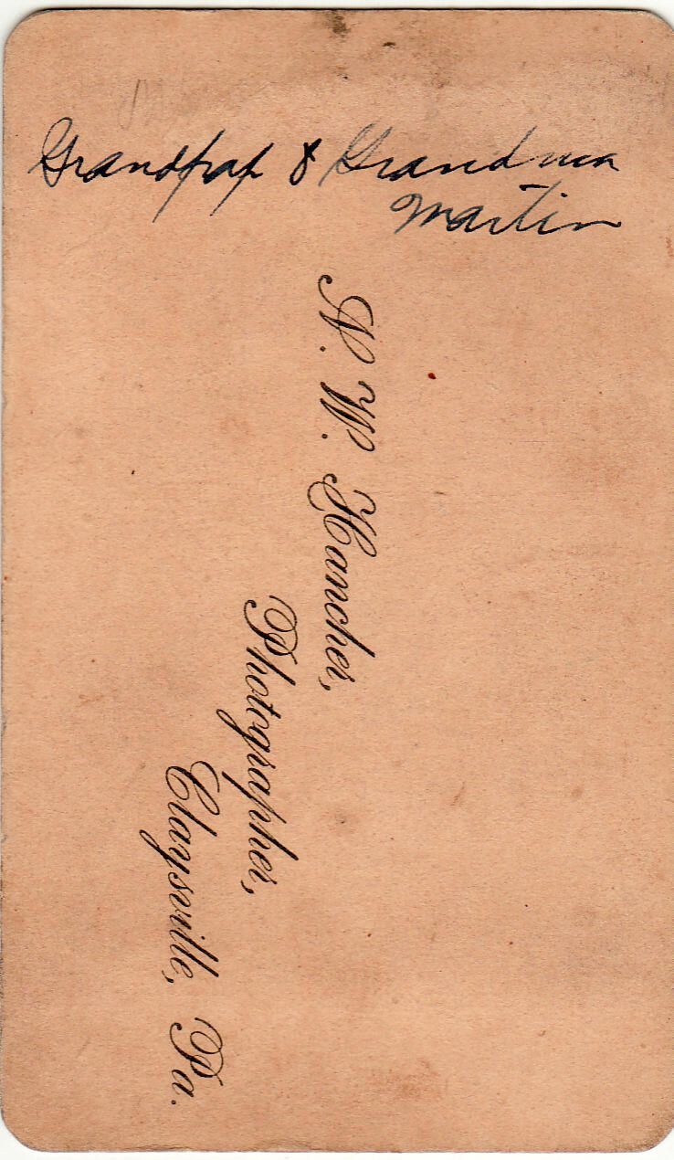 SOURCE CITATION: Carte-de-visite photograph; handwritten inscription reads, "Grandpap & Grandma Martin"; image by N. W. Hancher, Photographer, Claysville, Pa., circa 1865-1875; item no. SUPL-AN006-0001, Martin Series, Wayne Carl Swart Collection, Greene Connections Archives Project (www.GreeneConnections.com).