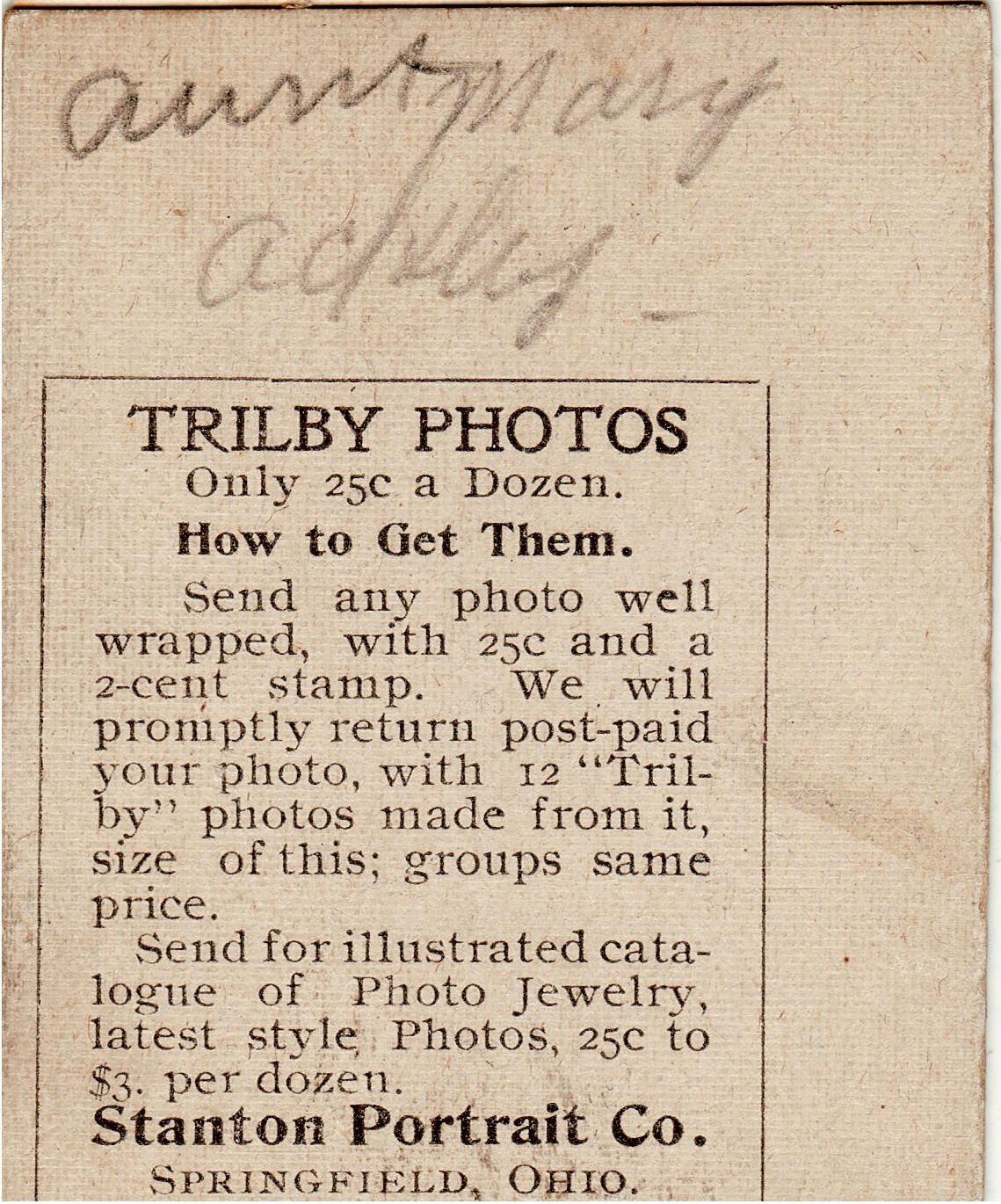This photograph was reproduced circa 1905, by Stanton Portrait Co., Springfield, Ohio. They were not the original photographers. They advertise, "Trilby Photos, Only 25 [Cents] a Dozen. / How to Get Them. / Send any photo well wrapped, with 25 [Cents] and a 2-cent stamp. We will promptly return post-paid your photo with 12 Trilby photos made from it...."Photograph Details