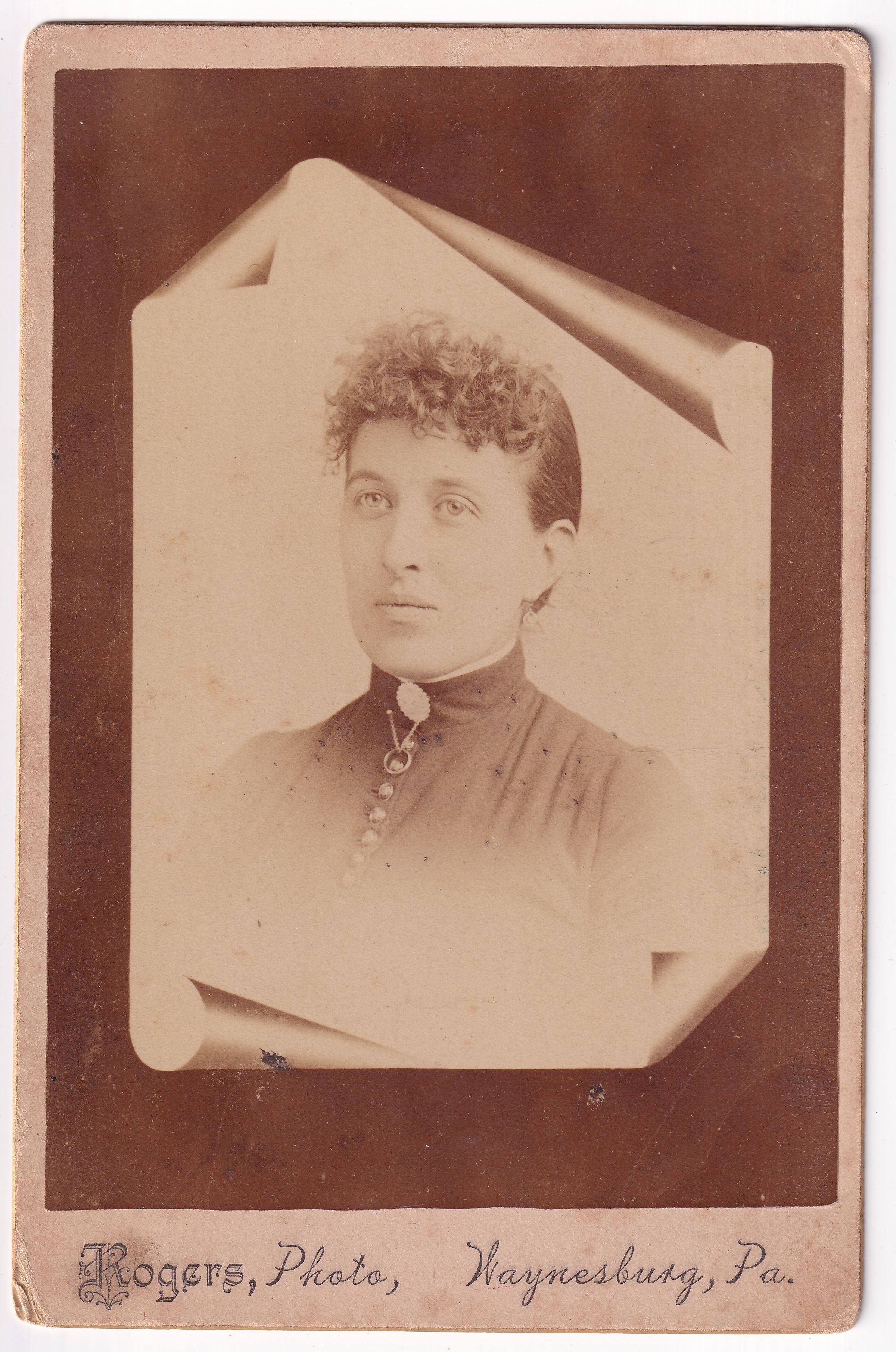 SOURCE CITATION: Believed to be Mary Ann (Gray) Conklin [1861-1926]; circa 1880-1890, image by Rogers, Photo, Waynesburg, Pa.; item no. CAND-AN007-0042, Candice Lynn Buchanan Collection, Greene Connections Archives Project (GreeneConnections.com).