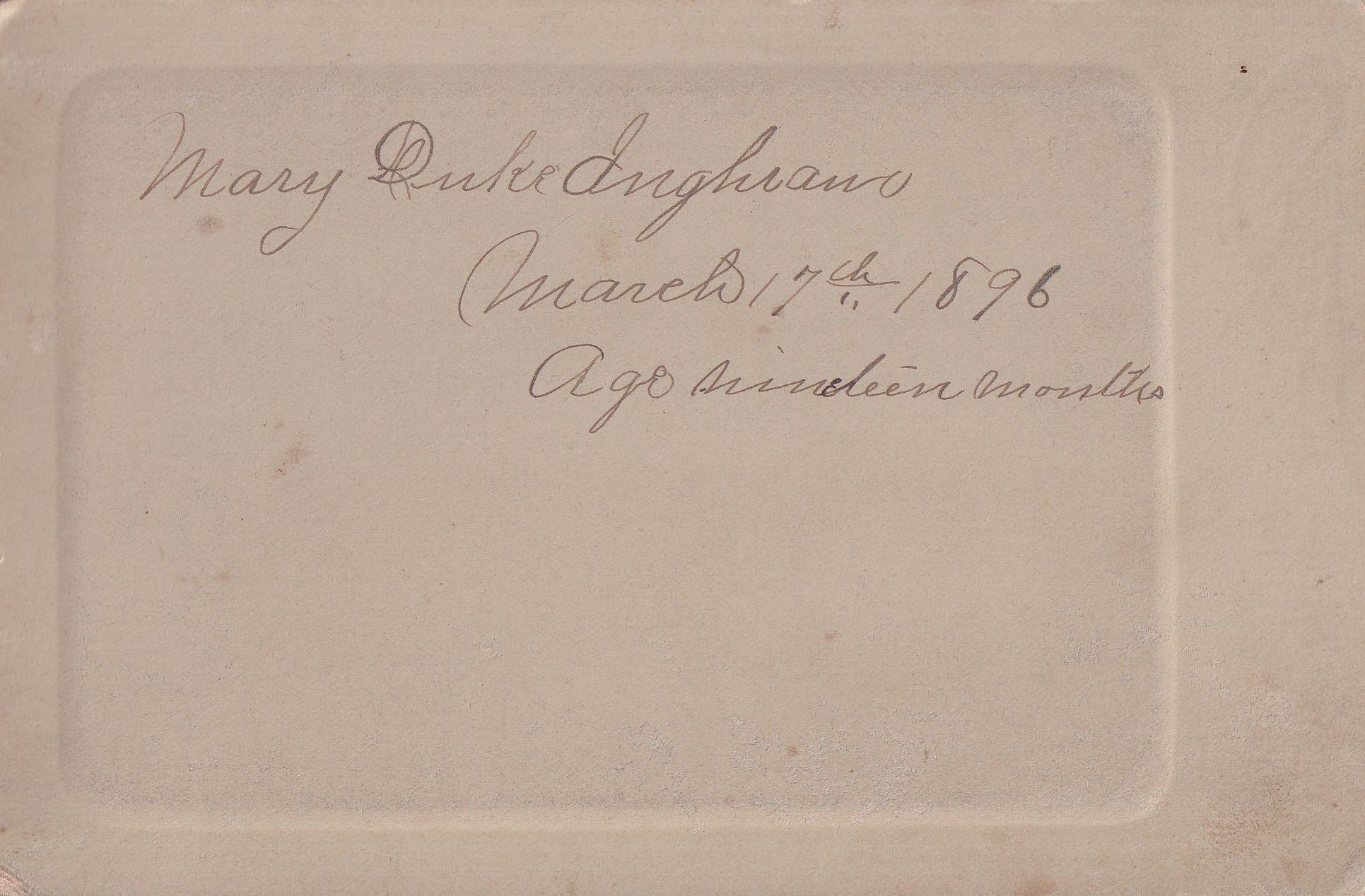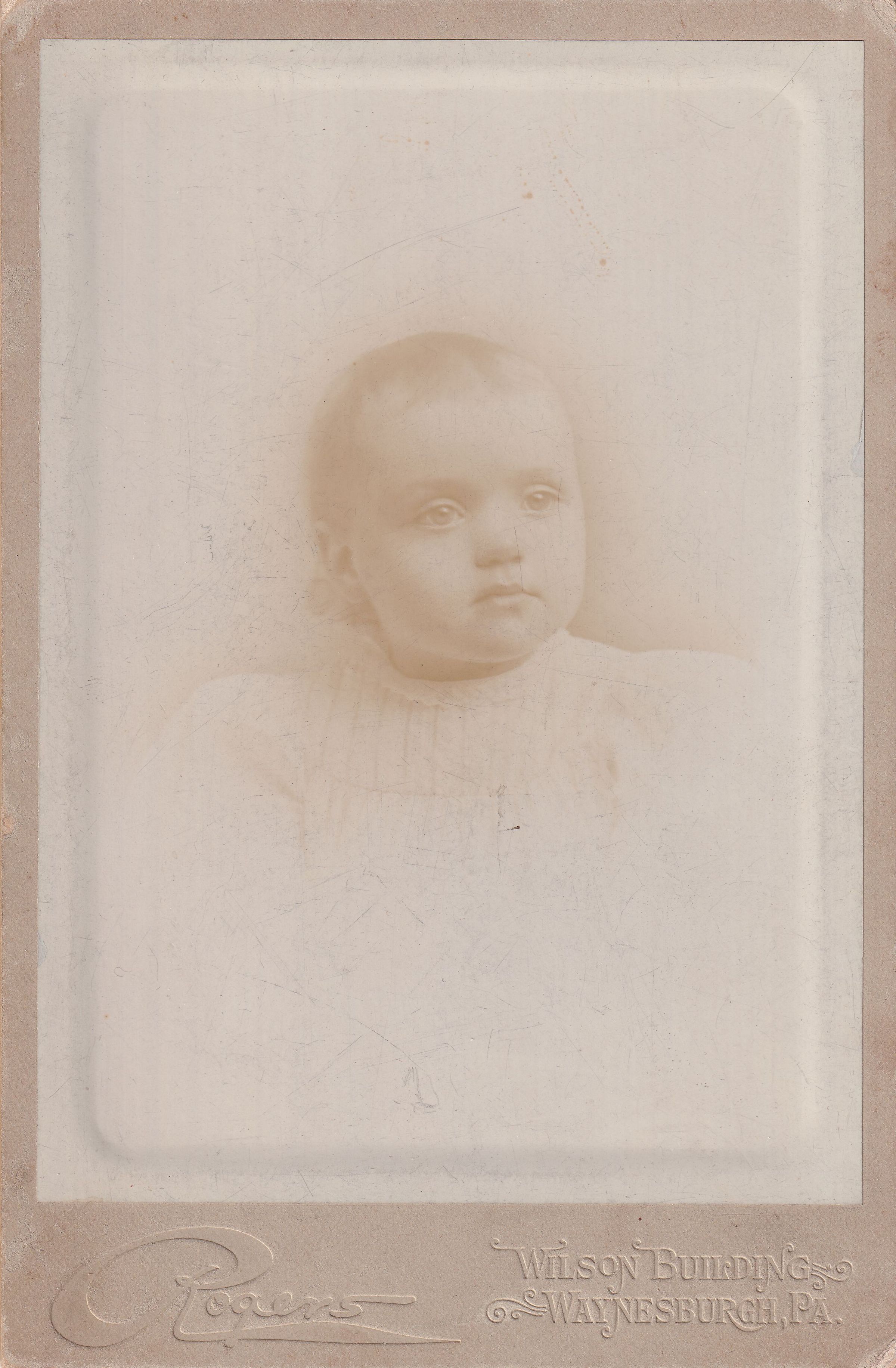 SOURCE CITATION: Mary Duke Inghram [1894-1988]; dated 17 March 1896, image by Rogers, Wilson Building, Waynesburgh, Pa.; item no. CGSP-AN016-0011, Frances Bell (Inghram) Huffman Series, donated by Cynthia Grant; Cornerstone Genealogical Society Collection; Greene Connections Archives Project (GreeneConnections.com).