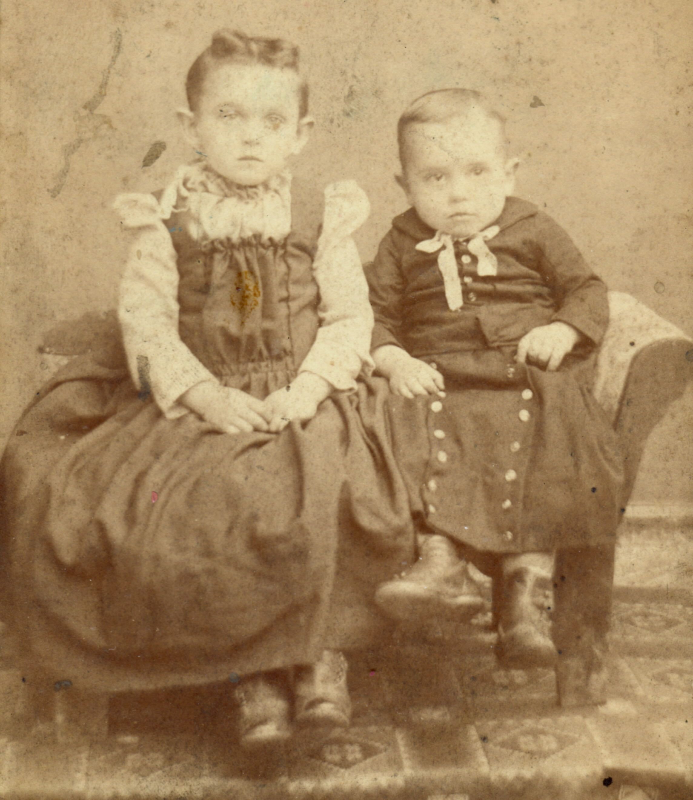 Source Citation: [Left-Right]: Mary "Mamie" (Throckmorton) Bonham and Robert Lawrence Throckmorton Sr. - children of William Harvey Throckmorton and Lucy Jane McGlumphy; circa 1890-1895; item no. TOOK_AN001_0007, Katherine Jane (Throckmorton) Toothman Collection; Greene Connections Archives Project (GreeneConnections.com).