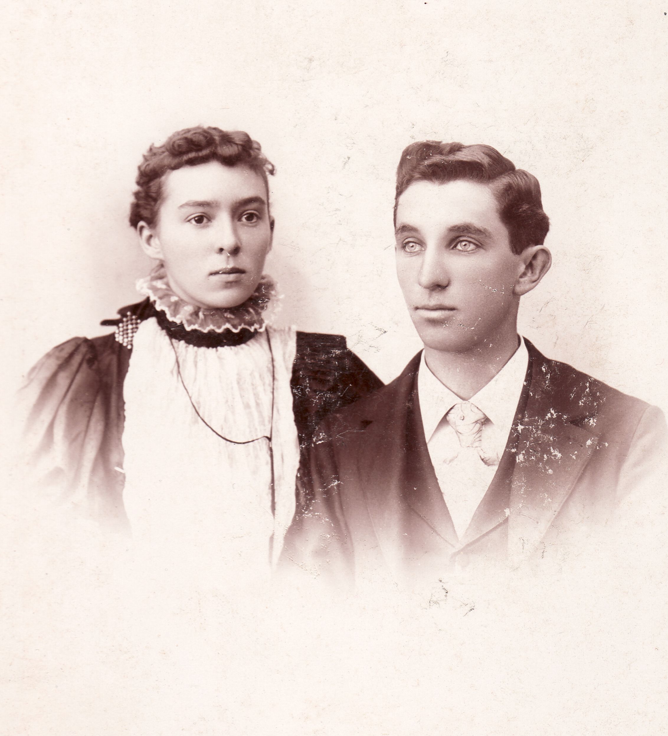 SOURCE CITATION: Mason-Scott Album, Photo 02 - Wellington Lawrence Funk [1873-1959] and his wife, Carrie (Carpenter) Funk [1879-1963]; circa 1897, image by Rogers, Waynesburg, Pa.; item no. CARP-AN001-0002, Sellers Burdette and Bettie (Blake) Carpenter Collection, shared by their heirs; Greene Connections Archives Project (GreeneConnections.com).