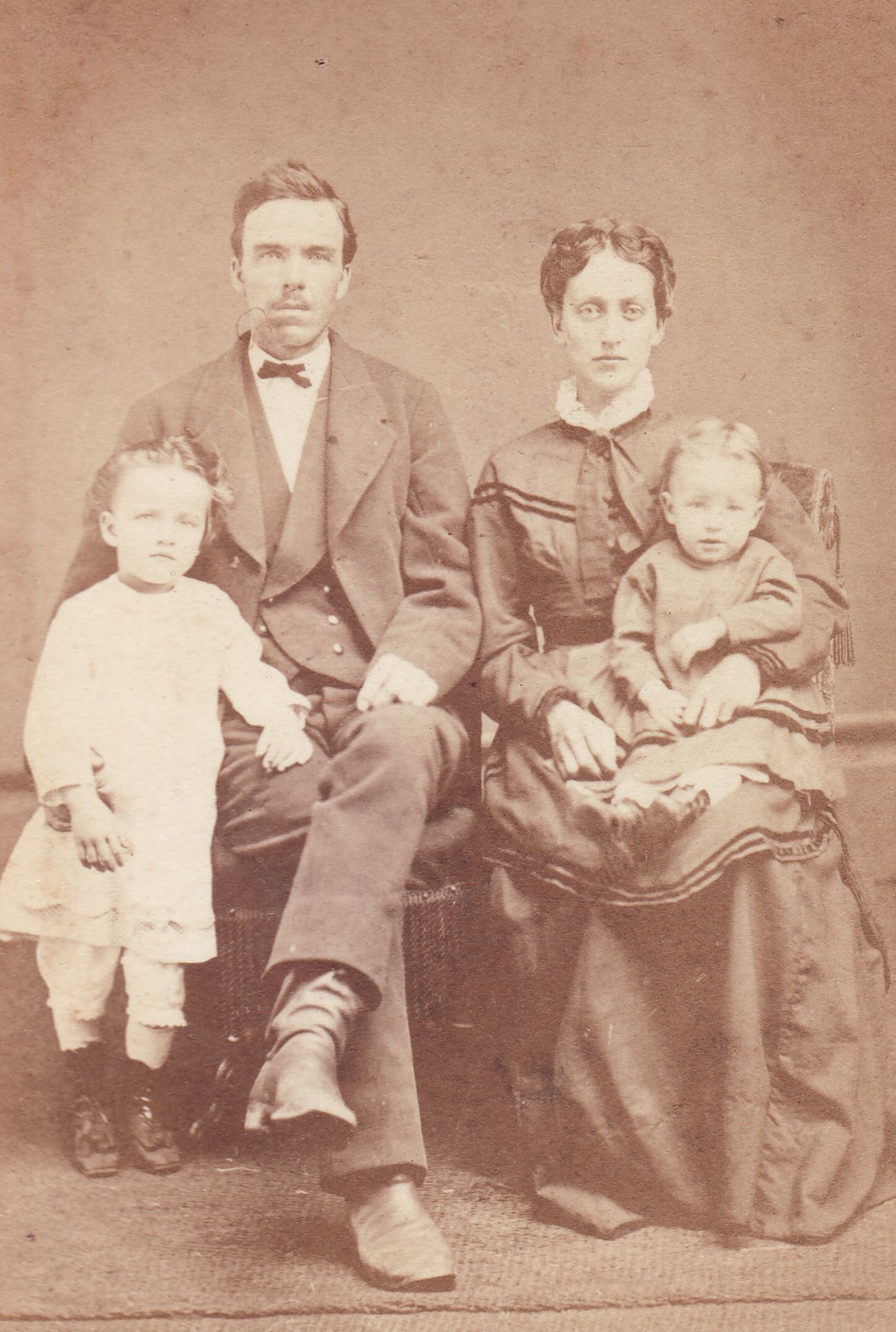 SOURCE CITATION: Mason-Scott Album, Photo 08 - Oliver Perry Scott [1847-1916] with his arm around his daughter, Ida Della (Scott) Grimes [1870-1911], next to his wife, Mary Jane (Grimes) Scott [1849-1928], holding her daughter, Violet Maria (Scott) Morris [1873-1958]; circa 1875, image by Rogers Brothers, Photographers, Opposite Public Square, Waynesburg, Pa.; item no. CARP-AN001-0008, Sellers Burdette and Bettie (Blake) Carpenter Collection, shared by their heirs; Greene Connections Archives Project (GreeneConnections.com).