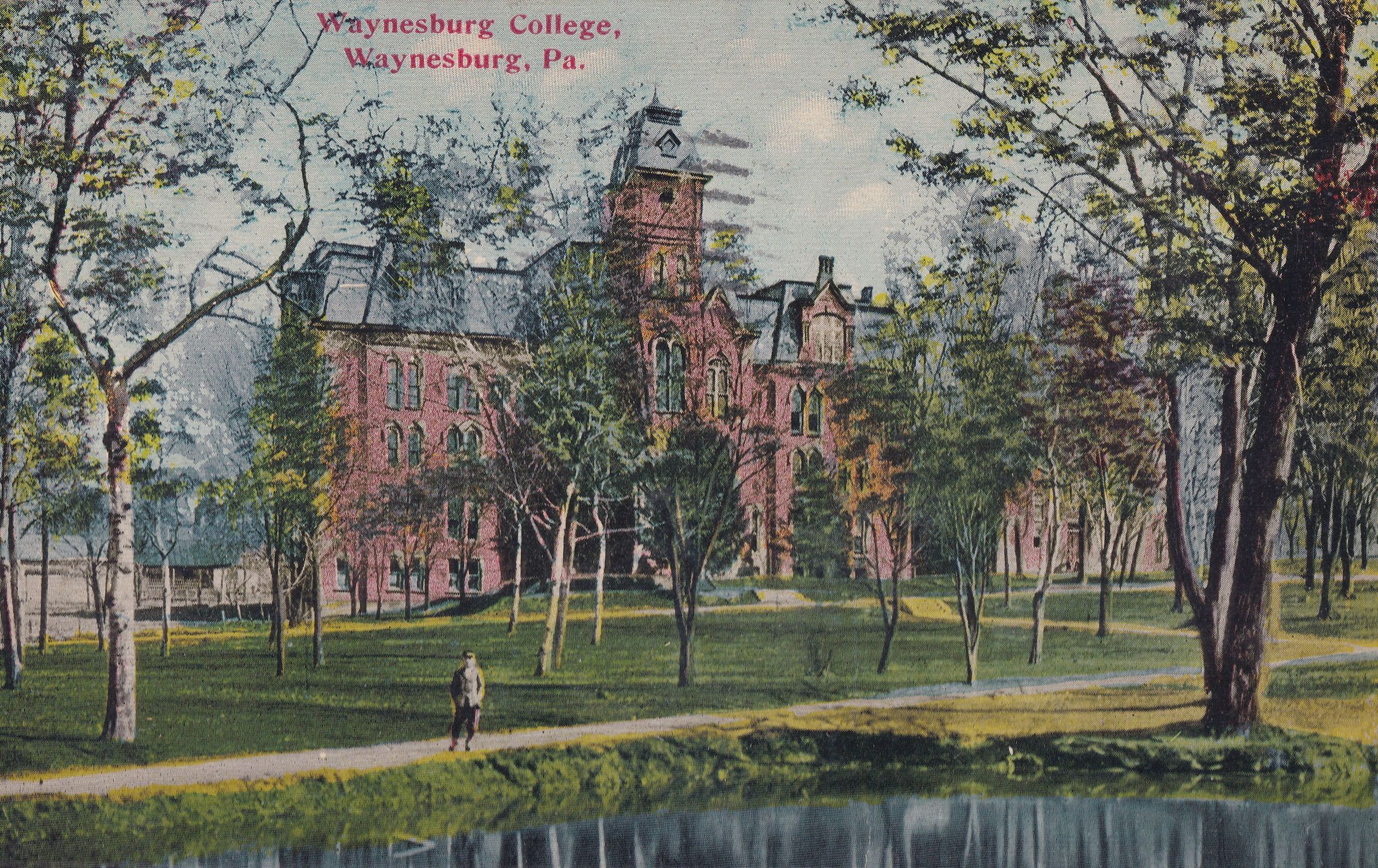 SOURCE CITATION: Miller Hall, on the Waynesburg College campus, and College Park in Waynesburg, Greene County, Pennsylvania; circa 1910; item no. MILB-AN001-0005-0014, Mary (Vance) McCann Collection, shared by her grandson, William Marshall Miller; Greene Connections Archives Project (GreeneConnections.com).