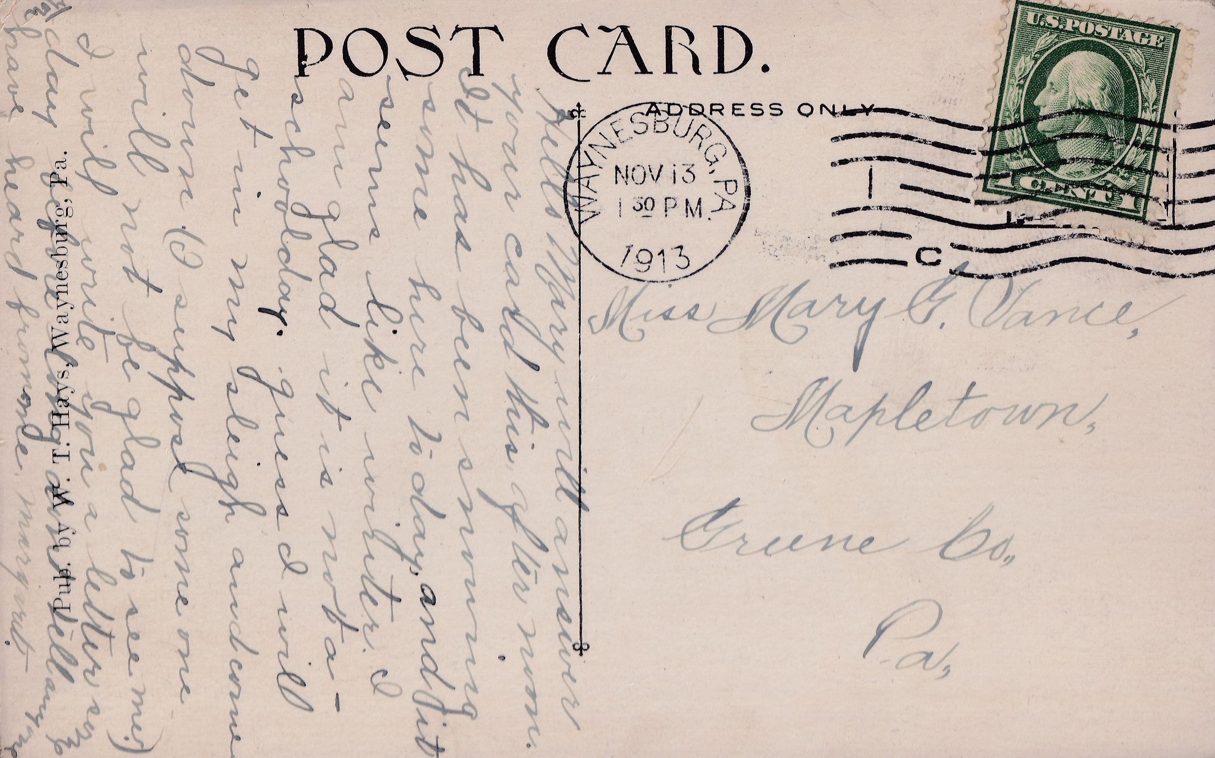 The Mary (Vance) McCann Collection was passed from George Birch Vance [1870-1928] and Jessie Dell (McFarland) Vance [1868-1935] with the ownership of their home in Mapletown, Monongahela Township, Greene County, Pennsylvania, to their daughter, Mary (Vance) McCann [1898-1987], and her husband, Marshall Albert McCann [1895-1956]. Mary (Vance) McCann left the collection to her grandson, William Marshall Miller, who owned and shared the collection with the Greene Connections: Greene County, Pennsylvania Archives Project in 2023.