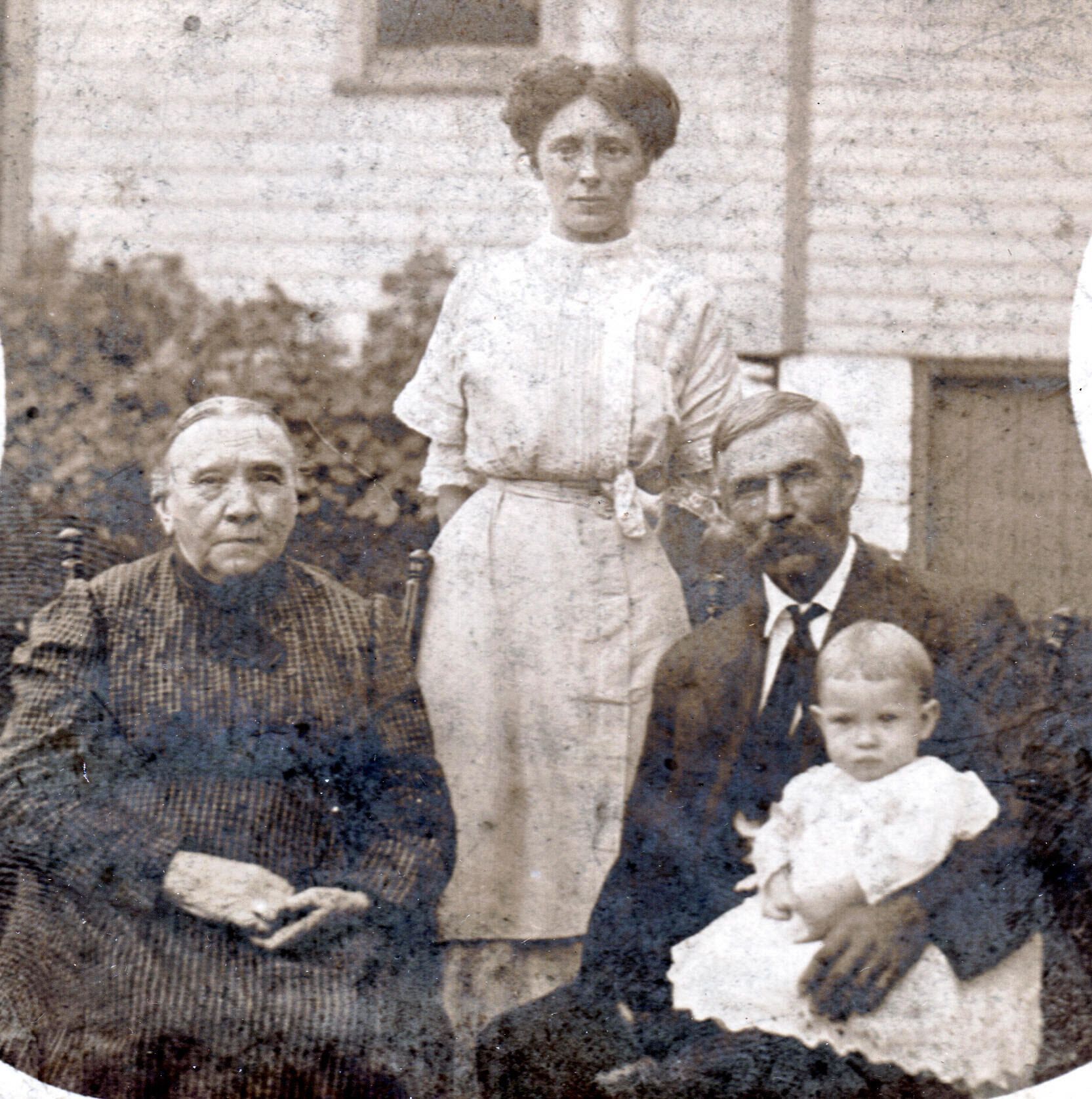 Four generations of the Millikin family, pictured [Left-Right]: Rebecca Ann (Simpson) Millikin [1835-1914], Cora Mabel (Millikin) Mitchell, John Wesley Millikin [1855-1945] holding Carl Mitchell.Collection