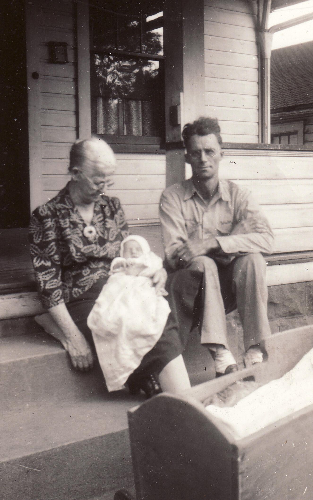 Dated 27 June 1945. Minerva Elizabeth "Lib" (Supler) Ruth [1866-1947] holding her great-grandniece Wilda Virginia "Ginny" Swart [1945-2015], seated beside Ginny's father, Walter Howard Swart [1903-1945].