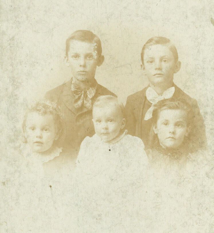 Caption reads, "(back row lt to rt) Harry Baily, Will Baily (front row lt to rt) Howard Baily, Richard Baily, Edna Baily Pollock – Children of J. Ewing Baily & Dora M. Baily (brothers & sister of Kenneth & Karl Baily)."