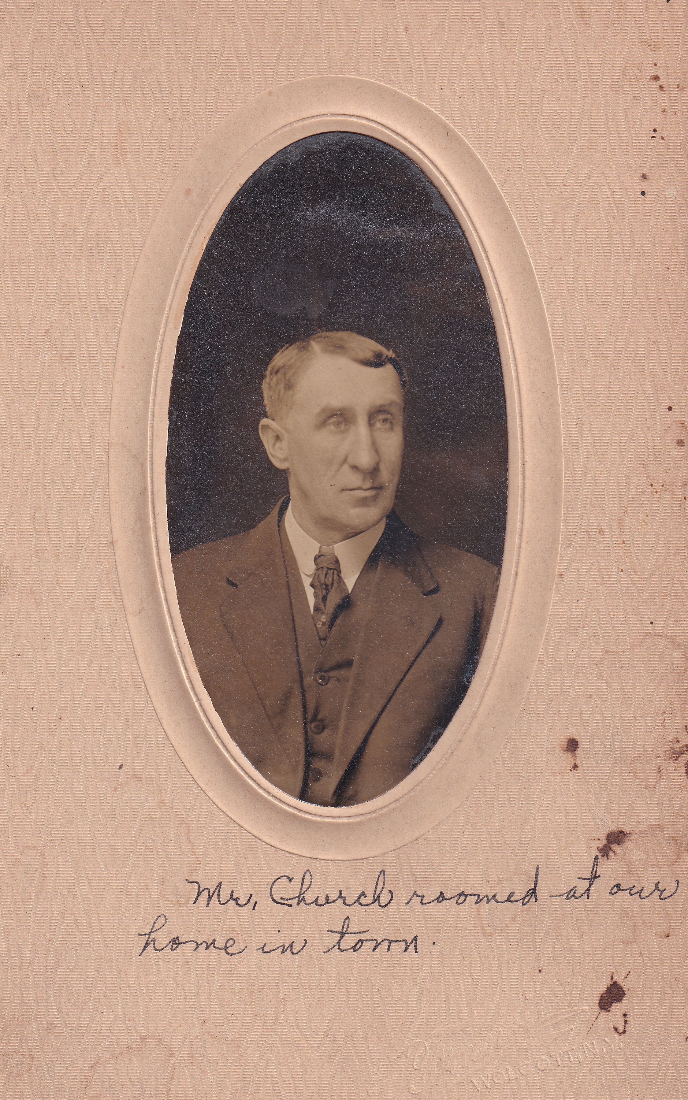 SOURCE CITATION: Caption on front of image reads, "Mr. Church roomed at our home in town"; circa 1900-1920; item no. RICL-AN003-0024, Miscellaneous Series, Rices Landing Lock and Dam No. 6 Museum Collection, Greene Connections Archives Project (www.GreeneConnections.com).