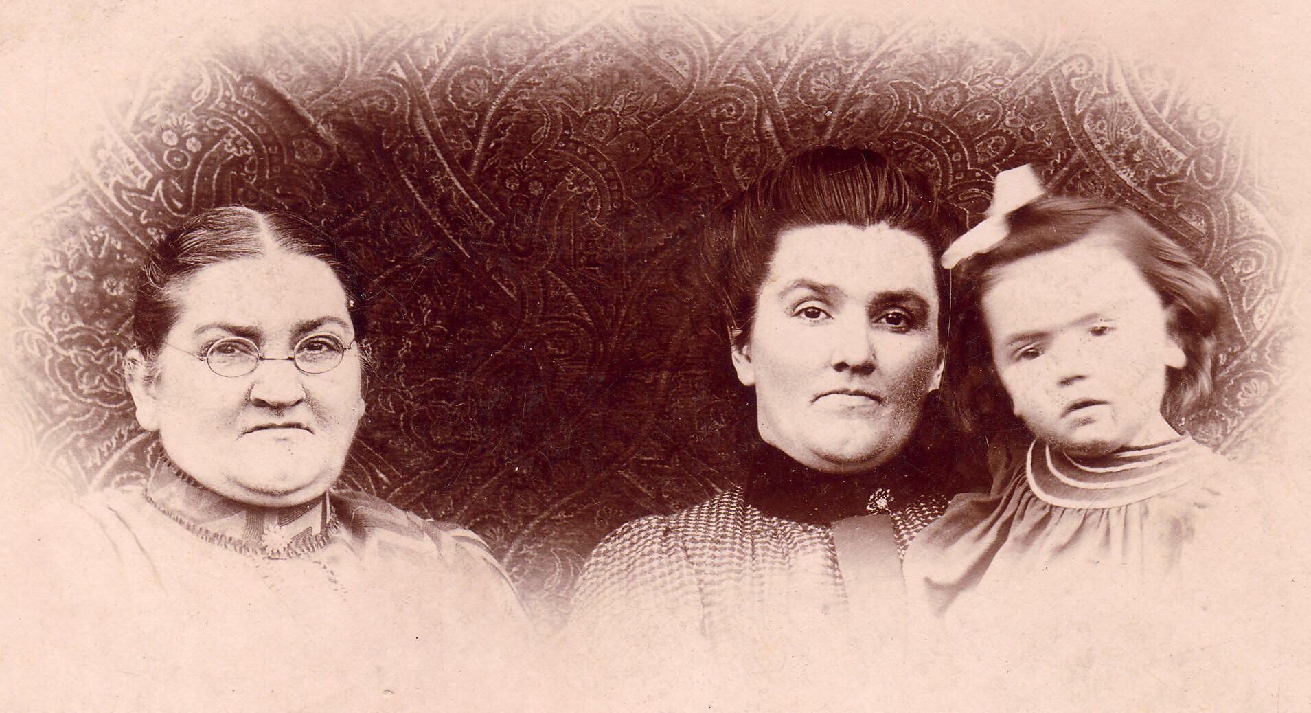 Source Citation: [Left-Right]: Isabelle (Rush) Myers [1848-1905], Naomi Dorcas (Myers) Lantz [1868-1939], Cecil Alice (Lantz) Dudley [1890-1970], item no. CGSP_AN003_0049, Lynn Myers Crayne Series, Cornerstone Genealogical Society Collection, Greene Connections Archives Project (www.GreeneConnections.com).