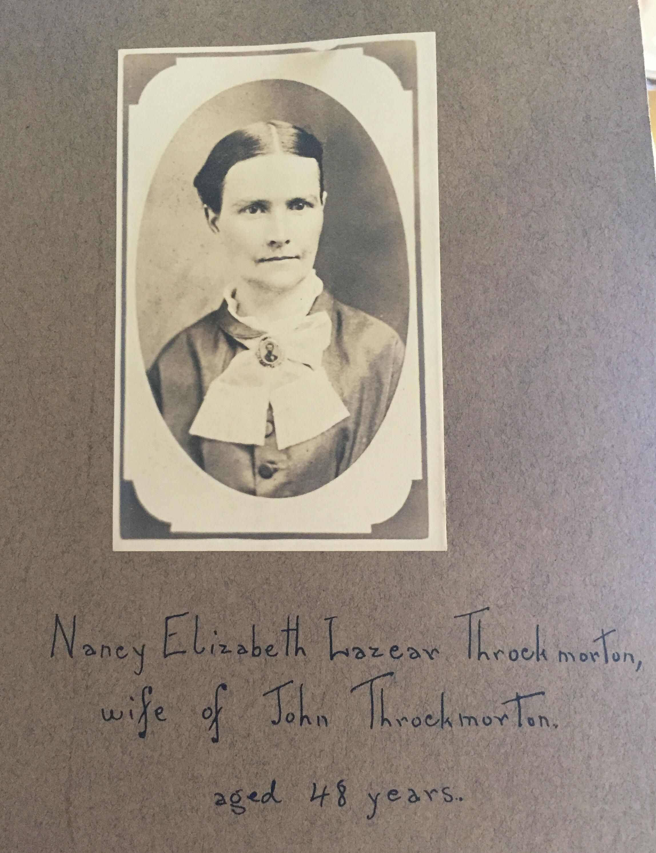 Source Citation: Nancy Elizabeth (Lazear) Throckmorton [1828-1906], item no. THRJ-AN001-0005, Throckmorton-Bentley Genealogy Series, Dr. Jeannette Franc Throckmorton Collection, Greene Connections Archives Project (www.GreeneConnections.com).