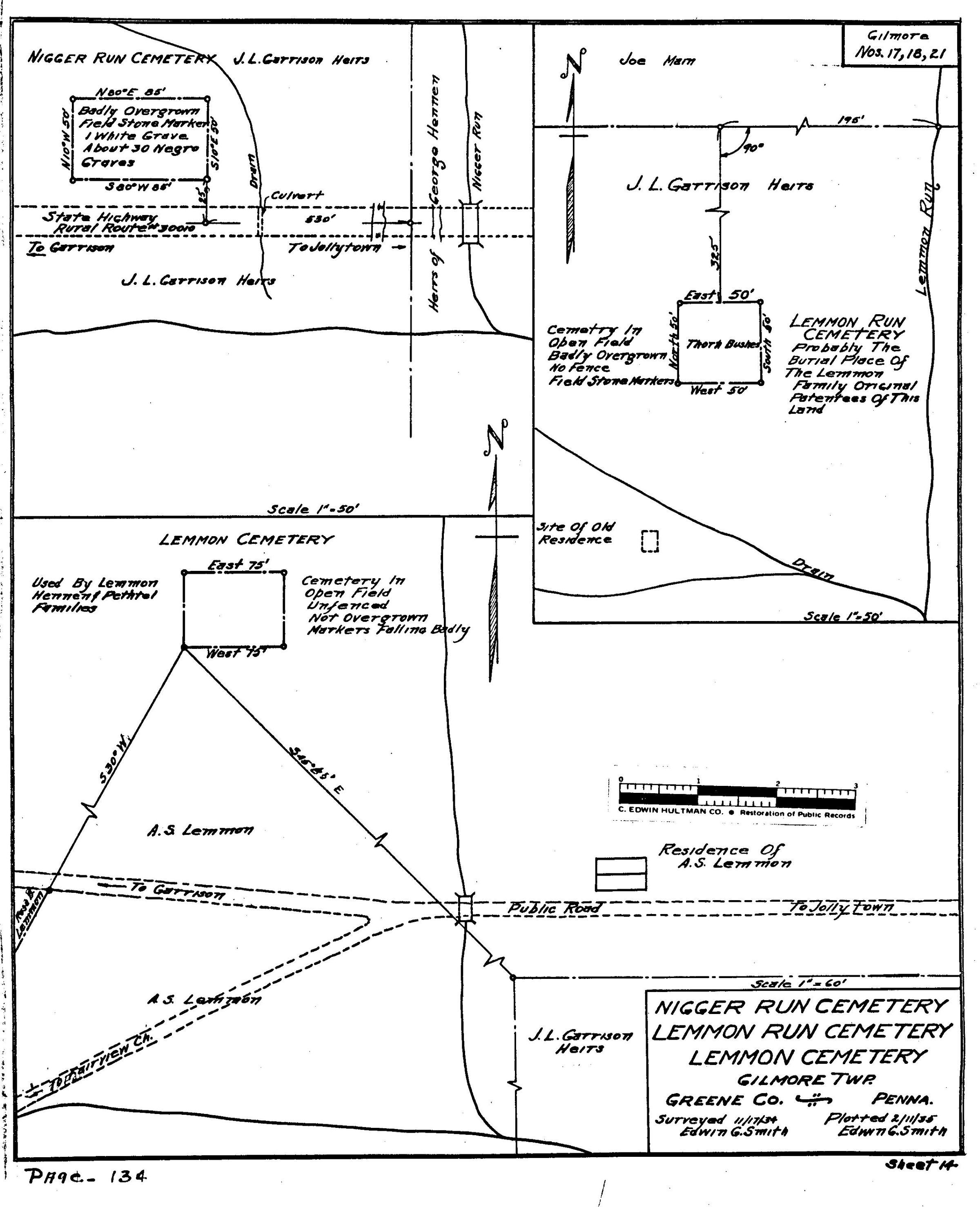 SOURCE CITATION: WPA Cemetery Plat - Pennsylvania - Greene County - Gilmore Township - Negro Run Cemetery (1934), item no. 2016.3.204, Cemetery Plat (WPA) Collection, surveyed by Works Projects Administration, copy on file at the Clerk of Courts Office, Greene County Courthouse, Greene Connections Archives Project (GreeneConnections.com).